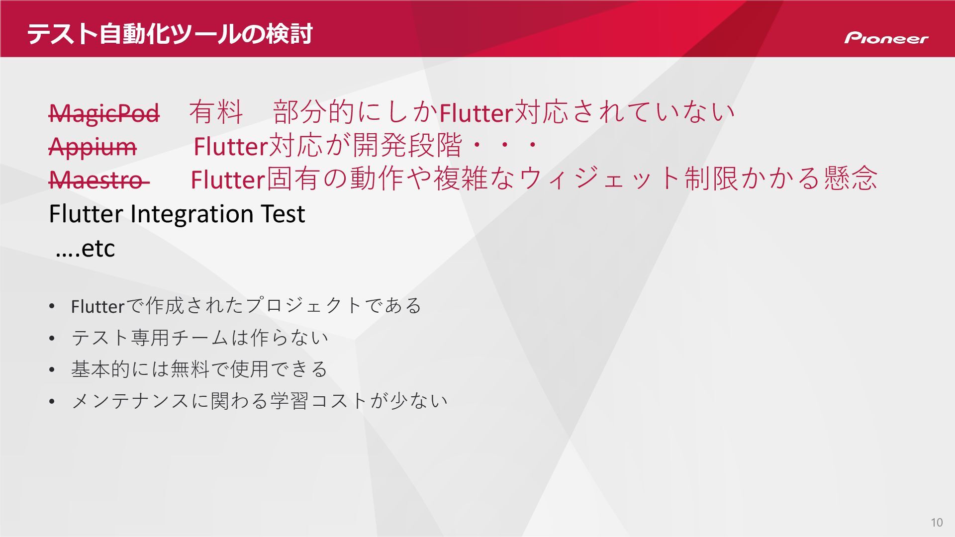 9 テスト⾃動化ツールの検討 MagicPod 有料 部分的にしかFlutter対応されていない Appium Flutter対応が開発段階・・・ Maestro Flutter Integration