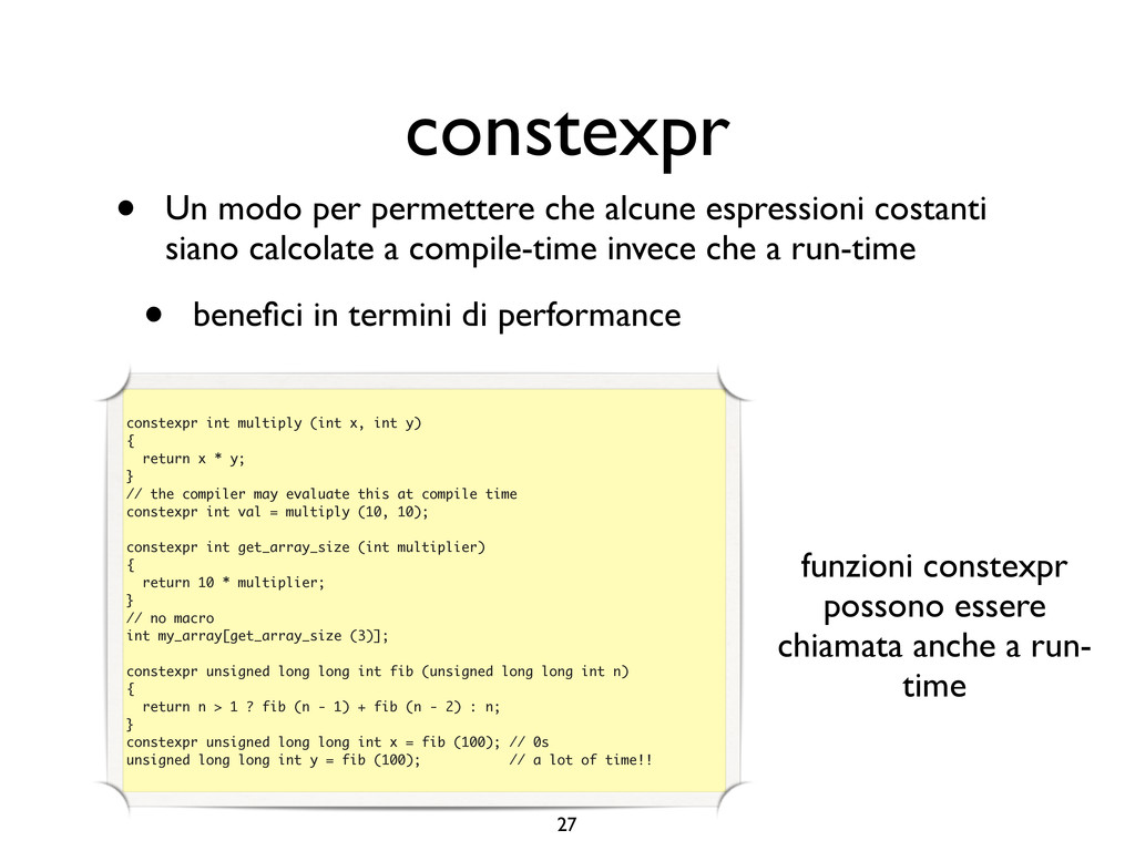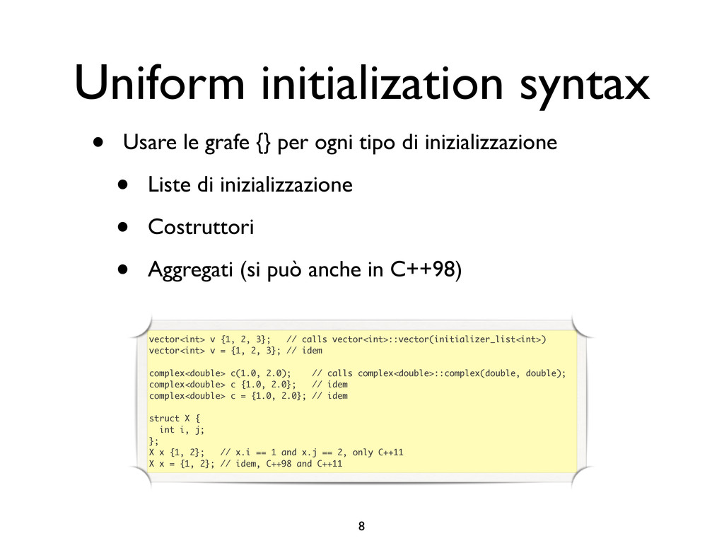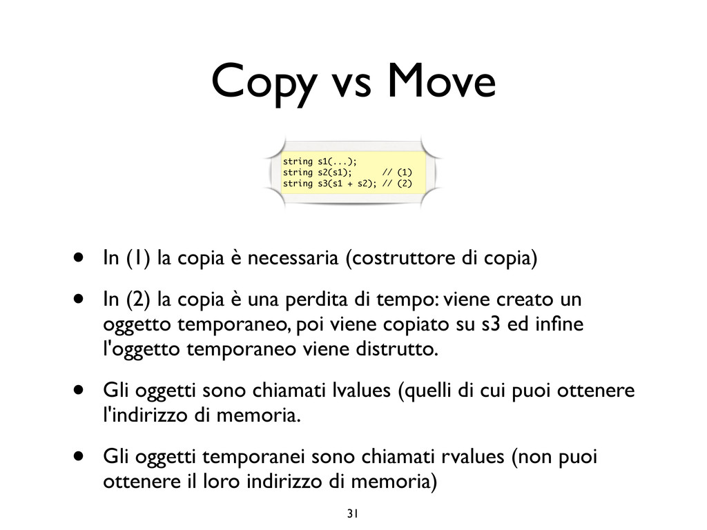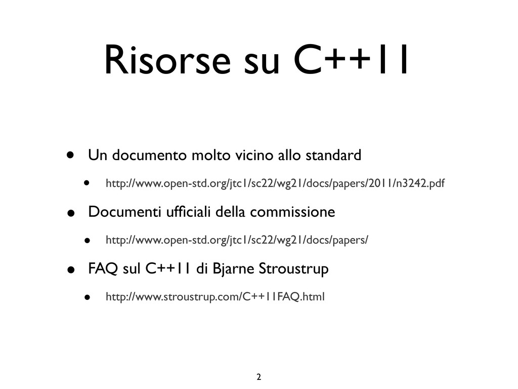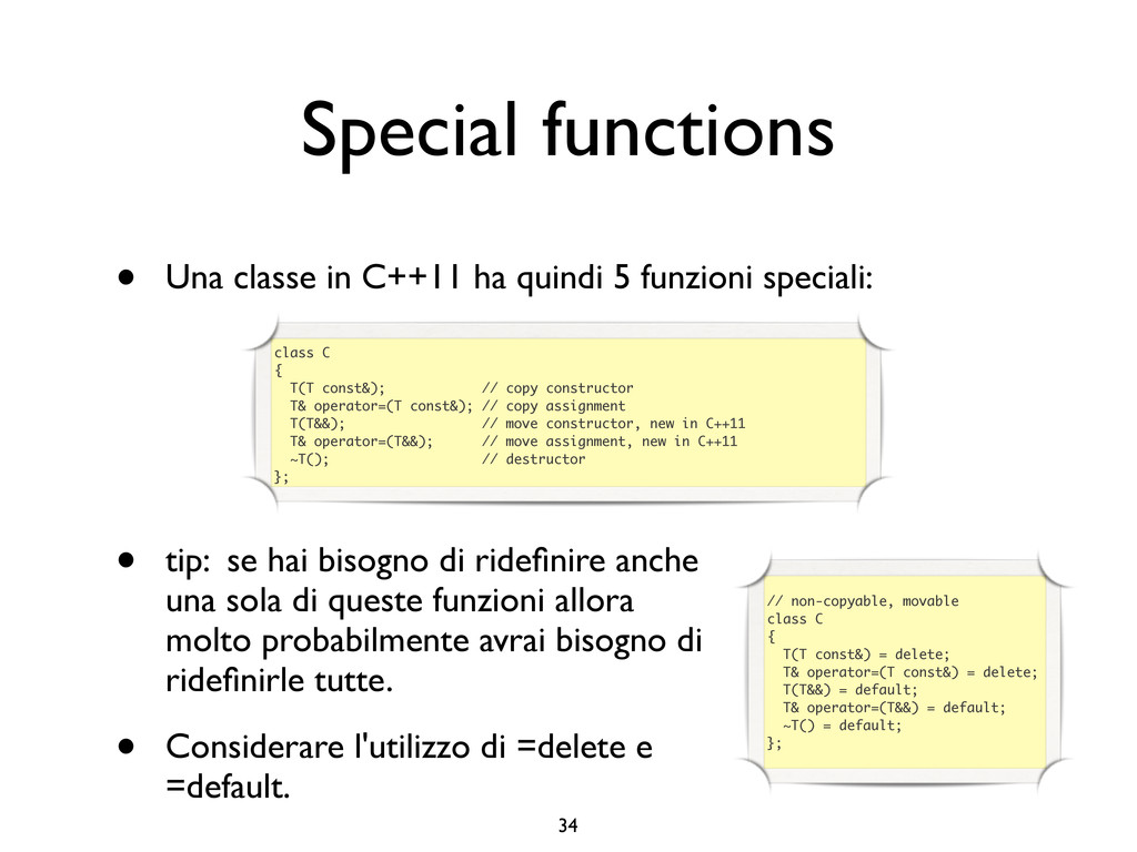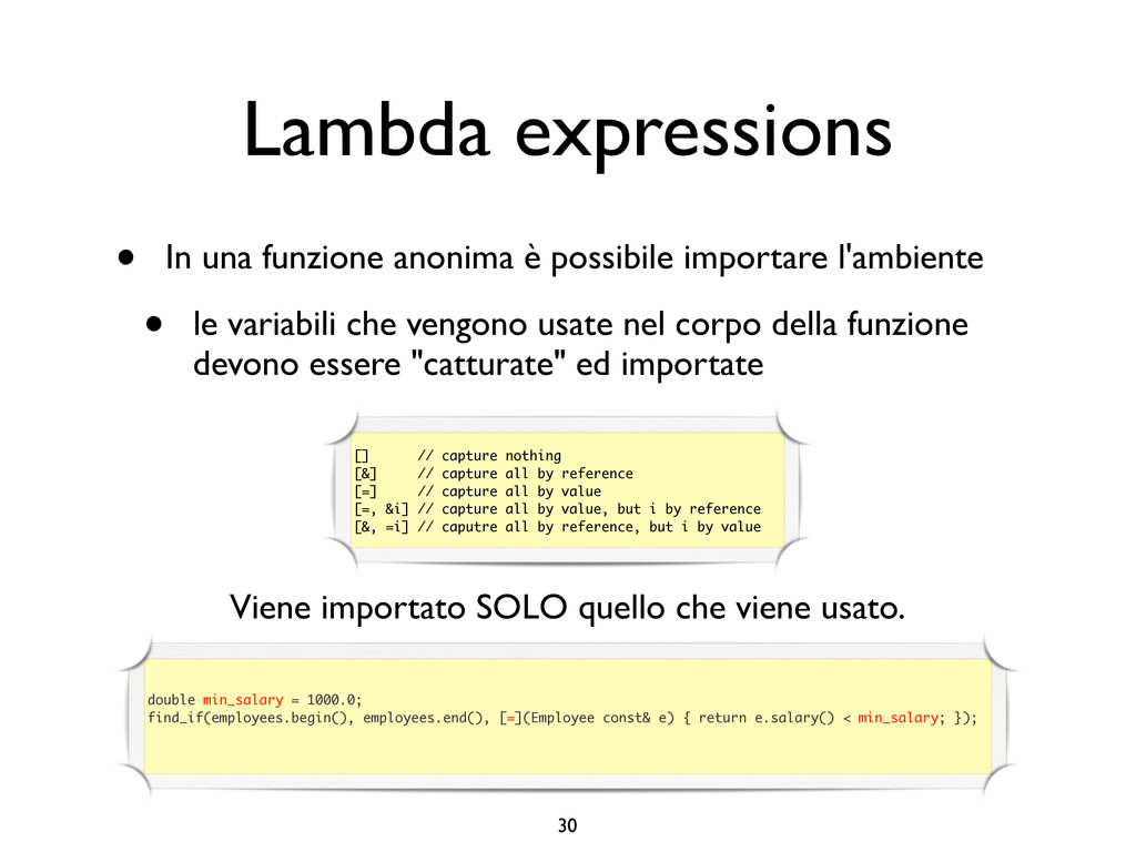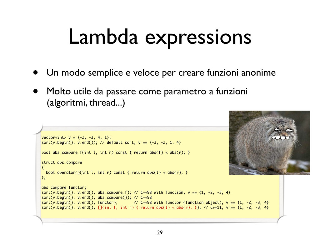 creare funzioni anonime • Molto utile da passare come parametro a funzioni (algoritmi, thread...) vector<int> v = {-2, -3, 4, 1}; sort(v.begin(), v.end()); // default sort, v == {-3, -2, 1, 4} bool abs_compare_f(int l, int r) const { return abs(l) < abs(r); } struct abs_compare { bool operator()(int l, int r) const { return abs(l) < abs(r); } }; abs_compare functor; sort(v.begin(), v.end(), abs_compare_f); // C++98 with function, v == {1, -2, -3, 4} sort(v.begin(), v.end(), abs_compare()); // C++98 sort(v.begin(), v.end(), functor); // C++98 with functor (function object), v == {1, -2, -3, 4} sort(v.begin(), v.end(), [](int l, int r) { return abs(l) < abs(r); }); // C++11, v == {1, -2, -3, 4}