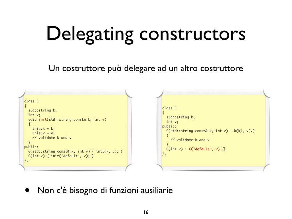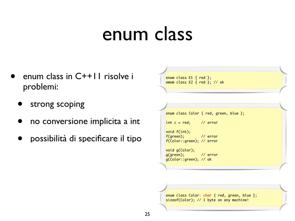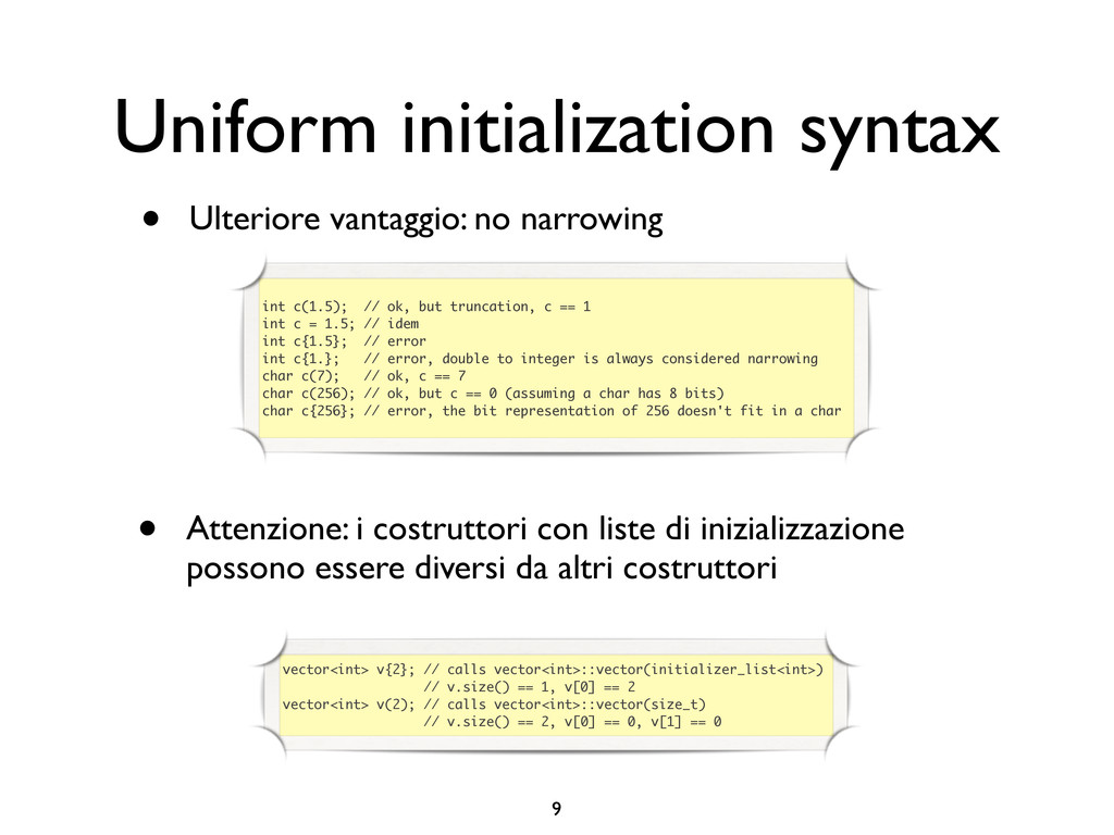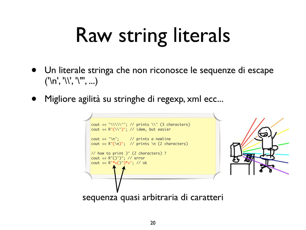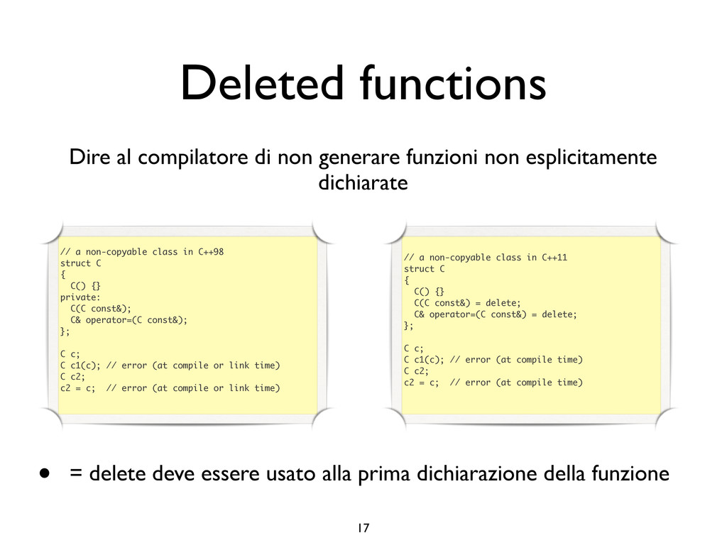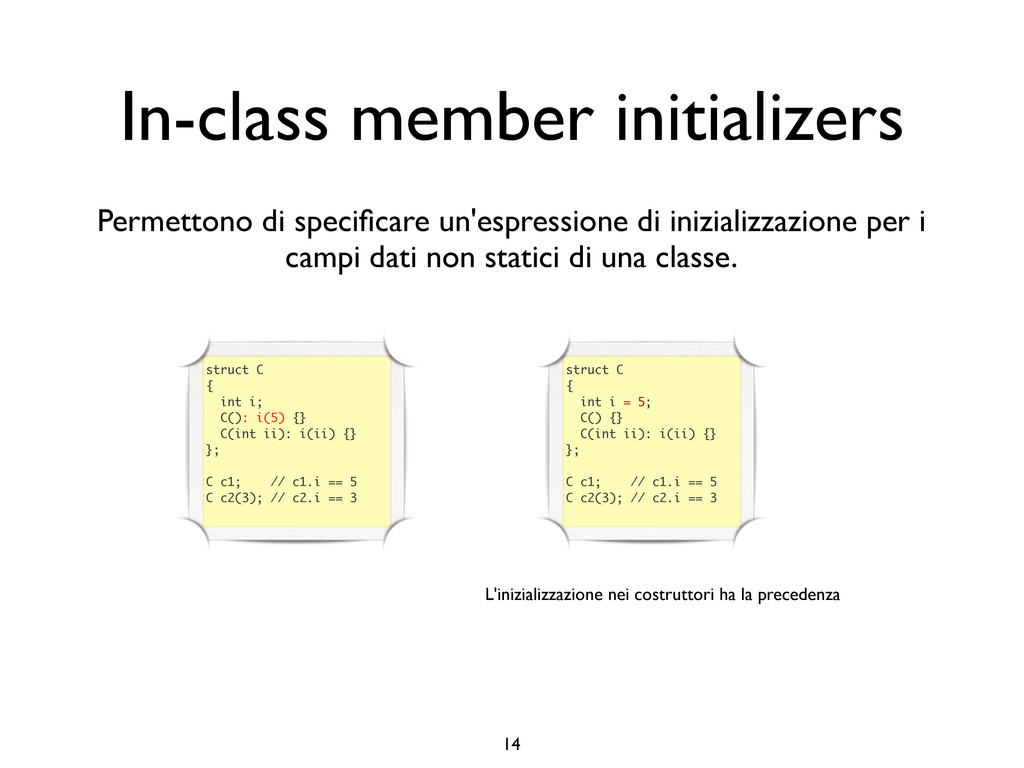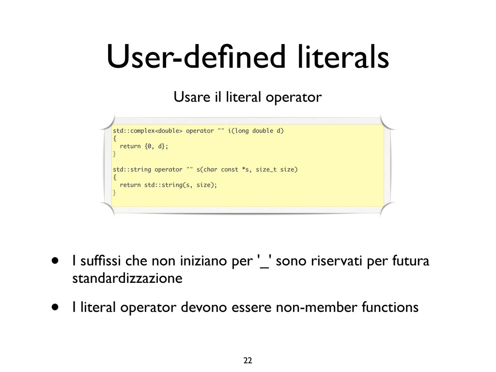 creare funzioni anonime • Molto utile da passare come parametro a funzioni (algoritmi, thread...) vector<int> v = {-2, -3, 4, 1}; sort(v.begin(), v.end()); // default sort, v == {-3, -2, 1, 4} bool abs_compare_f(int l, int r) const { return abs(l) < abs(r); } struct abs_compare { bool operator()(int l, int r) const { return abs(l) < abs(r); } }; abs_compare functor; sort(v.begin(), v.end(), abs_compare_f); // C++98 with function, v == {1, -2, -3, 4} sort(v.begin(), v.end(), abs_compare()); // C++98 sort(v.begin(), v.end(), functor); // C++98 with functor (function object), v == {1, -2, -3, 4} sort(v.begin(), v.end(), [](int l, int r) { return abs(l) < abs(r); }); // C++11, v == {1, -2, -3, 4}