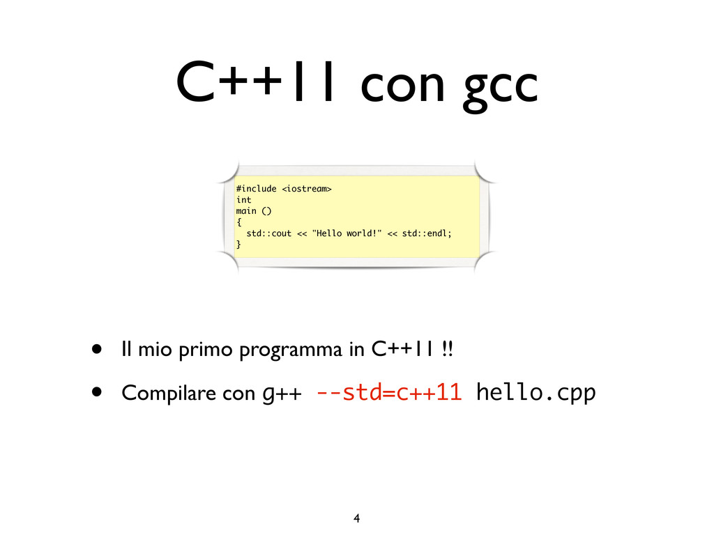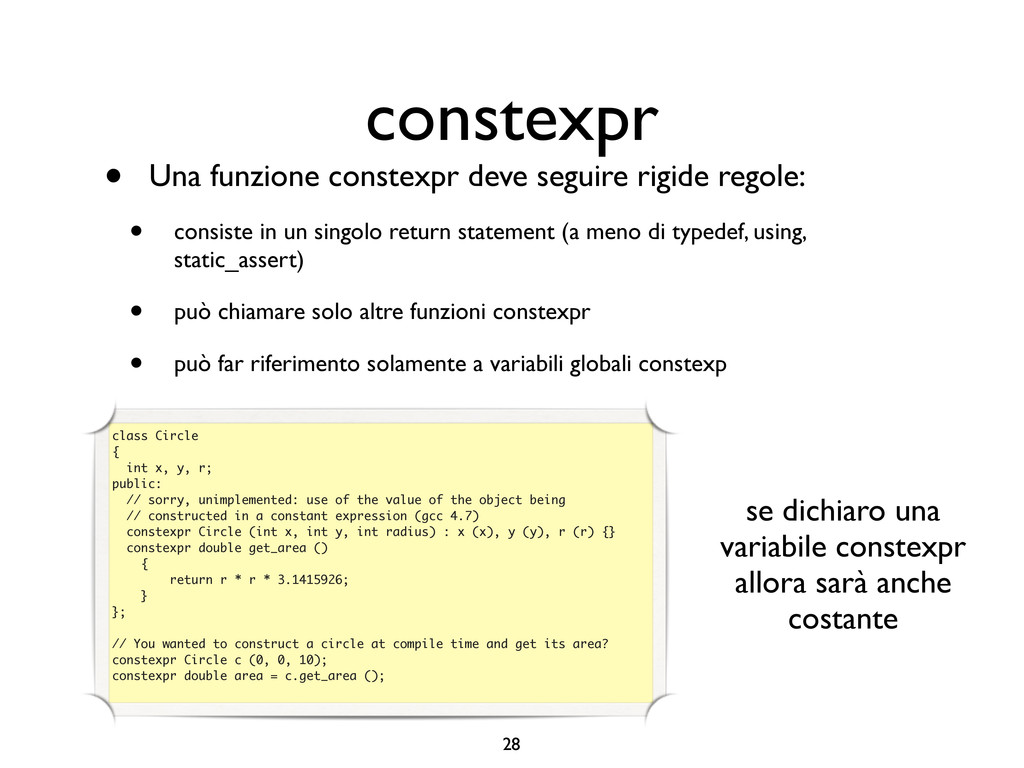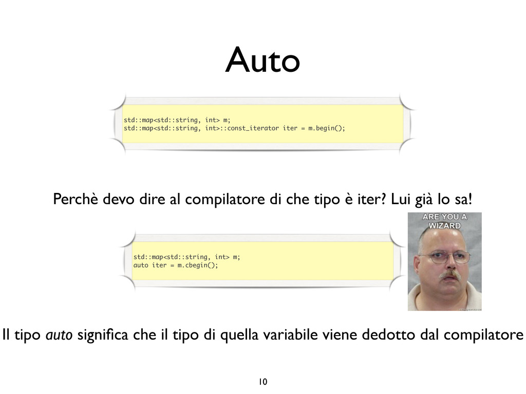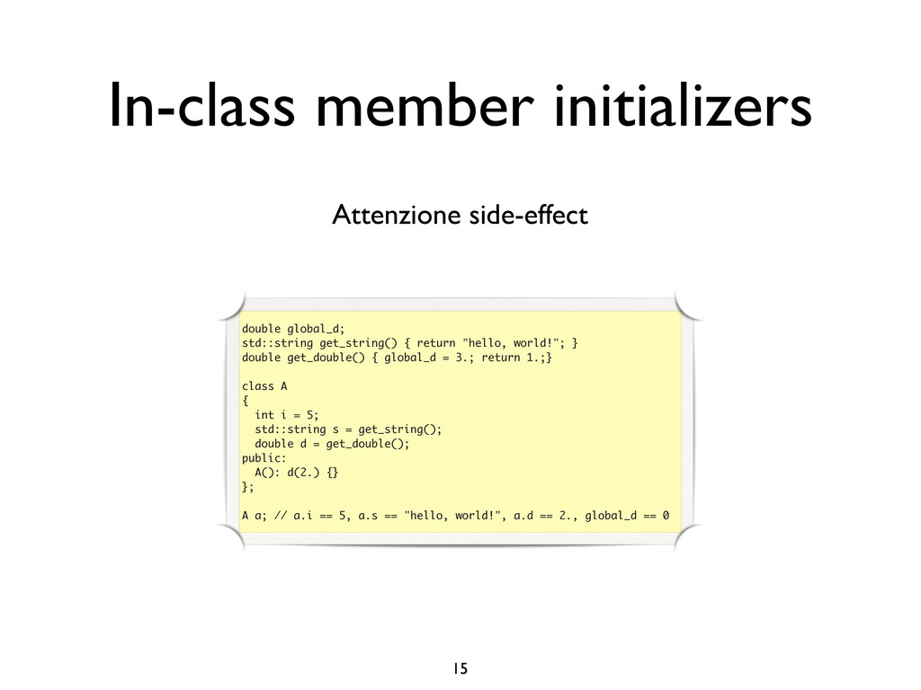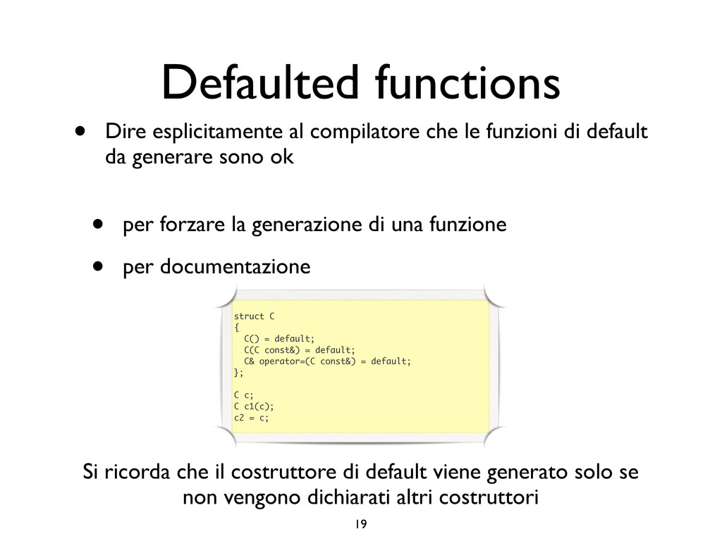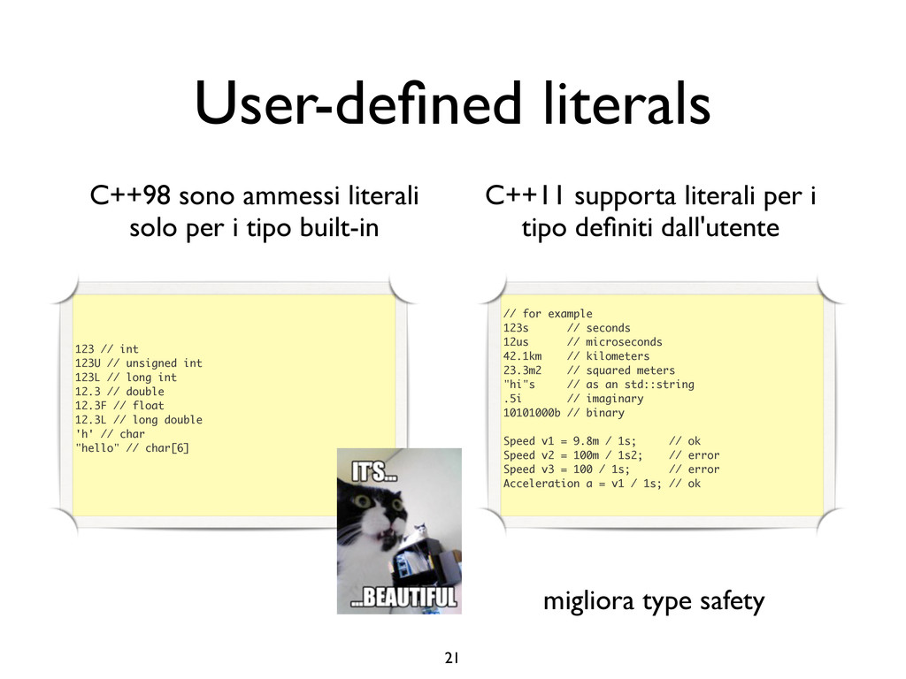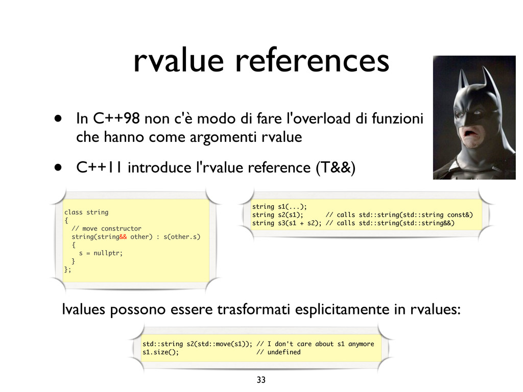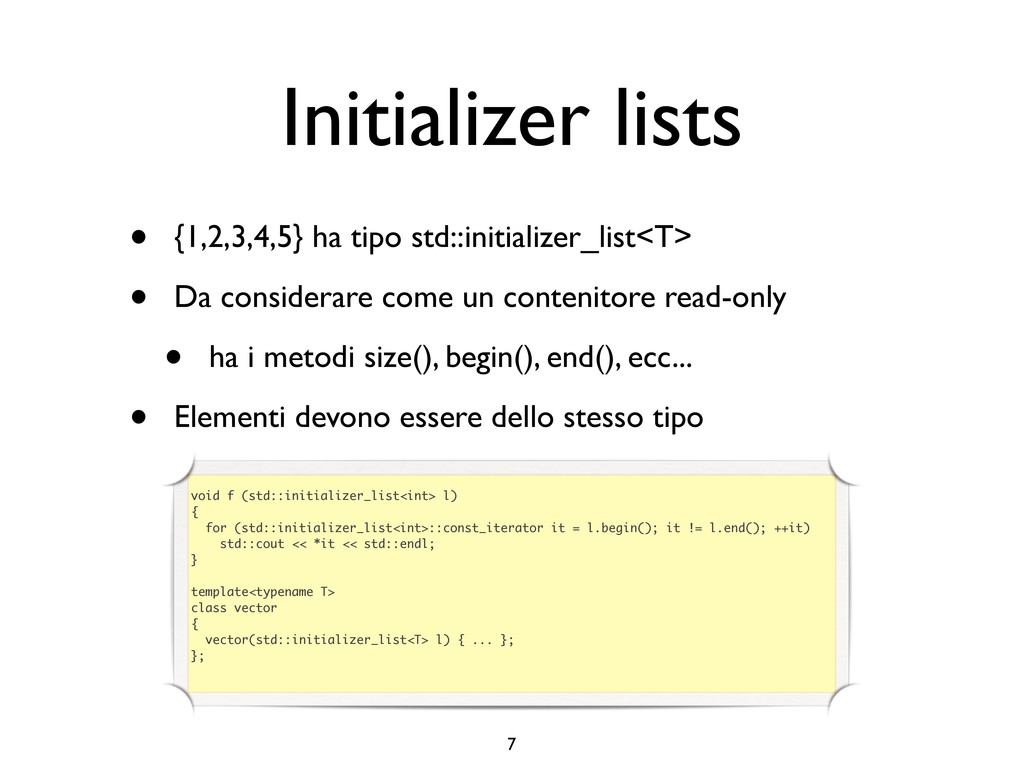 creare funzioni anonime • Molto utile da passare come parametro a funzioni (algoritmi, thread...) vector<int> v = {-2, -3, 4, 1}; sort(v.begin(), v.end()); // default sort, v == {-3, -2, 1, 4} bool abs_compare_f(int l, int r) const { return abs(l) < abs(r); } struct abs_compare { bool operator()(int l, int r) const { return abs(l) < abs(r); } }; abs_compare functor; sort(v.begin(), v.end(), abs_compare_f); // C++98 with function, v == {1, -2, -3, 4} sort(v.begin(), v.end(), abs_compare()); // C++98 sort(v.begin(), v.end(), functor); // C++98 with functor (function object), v == {1, -2, -3, 4} sort(v.begin(), v.end(), [](int l, int r) { return abs(l) < abs(r); }); // C++11, v == {1, -2, -3, 4}