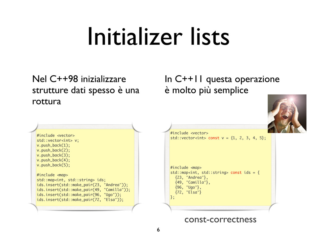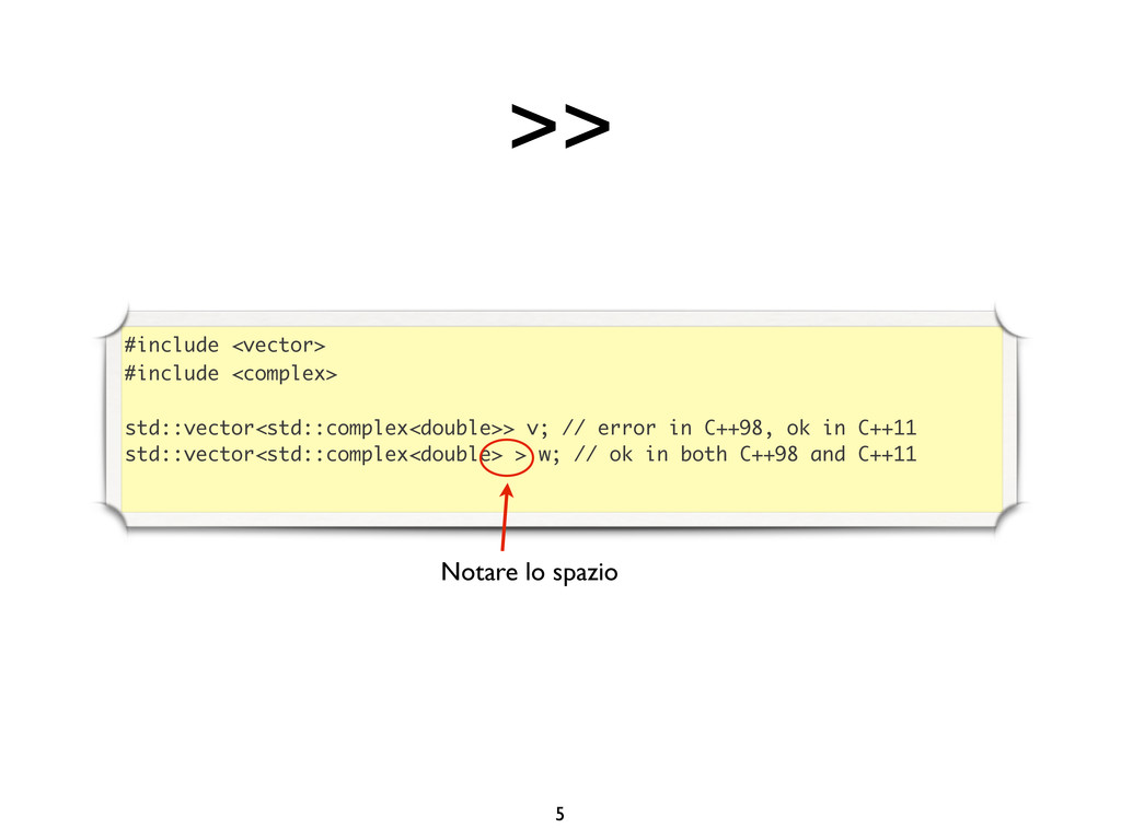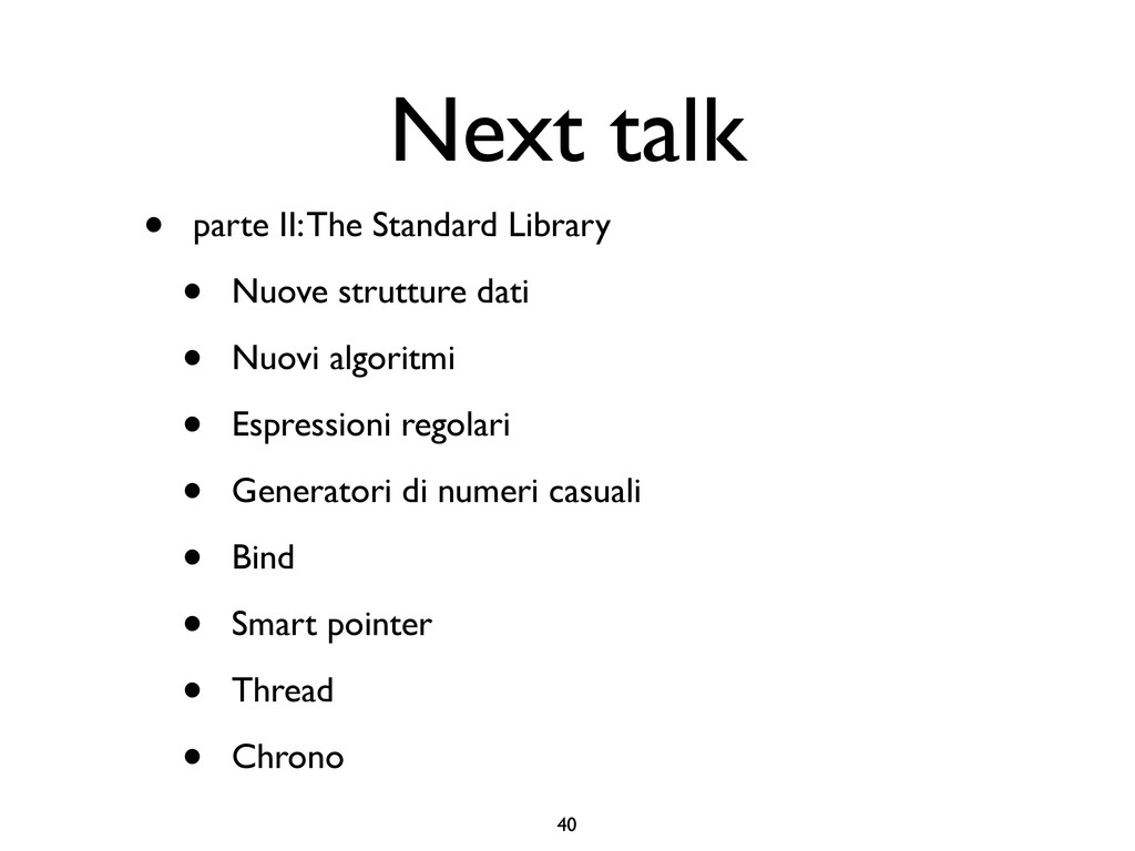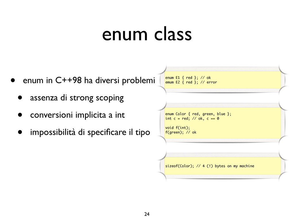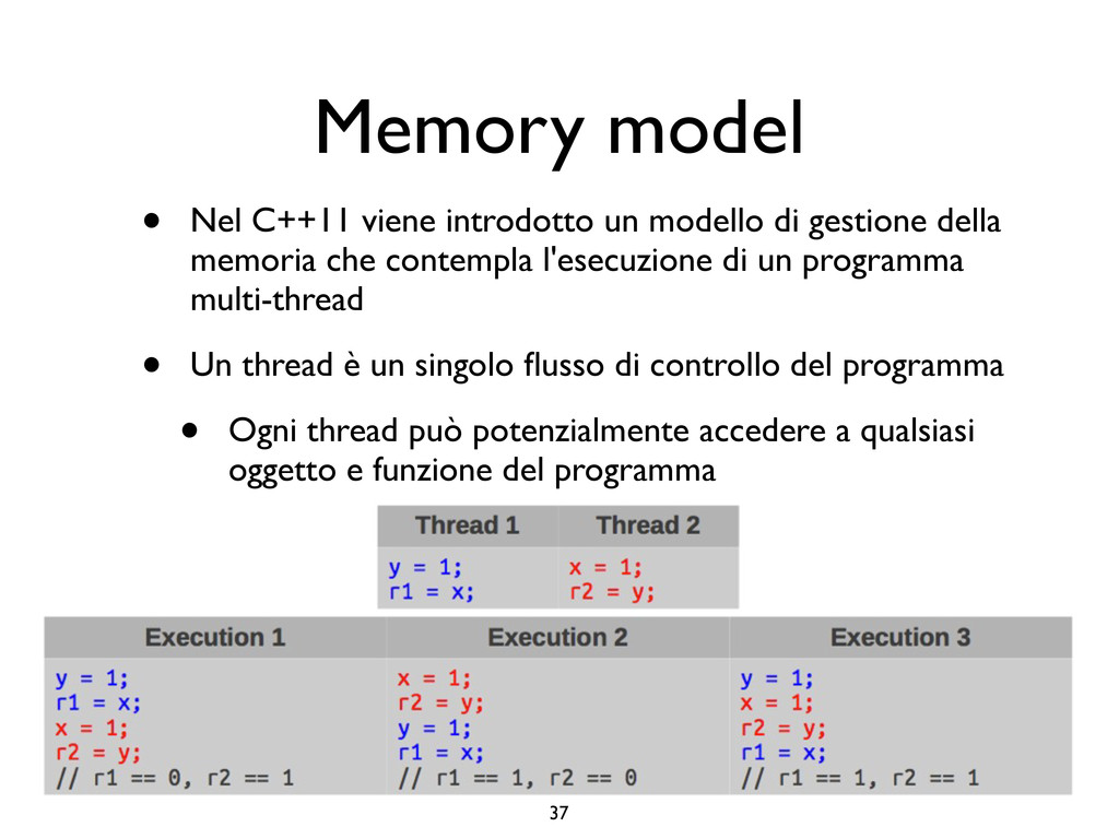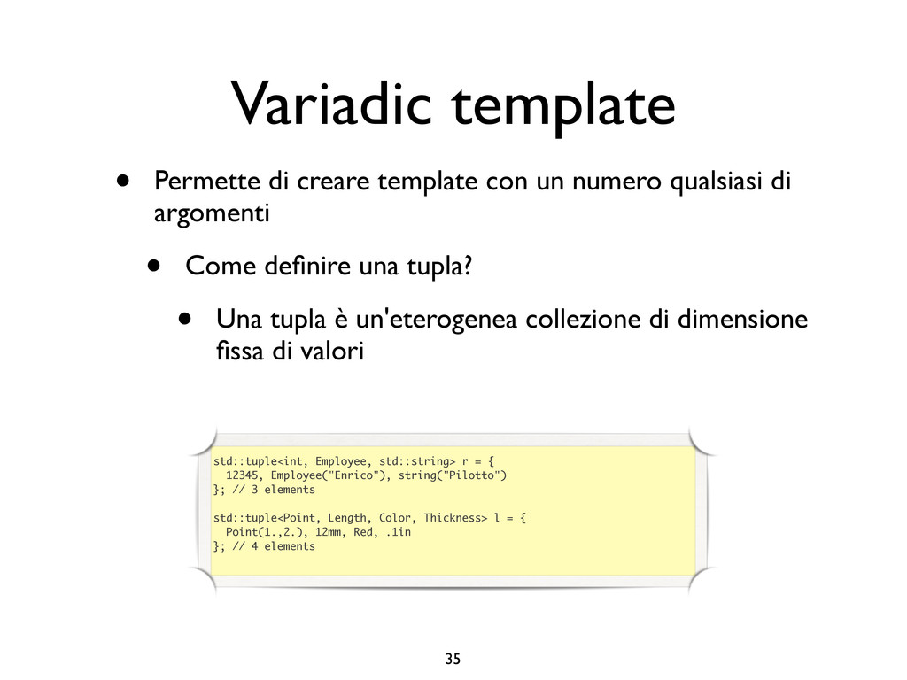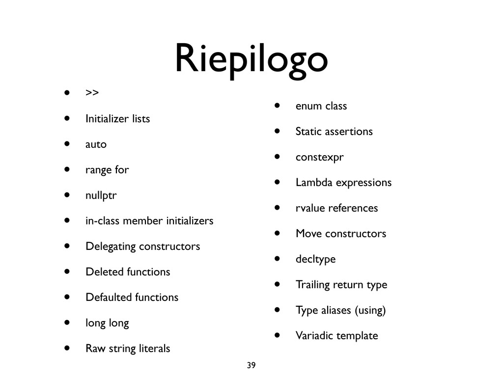 creare funzioni anonime • Molto utile da passare come parametro a funzioni (algoritmi, thread...) vector<int> v = {-2, -3, 4, 1}; sort(v.begin(), v.end()); // default sort, v == {-3, -2, 1, 4} bool abs_compare_f(int l, int r) const { return abs(l) < abs(r); } struct abs_compare { bool operator()(int l, int r) const { return abs(l) < abs(r); } }; abs_compare functor; sort(v.begin(), v.end(), abs_compare_f); // C++98 with function, v == {1, -2, -3, 4} sort(v.begin(), v.end(), abs_compare()); // C++98 sort(v.begin(), v.end(), functor); // C++98 with functor (function object), v == {1, -2, -3, 4} sort(v.begin(), v.end(), [](int l, int r) { return abs(l) < abs(r); }); // C++11, v == {1, -2, -3, 4}