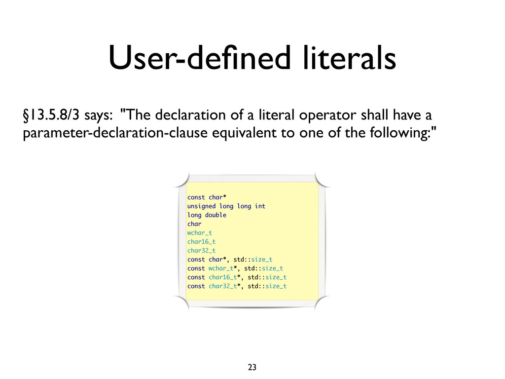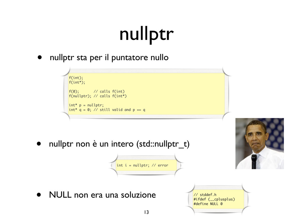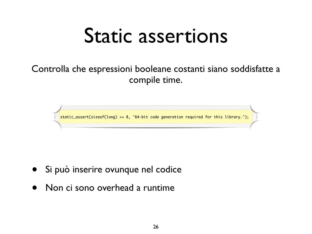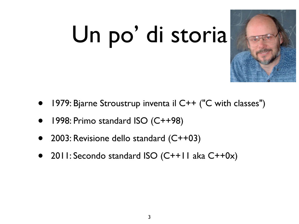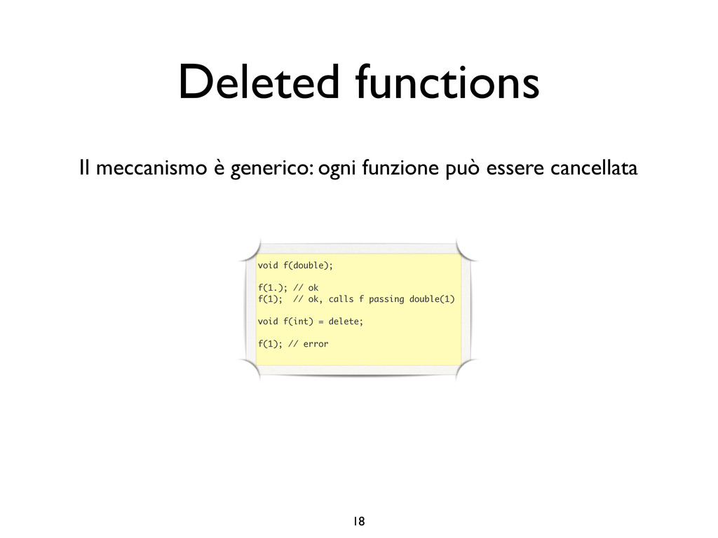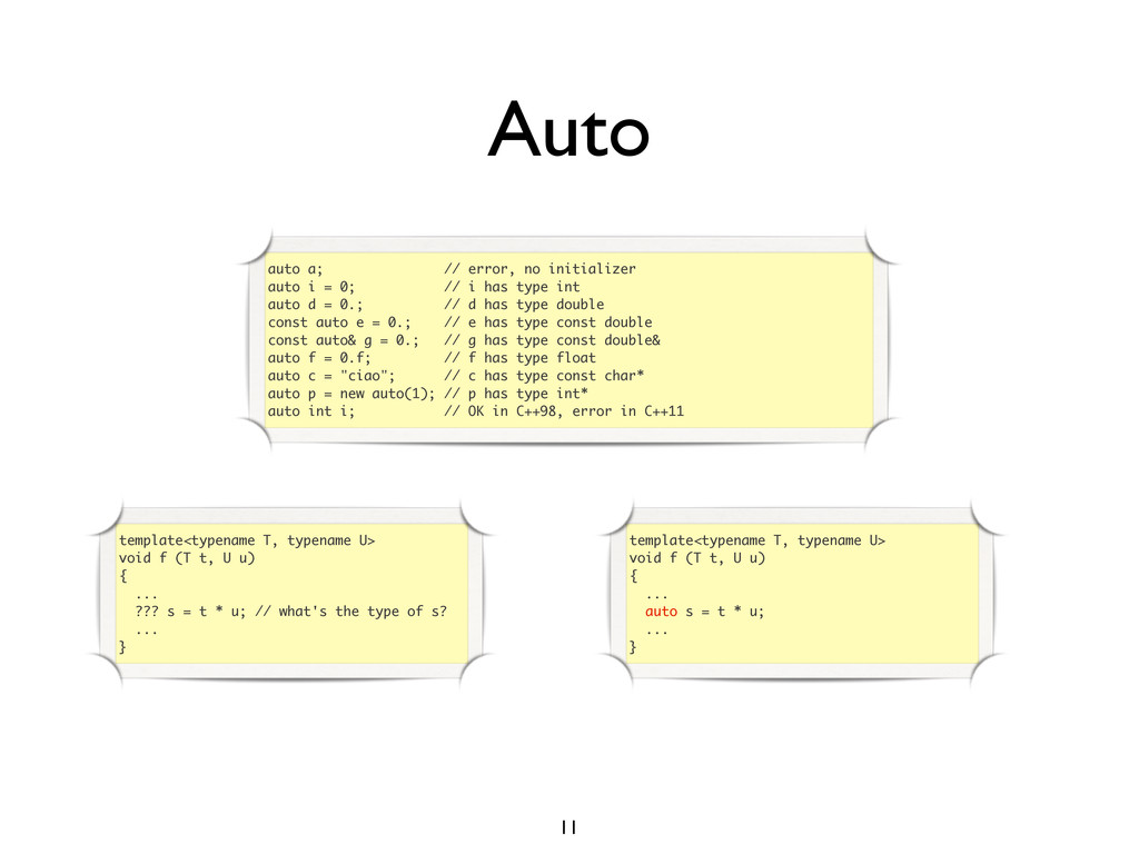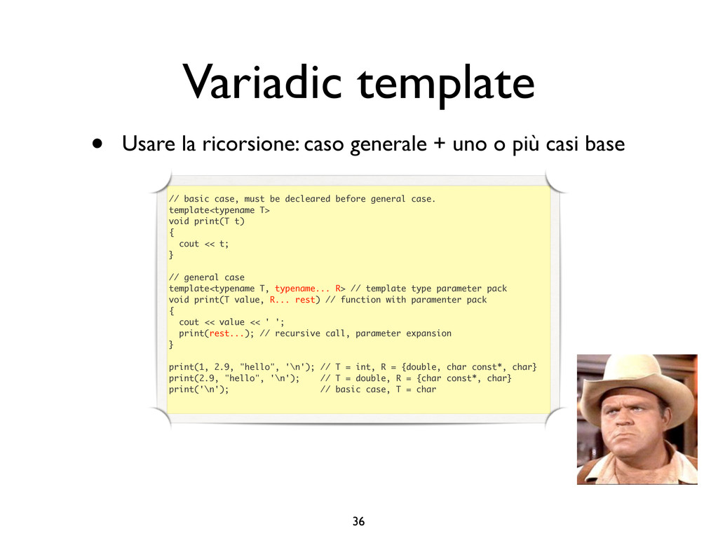 creare funzioni anonime • Molto utile da passare come parametro a funzioni (algoritmi, thread...) vector<int> v = {-2, -3, 4, 1}; sort(v.begin(), v.end()); // default sort, v == {-3, -2, 1, 4} bool abs_compare_f(int l, int r) const { return abs(l) < abs(r); } struct abs_compare { bool operator()(int l, int r) const { return abs(l) < abs(r); } }; abs_compare functor; sort(v.begin(), v.end(), abs_compare_f); // C++98 with function, v == {1, -2, -3, 4} sort(v.begin(), v.end(), abs_compare()); // C++98 sort(v.begin(), v.end(), functor); // C++98 with functor (function object), v == {1, -2, -3, 4} sort(v.begin(), v.end(), [](int l, int r) { return abs(l) < abs(r); }); // C++11, v == {1, -2, -3, 4}