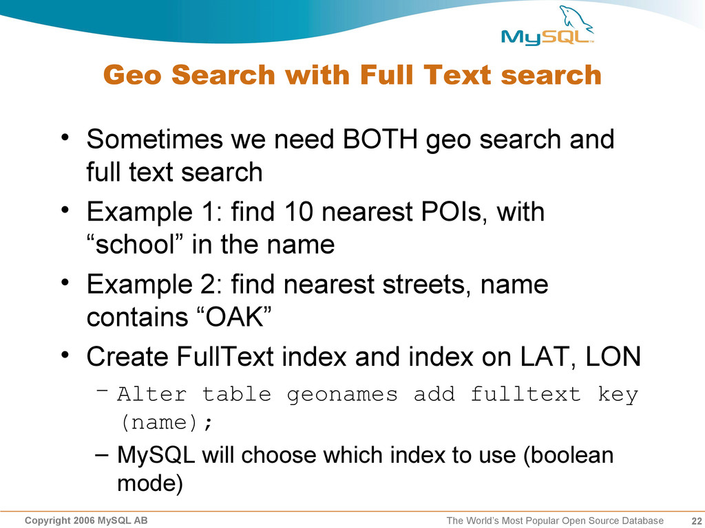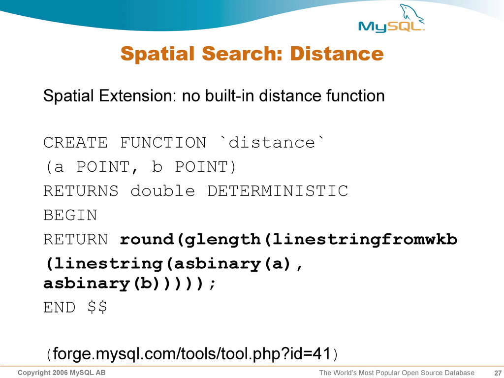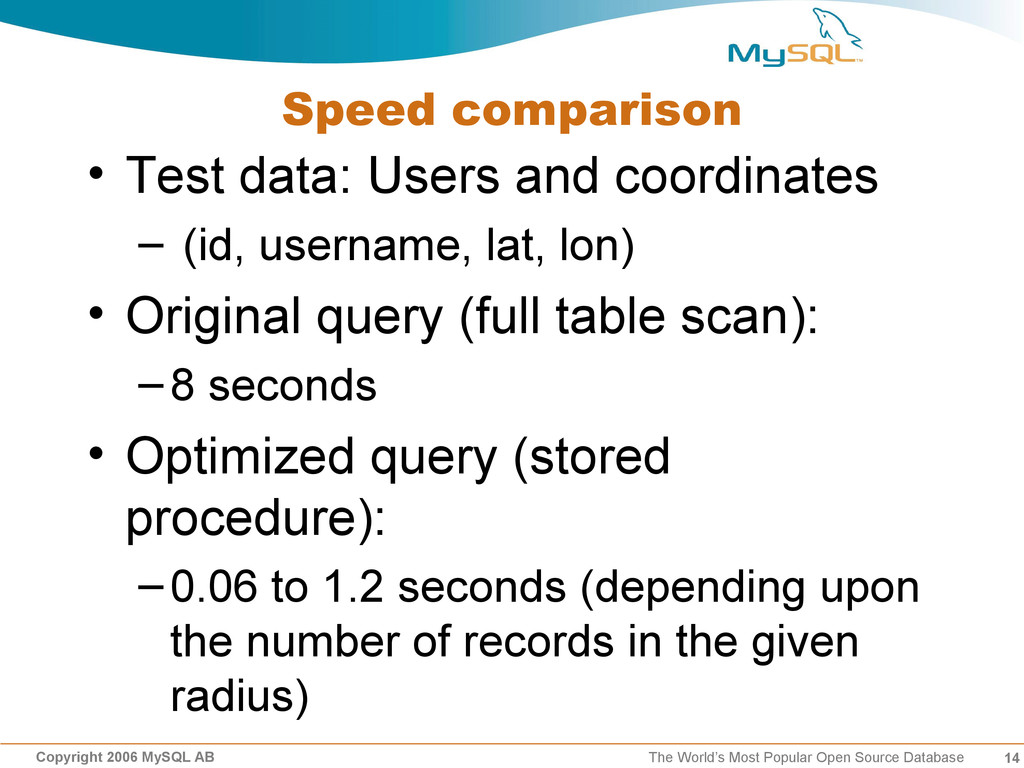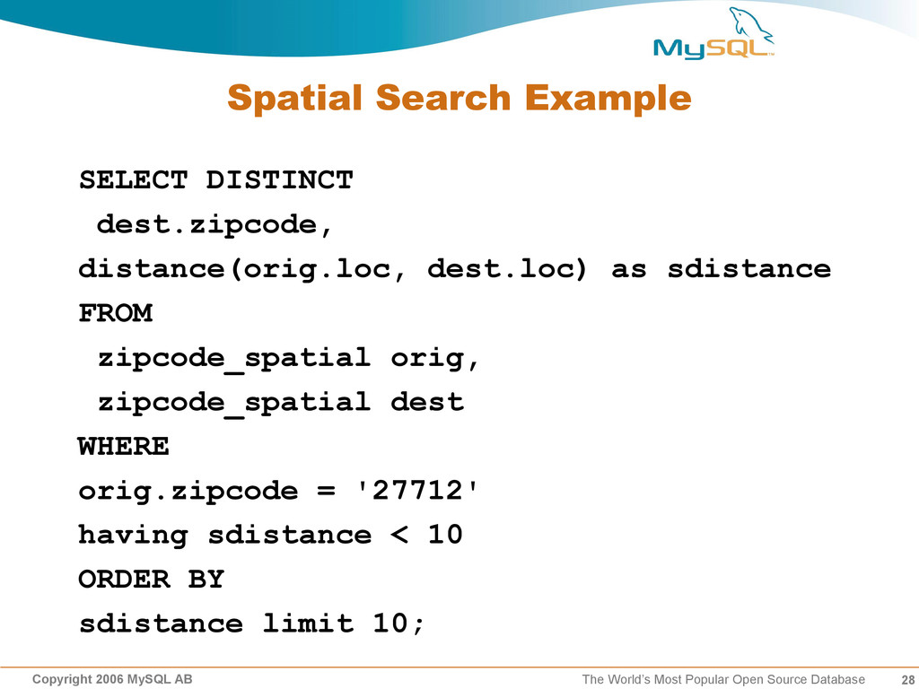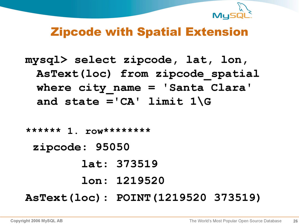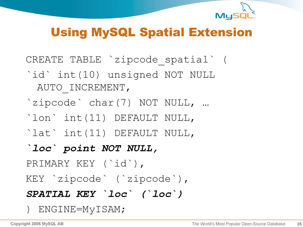 Source Database Using MySQL Spatial Extension CREATE TABLE `zipcode_spatial` ( `id` int(10) unsigned NOT NULL AUTO_INCREMENT, `zipcode` char(7) NOT NULL, … `lon` int(11) DEFAULT NULL, `lat` int(11) DEFAULT NULL, `loc` point NOT NULL, PRIMARY KEY (`id`), KEY `zipcode` (`zipcode`), SPATIAL KEY `loc` (`loc`) ) ENGINE=MyISAM;