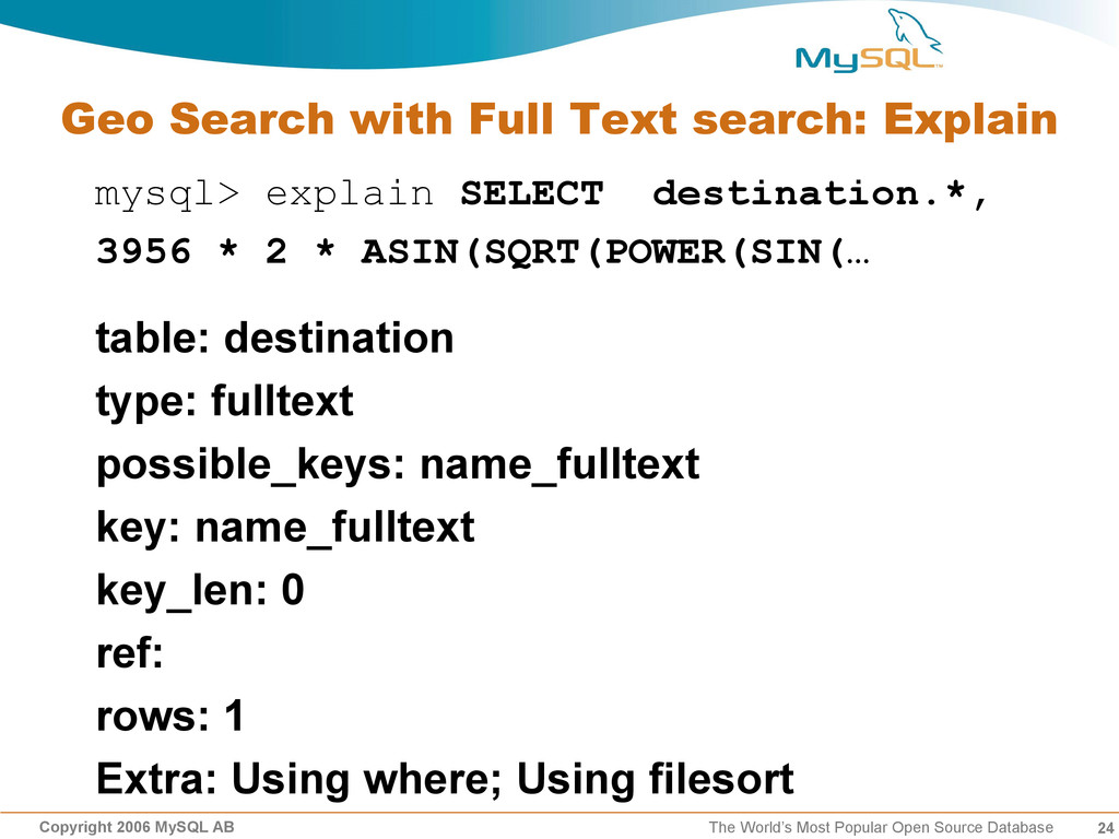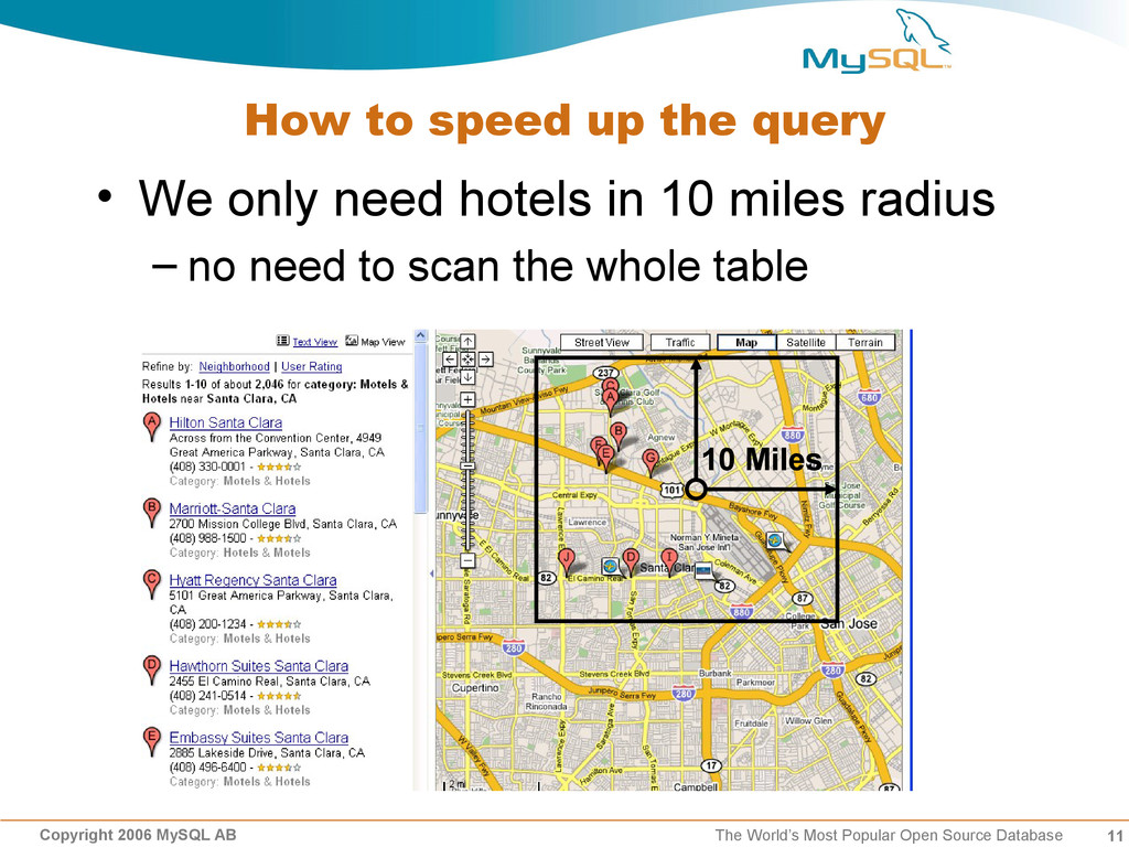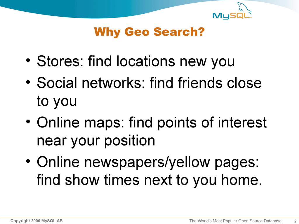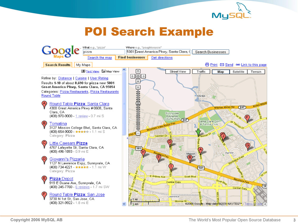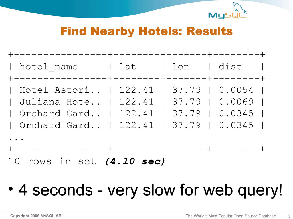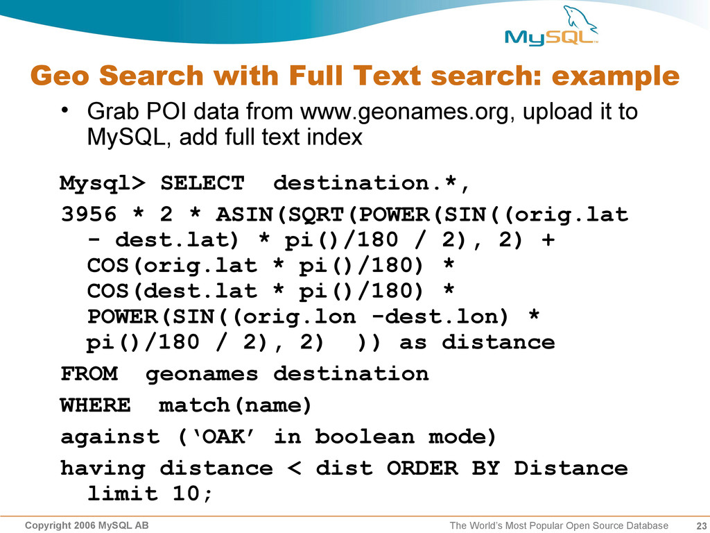 Source Database Using MySQL Spatial Extension CREATE TABLE `zipcode_spatial` ( `id` int(10) unsigned NOT NULL AUTO_INCREMENT, `zipcode` char(7) NOT NULL, … `lon` int(11) DEFAULT NULL, `lat` int(11) DEFAULT NULL, `loc` point NOT NULL, PRIMARY KEY (`id`), KEY `zipcode` (`zipcode`), SPATIAL KEY `loc` (`loc`) ) ENGINE=MyISAM;