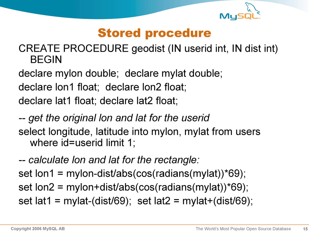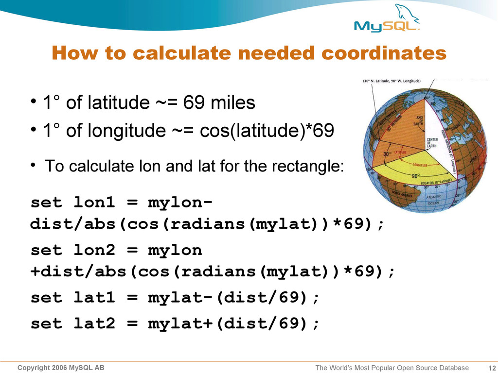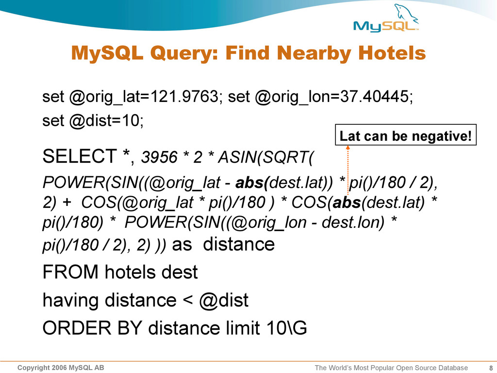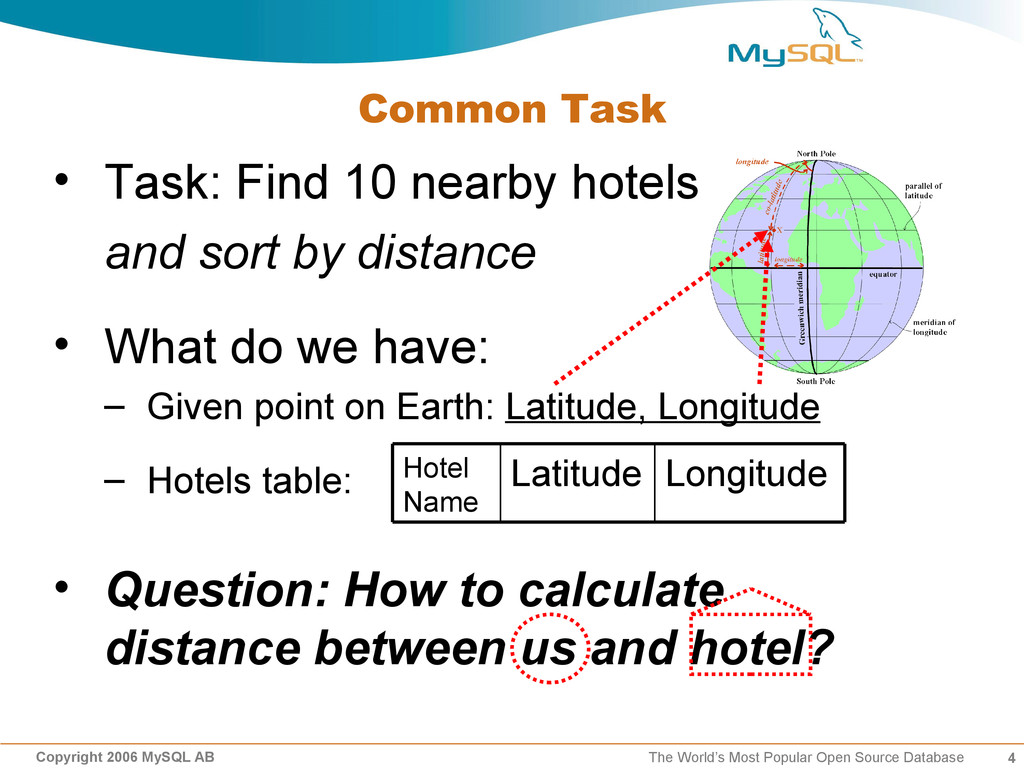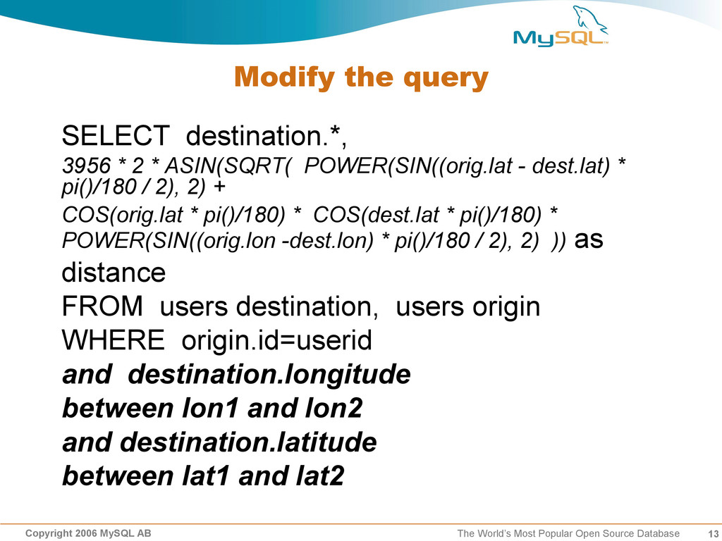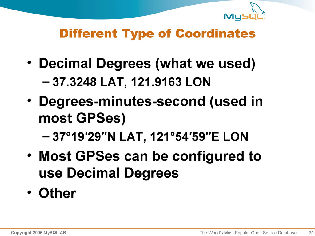 Source Database Using MySQL Spatial Extension CREATE TABLE `zipcode_spatial` ( `id` int(10) unsigned NOT NULL AUTO_INCREMENT, `zipcode` char(7) NOT NULL, … `lon` int(11) DEFAULT NULL, `lat` int(11) DEFAULT NULL, `loc` point NOT NULL, PRIMARY KEY (`id`), KEY `zipcode` (`zipcode`), SPATIAL KEY `loc` (`loc`) ) ENGINE=MyISAM;