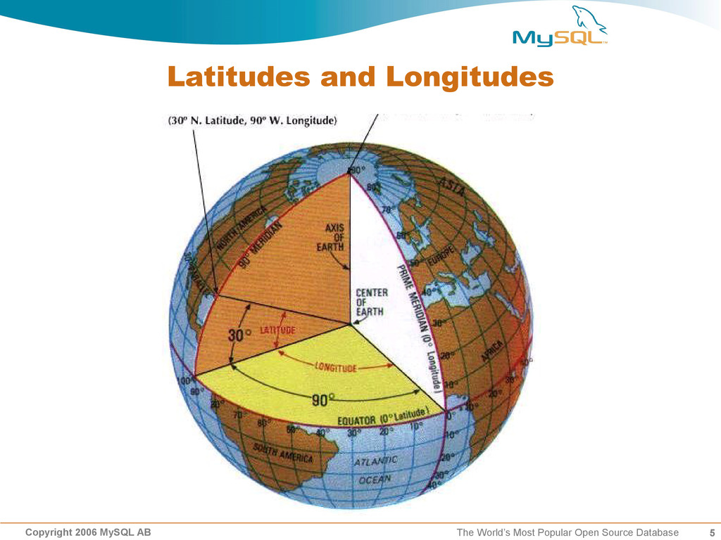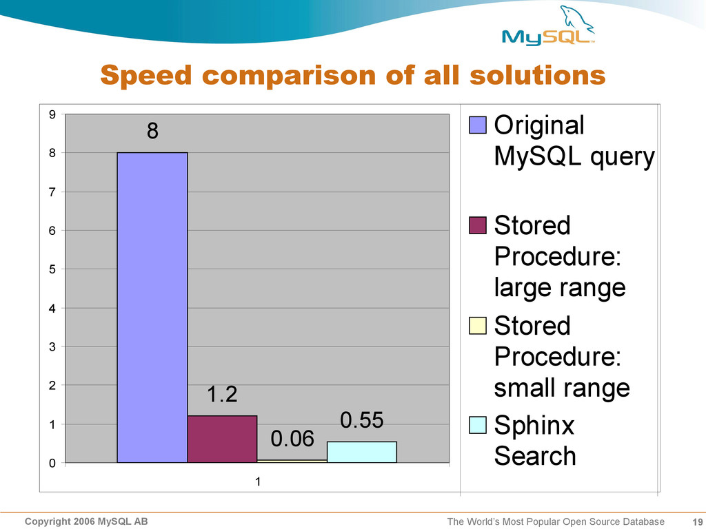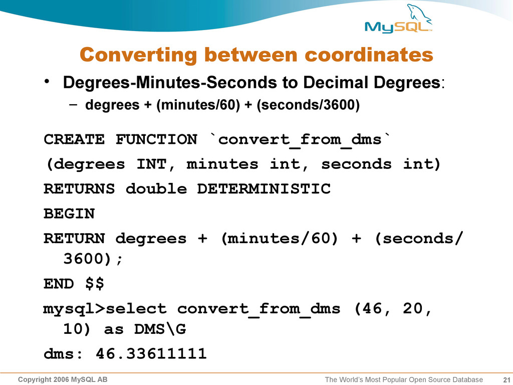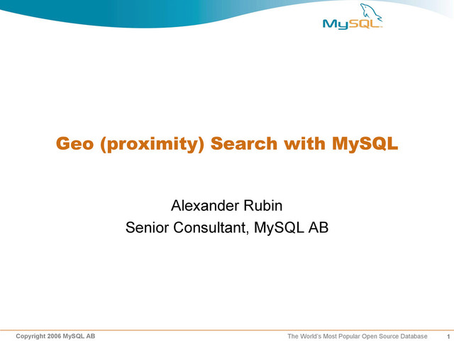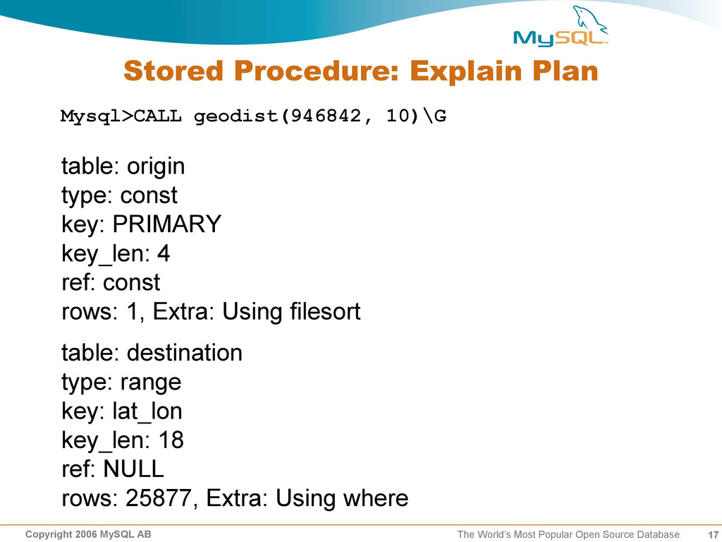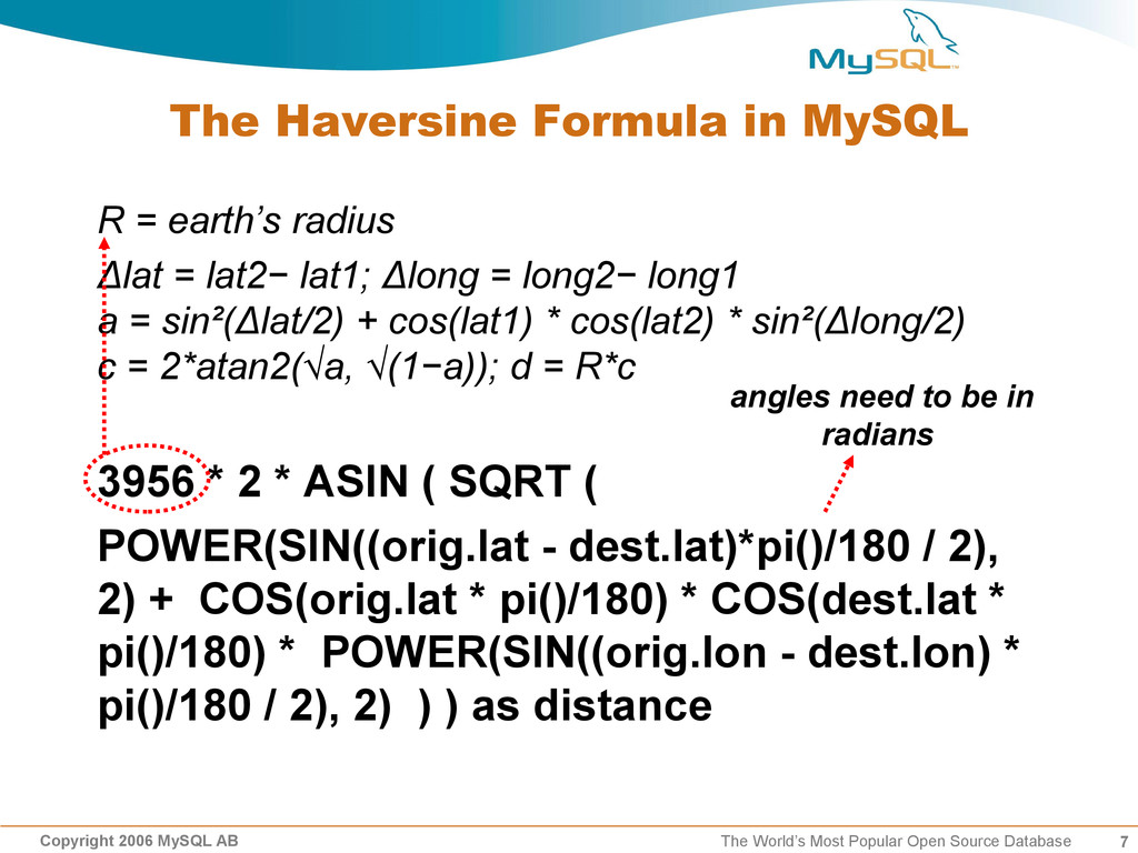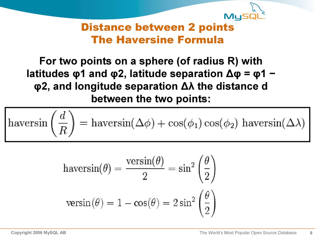 Source Database Using MySQL Spatial Extension CREATE TABLE `zipcode_spatial` ( `id` int(10) unsigned NOT NULL AUTO_INCREMENT, `zipcode` char(7) NOT NULL, … `lon` int(11) DEFAULT NULL, `lat` int(11) DEFAULT NULL, `loc` point NOT NULL, PRIMARY KEY (`id`), KEY `zipcode` (`zipcode`), SPATIAL KEY `loc` (`loc`) ) ENGINE=MyISAM;