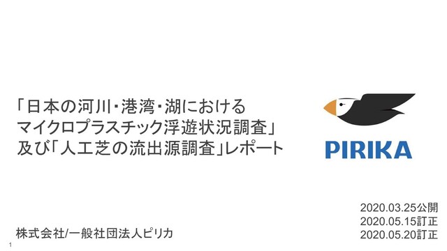 - 株式会社/一般社団法人ピリカとは - なぜ(マイクロ)プラスチックの流出が問題か - 「アルバトロス」プロジェクトとは - 河川・港湾・湖(100地点)におけるマイクロプラスチックの浮遊状況調査 - 人工芝の流出源調査 - 今後の課題と方向性