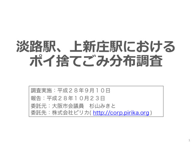 淡路駅、上新庄駅における ポイ捨てごみ分布調査 ௐ࣮ࠪࢪɿฏ݄̎̔̍̌̕ ใࠂɿฏ݄̎̔̍̌̎̏ ҕୗݩɿେࡕࢢձٞһ ਿࢁΈ͖ͱ ҕୗઌɿגࣜձࣾϐϦΧ IUUQDPSQQJSJLBPSH 1