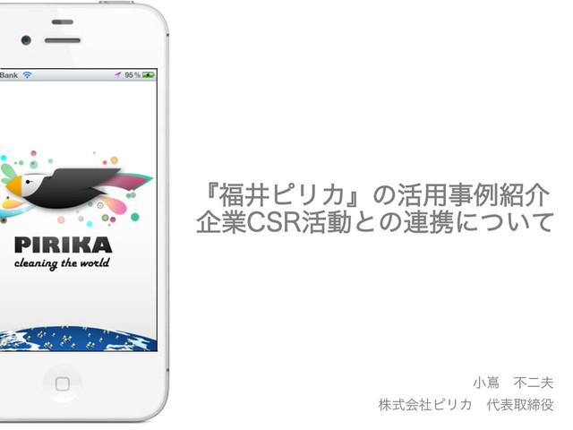小嶌 不二夫(こじま ふじお) 株式会社ピリカ 代表取締役 富山生まれ、神戸育ち 大阪府立大学 工学部 京都大学大学院 エネルギー科学研究科→休学 ベトナムで営業マン