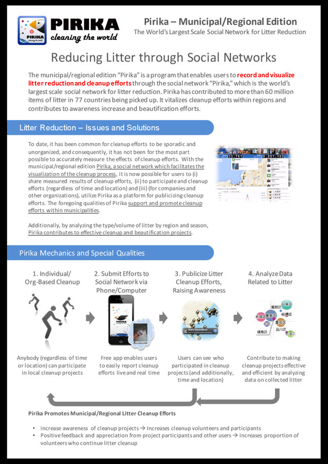 News, Tech Crunch, CNET Japan and many others. Awards Open Network Lab 3rd – Best Team Award eco japan cup 2012 –Judges’ Special Award (Kokuryo Award) Eco Summit Berlin Eco Summit Award 2013 –1st Prize Keio University Municipality App Contest –Grand Prize Awards and Media Coverage Pirika – Contact Us Pirika, Inc. is a start-up created in 2011 in the research facilities of Kyoto University. We aim to solve environmental problems with the power of science and technology. Our first step is to solve the global litter problem – for which no effective solution has been found and which affects everyone in the world. Pirika, Inc. CEO Fujio Kojima Open Network Space, 2 Floor, EBISU i-Mark Gate Bldg., 3-5-7 Ebisu Minami, Shibuya-ku, Tokyo 150-0022 Japan