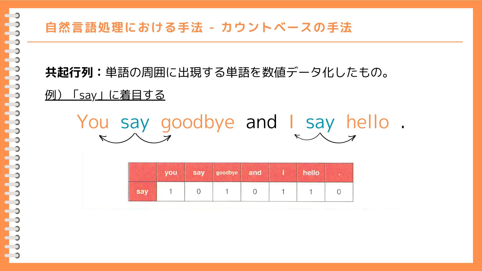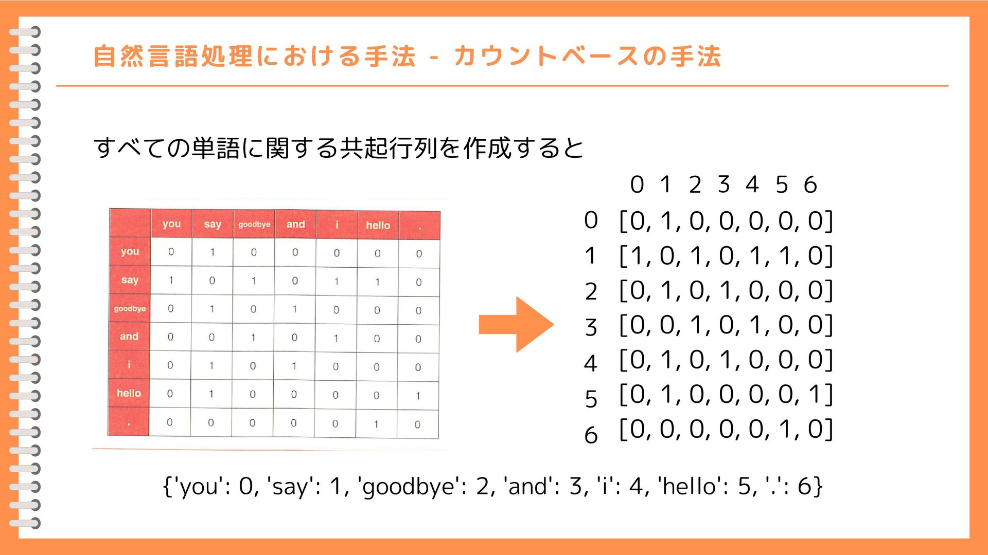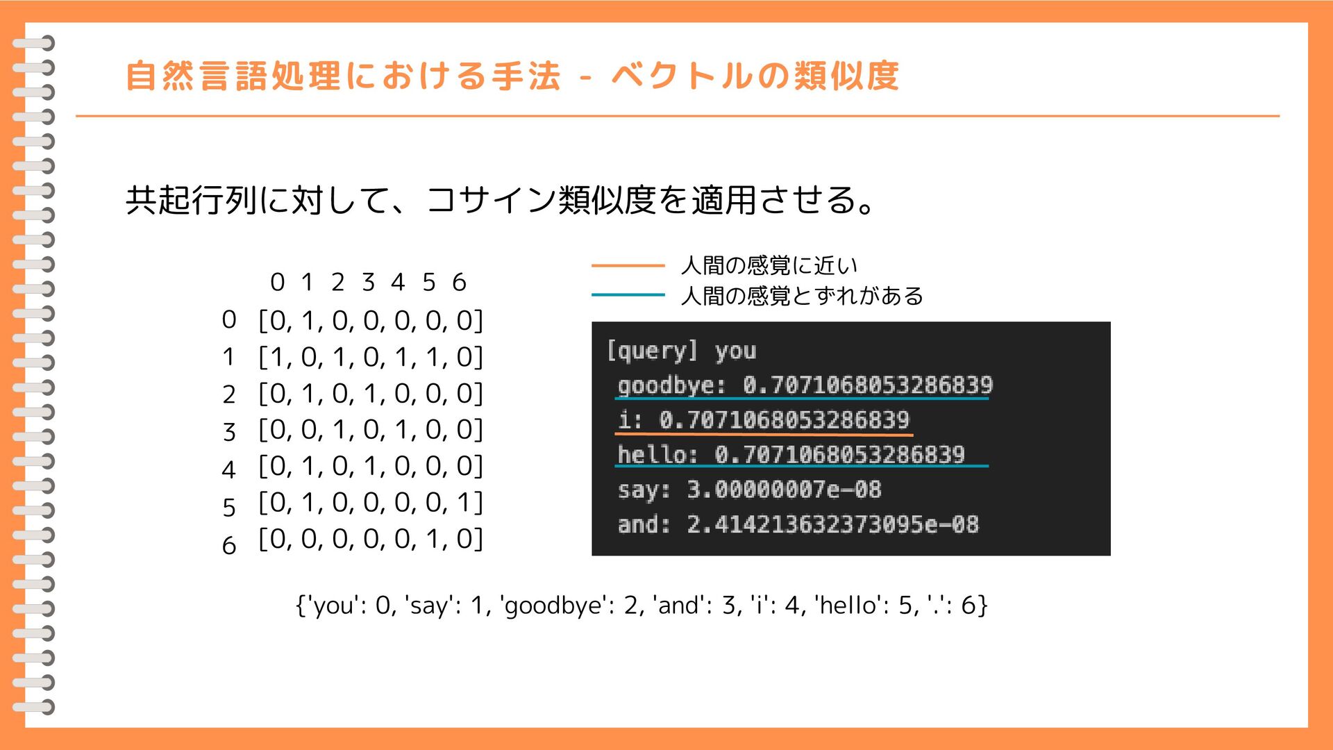 0] [1, 0, 1, 0, 1, 1, 0] [0, 1, 0, 1, 0, 0, 0] [0, 0, 1, 0, 1, 0, 0] [0, 1, 0, 1, 0, 0, 0] [0, 1, 0, 0, 0, 0, 1] [0, 0, 0, 0, 0, 1, 0] 0 1 2 3 4 5 6 0 1 2 3 4 5 6 {'you': 0, 'say': 1, 'goodbye': 2, 'and': 3, 'i': 4, 'hello': 5, '.': 6} 人間の感覚に近い 人間の感覚とずれがある