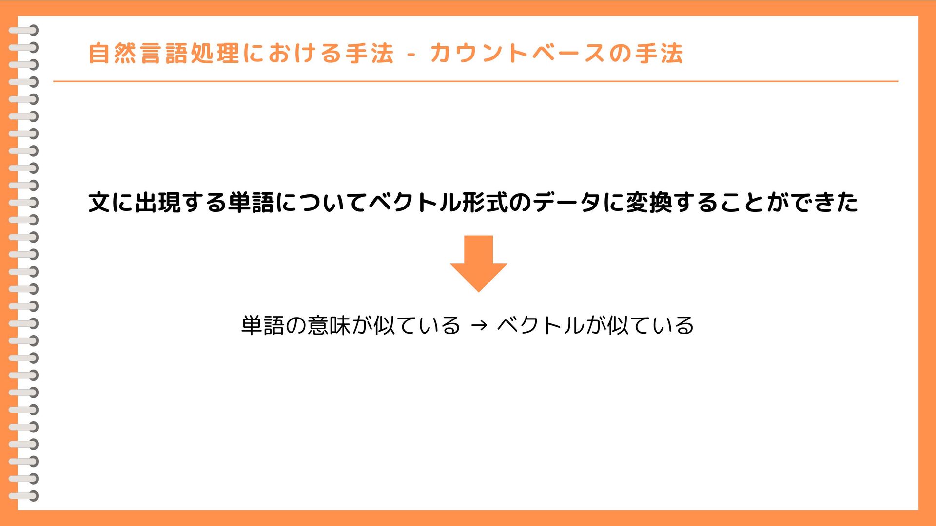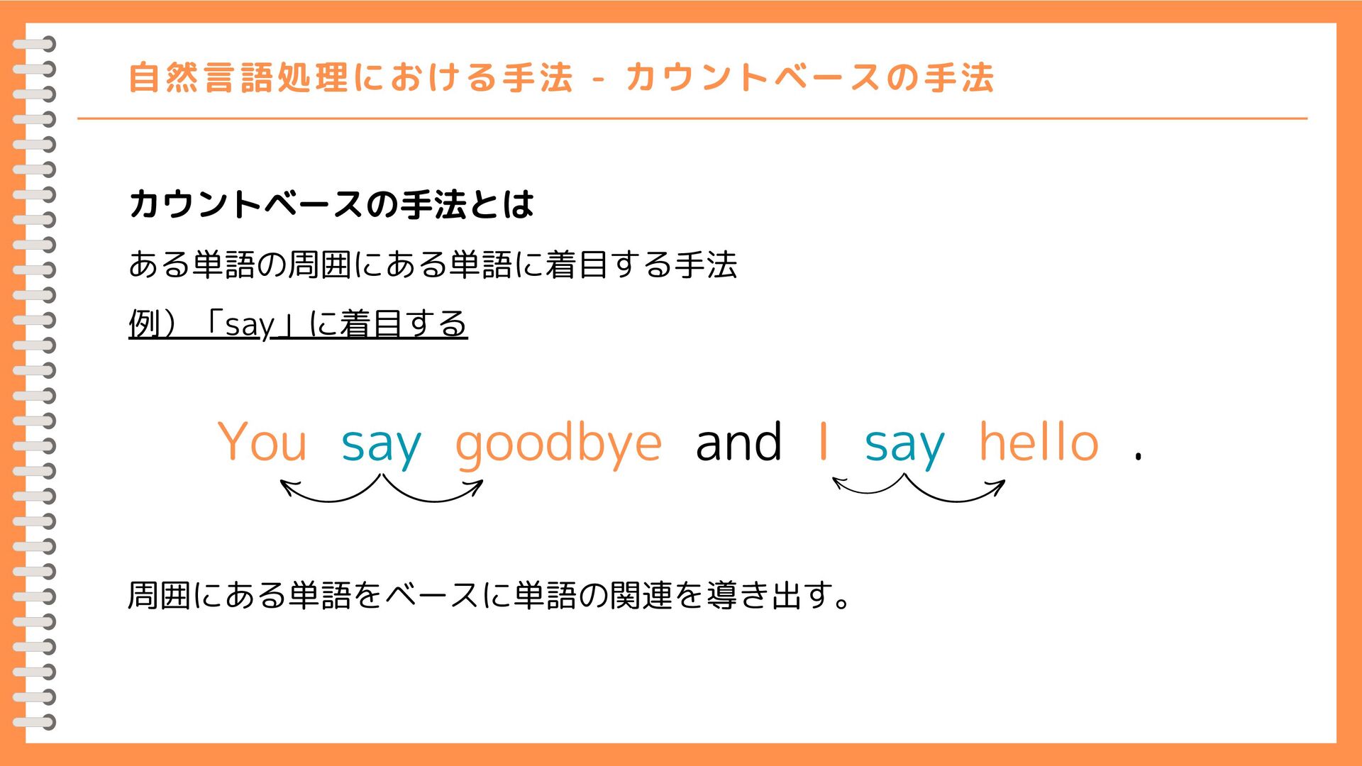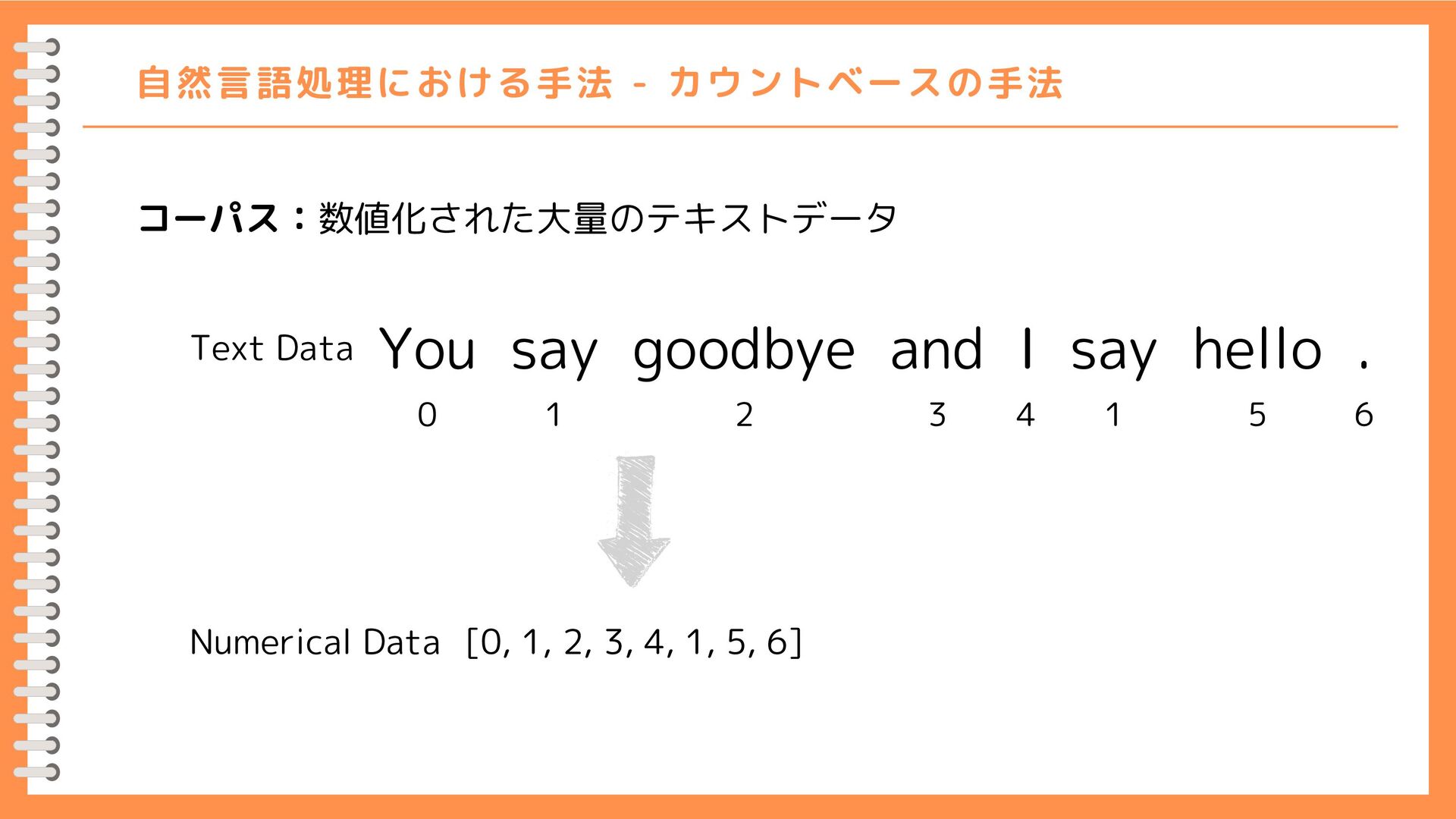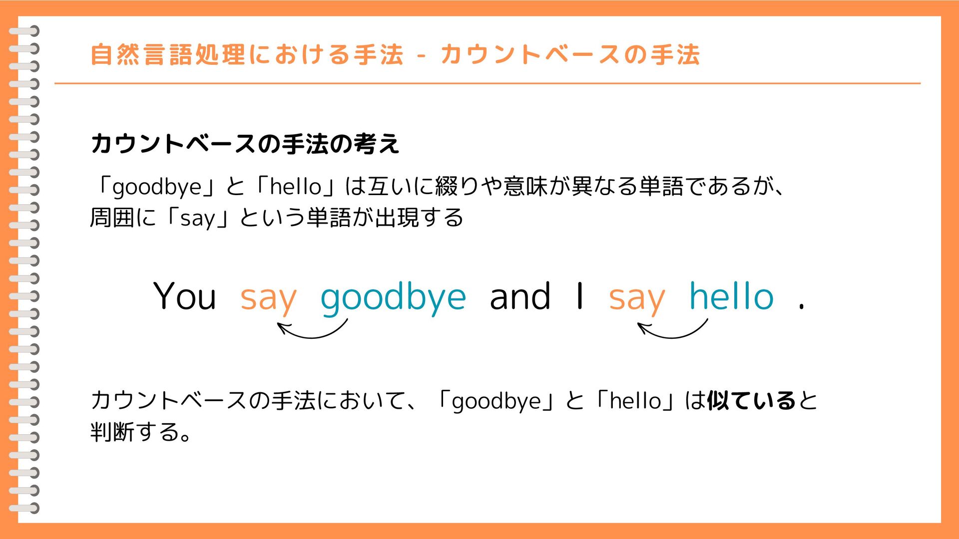0] [1, 0, 1, 0, 1, 1, 0] [0, 1, 0, 1, 0, 0, 0] [0, 0, 1, 0, 1, 0, 0] [0, 1, 0, 1, 0, 0, 0] [0, 1, 0, 0, 0, 0, 1] [0, 0, 0, 0, 0, 1, 0] 0 1 2 3 4 5 6 0 1 2 3 4 5 6 {'you': 0, 'say': 1, 'goodbye': 2, 'and': 3, 'i': 4, 'hello': 5, '.': 6} 人間の感覚に近い 人間の感覚とずれがある