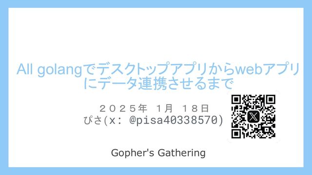 All golangでデスクトップアプリからwebアプリ にデータ連携させるまで 2025年 1月 18日 ぴさ(x: @pisa40338570) Gopher's Gathering