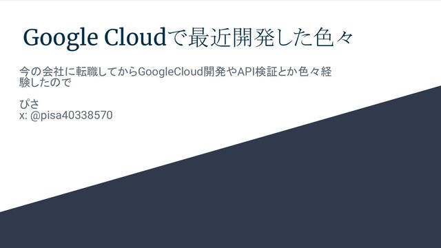 Google Cloudで最近開発した色々 今の会社に転職してからGoogleCloud開発やAPI検証とか色々経 験したので ぴさ x: @pisa40338570