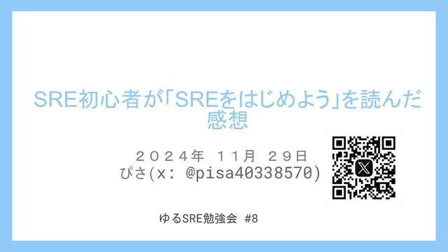 4章 SREについて語る(SREの提唱) 第一部 SRE入門 第二部 個人がSREをはじめるには 第三部 組織がSREをはじめるには 11章 成功のための組織的要因 12章 SREはいかにして失敗するか 13章 ビジネス視点からの SRE 14章 Dickersonの信頼性の階層構造 15章 SREを組織に組み込む 16章 SRE組織の進化段階 17章 組織におけるSREの成長 18章 おわりに 5章 個人がSREになるための準備 6章 ・・・からSREになる 7章 SREとして採用されるためのヒント 8章 SREのある1日 9章 トイルとの関係を築く 10章 失敗から学習する 2部までしか読めていないので 2部に ついての感想を話します