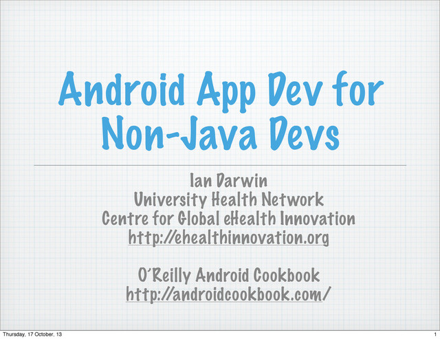 This session will cover a variety of technologies that let you build and package Android apps without writing a line of Java code. Technologies covered will include App Inventor - a simple visual building-blocks approach - and focus on well-known other languages (including Python, Perl, and a cast of other scripting languages mentioned in passing), and of course that old favorite C and its overgrown offspring C++. Not to mention OpenGL and some physics and gaming frameworks like Cocos2D.