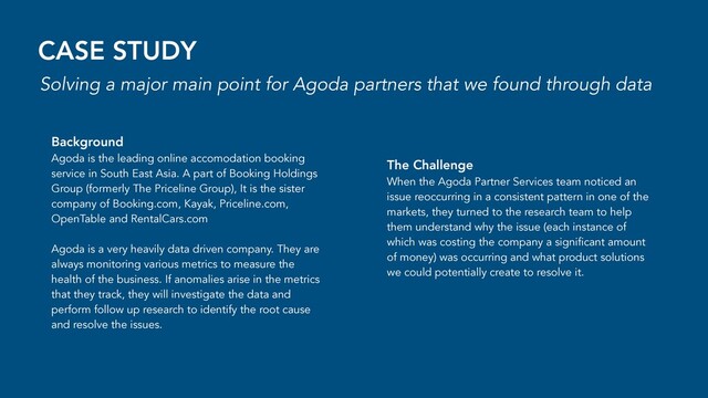 booking service in South East Asia. A part of Booking Holdings Group (formerly The Priceline Group), It is the sister company of Booking.com, Kayak, Priceline.com, OpenTable and RentalCars.com Agoda is a very heavily data driven company. They are always monitoring various metrics to measure the health of the business. If anomalies arise in the metrics that they track, they will investigate the data and perform follow up research to identify the root cause and resolve the issues. Solving a major main point for Agoda partners that we found through data The Challenge