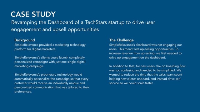 SimpleRelevance’s clients could launch completely personalized campaigns with just one single digital marketing campaign. SimpleRelevance’s proprietary technology would automatically personalize the campaign so that every customer would receive an individually unique and personalized communication that was tailored to their preferences. Revamping the Dashboard of a TechStars startup to drive user engagement and upsell opportunities The Challenge