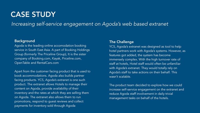 booking service in South East Asia. A part of Booking Holdings Group (formerly The Priceline Group), It is the sister company of Booking.com, Kayak, Priceline.com, OpenTable and RentalCars.com Apart from the customer facing product that is used to book accommodations. Agoda also builds partner facing products. YCS, Agoda’s extranet is one such product. The extranet allows Hotels to manage their content on Agoda, provide availability of their inventory and the rates at which they are selling them on Agoda. The extranet also allows them to run promotions, respond to guest reviews and collect payments for inventory sold through Agoda Increasing self-service engagement on Agoda’s web based extranet The Challenge