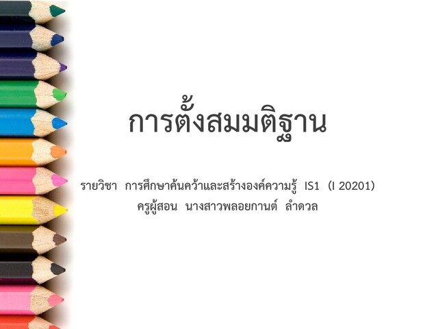 การตั้งสมมติฐาน รายวิชา การศึกษาค้นคว้าและสร้างองค์ความรู้ IS1 (I 20201) ครูผู้สอน นางสาวพลอยกานต์ ล าดวล