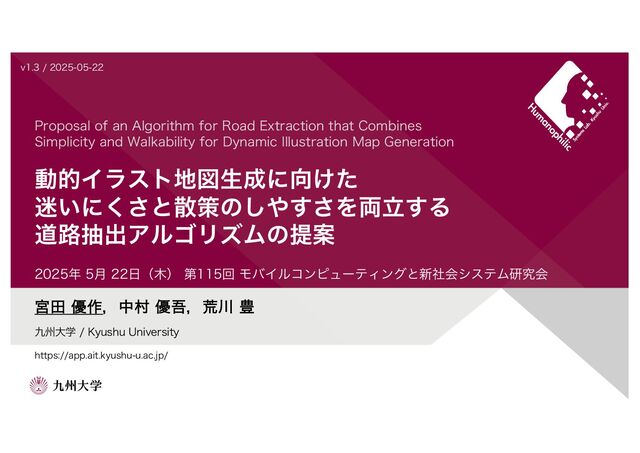 この資料は,2025年5月22日に開催された「第115回 モバイルコンピューティングと新社会システム研究会」にて,プレゼン発表「動的イラスト地図生成に向けた迷いにくさと散策のしやすさを両立する道路抽出アルゴリズムの提案」に利用したものです.