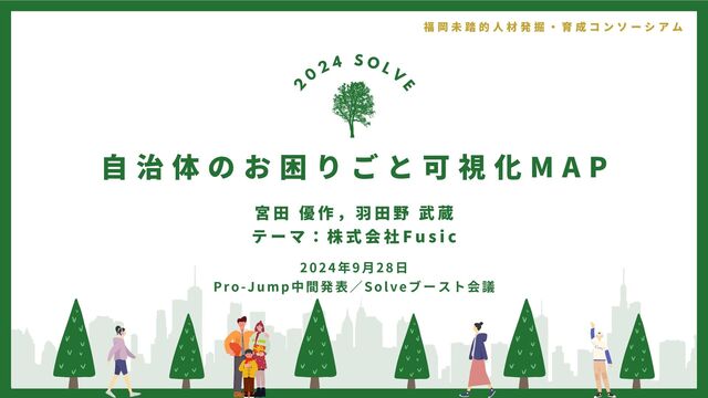この資料は、2024年9月28日に開催された、福岡未踏的人材発掘・育成コンソーシアム主催のキックオフイベントで利用したものです。種別「Solve」に属するテーマ「自治体のお困りごと可視化マップ」の概要を示したプレゼンテーション資料です。