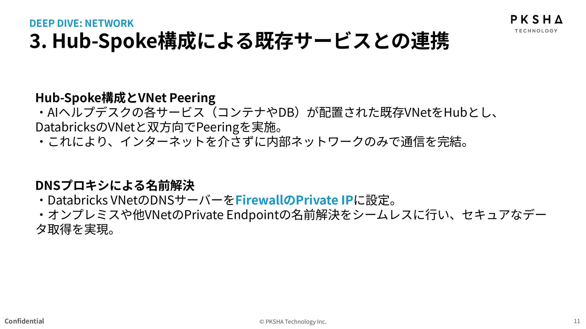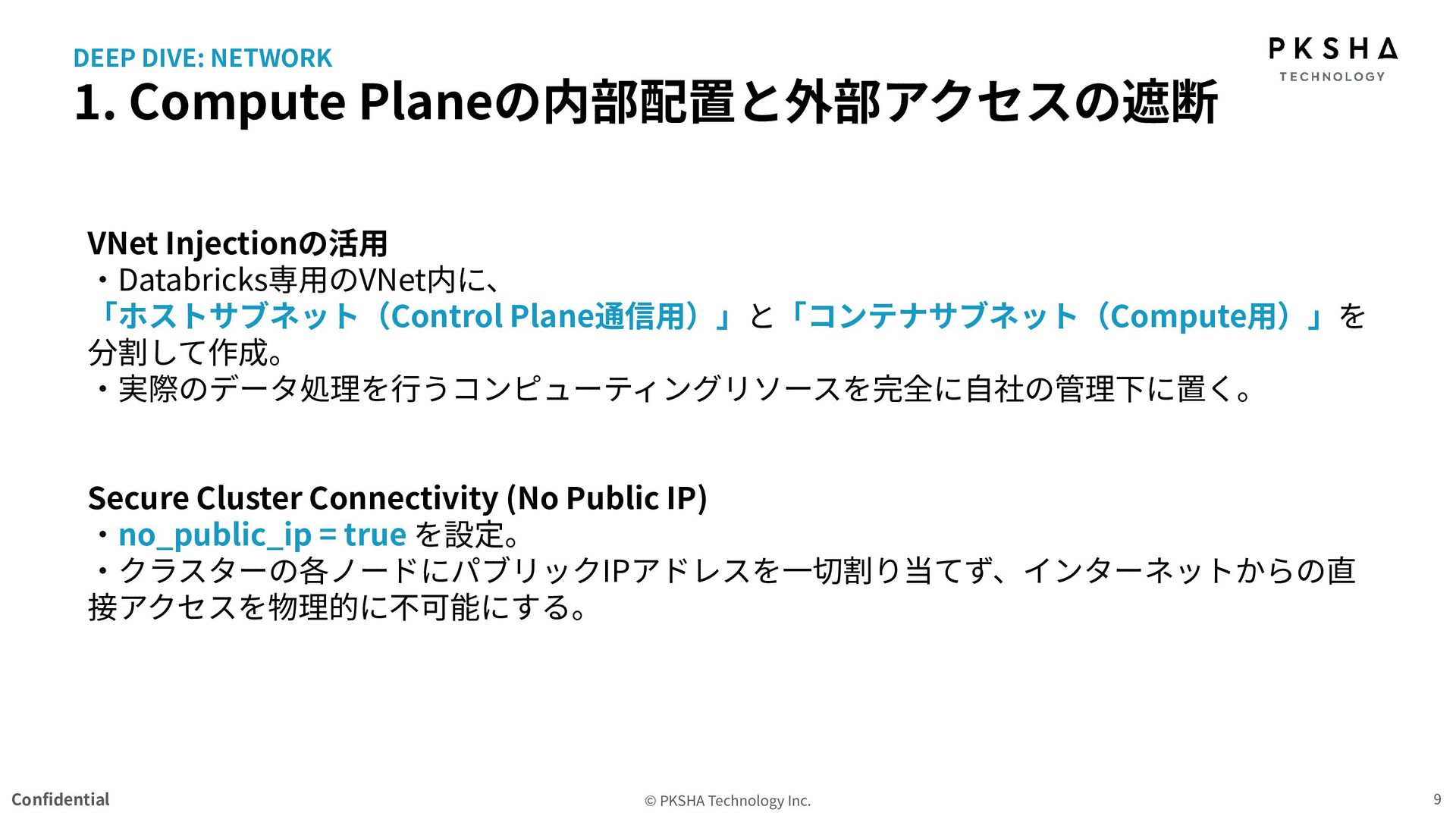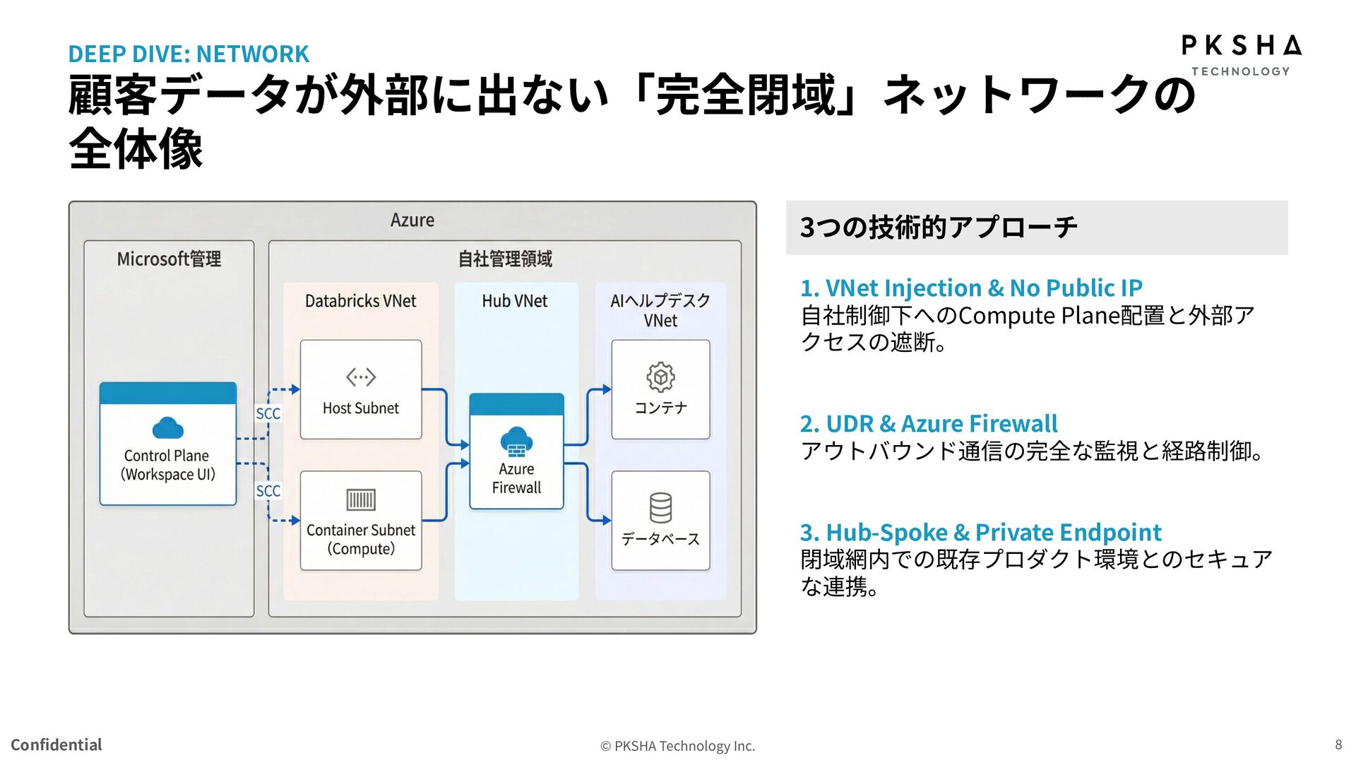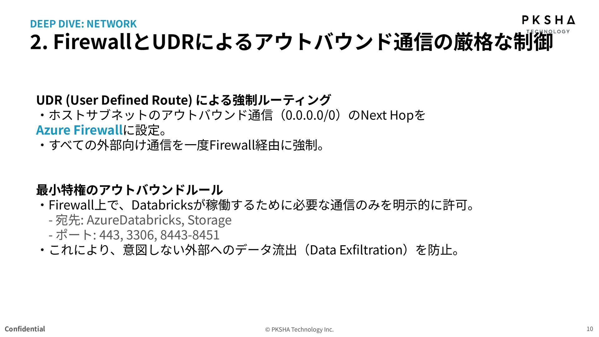 FirewallとUDRによるアウトバウンド通信の厳格な制御 UDR (User Defined Route) による強制ルーティング ‧ホストサブネットのアウトバウンド通信(0.0.0.0/0)のNext Hopを Azure Firewallに設定。 ‧すべての外部向け通信を⼀度Firewall経由に強制。 最⼩特権のアウトバウンドルール ‧Firewall上で、Databricksが稼働するために必要な通信のみを明⽰的に許可。 - 宛先: AzureDatabricks, Storage - ポート: 443, 3306, 8443-8451 ‧これにより、意図しない外部へのデータ流出(Data Exfiltration)を防⽌。