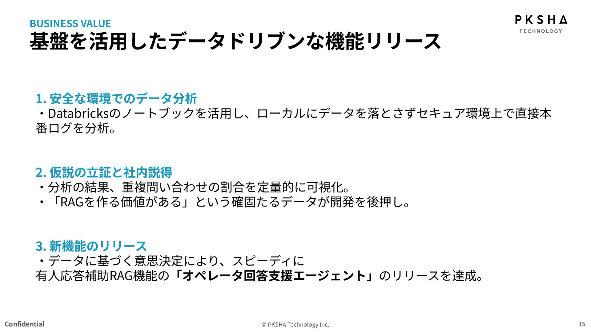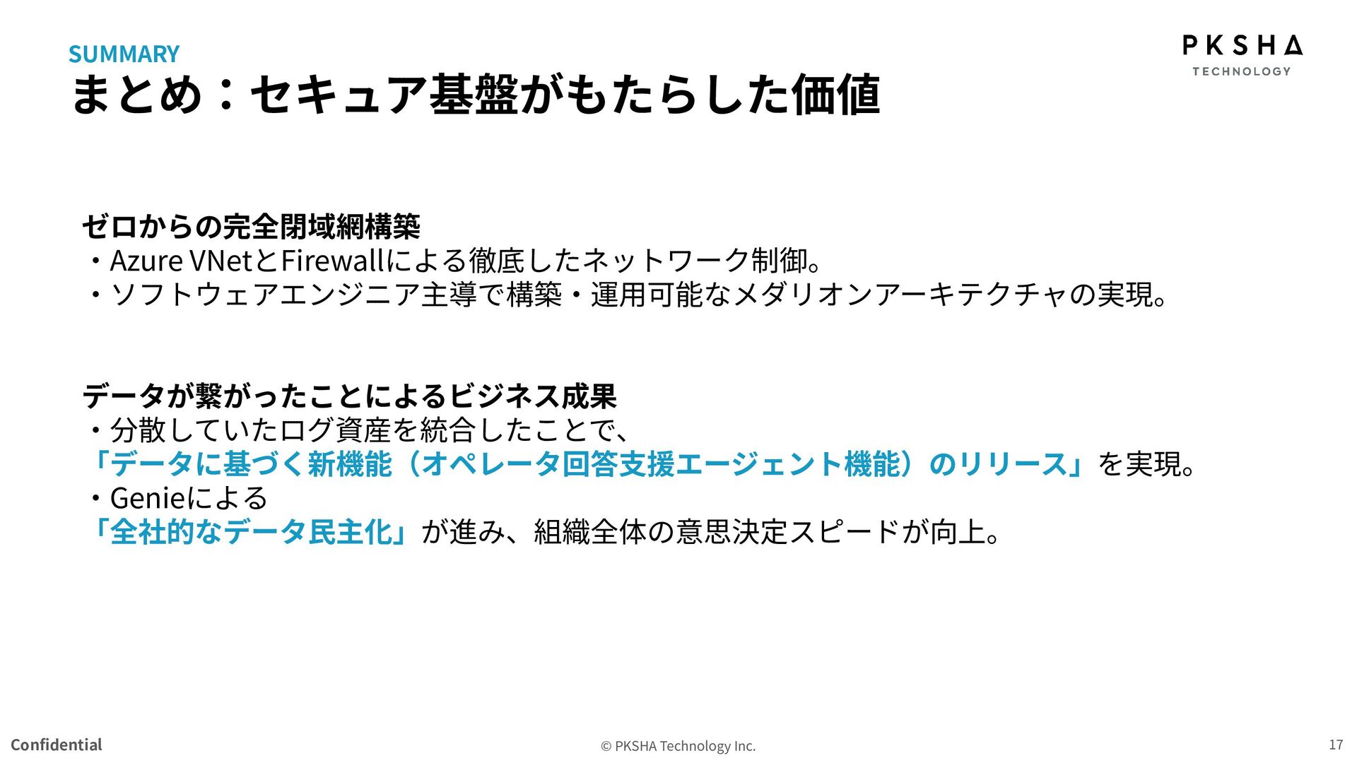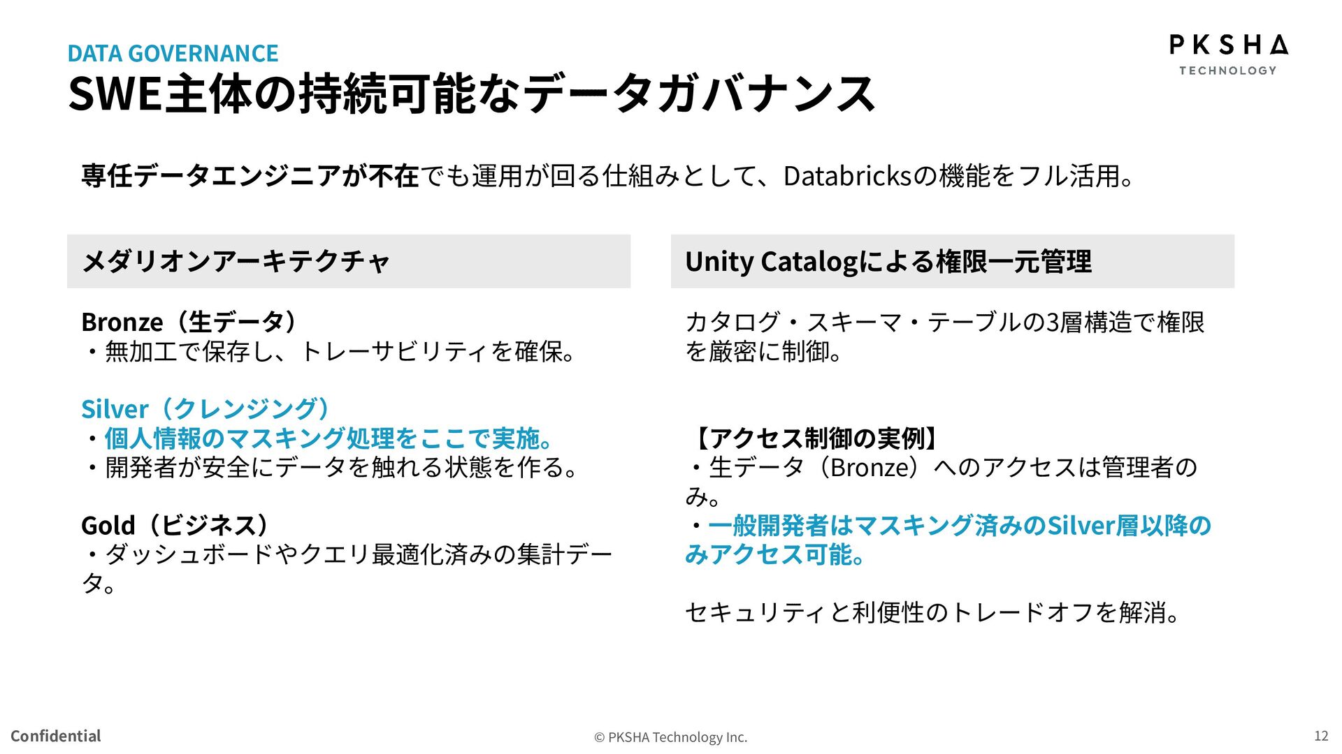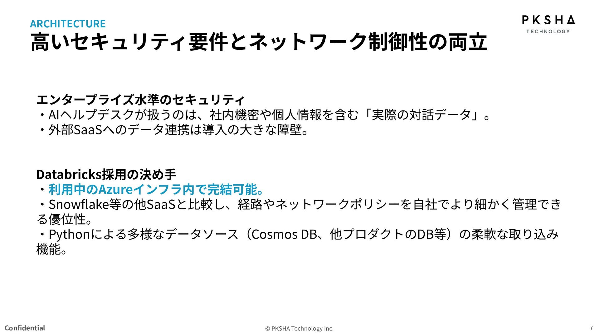 FirewallとUDRによるアウトバウンド通信の厳格な制御 UDR (User Defined Route) による強制ルーティング ‧ホストサブネットのアウトバウンド通信(0.0.0.0/0)のNext Hopを Azure Firewallに設定。 ‧すべての外部向け通信を⼀度Firewall経由に強制。 最⼩特権のアウトバウンドルール ‧Firewall上で、Databricksが稼働するために必要な通信のみを明⽰的に許可。 - 宛先: AzureDatabricks, Storage - ポート: 443, 3306, 8443-8451 ‧これにより、意図しない外部へのデータ流出(Data Exfiltration)を防⽌。