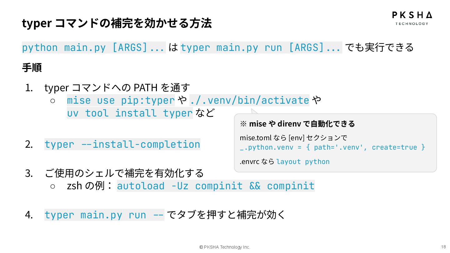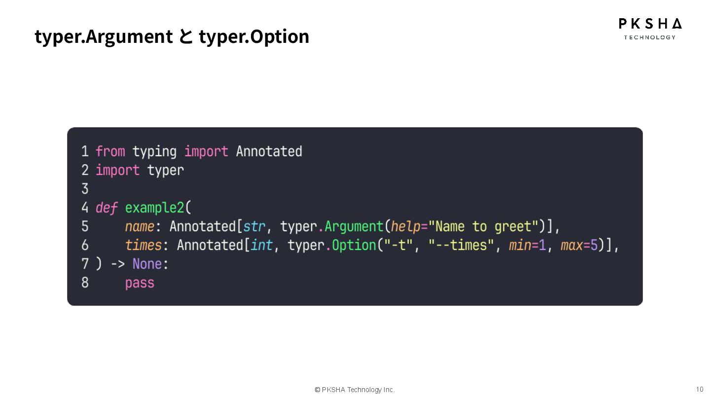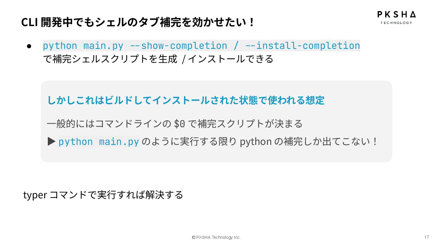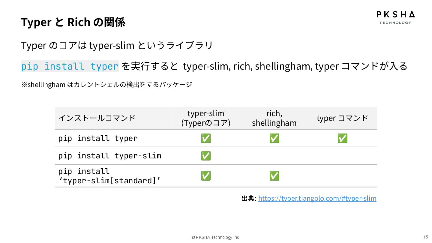typer-slim というライブラリ pip install typer を実⾏すると typer-slim, rich, shellingham, typer コマンドが⼊る ※shellingham はカレントシェルの検出をするパッケージ 15 インストールコマンド typer-slim (Typerのコア) rich, shellingham typer コマンド pip install typer ✅ ✅ ✅ pip install typer-slim ✅ pip install ‘typer-slim[standard]’ ✅ ✅ 出典: https://typer.tiangolo.com/#typer-slim
