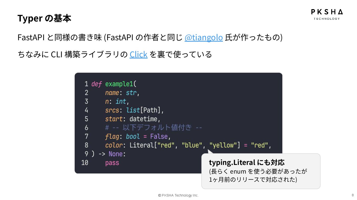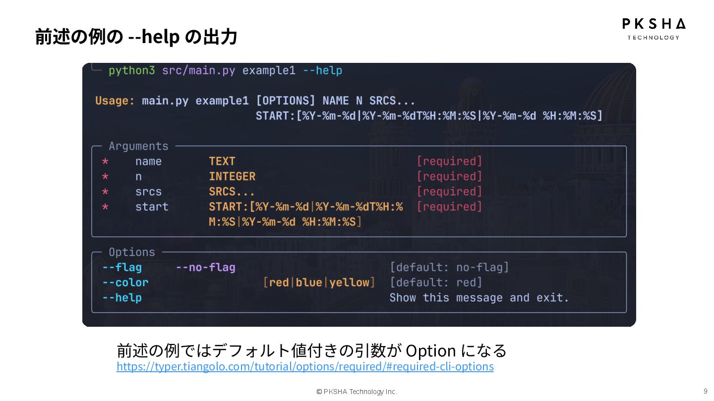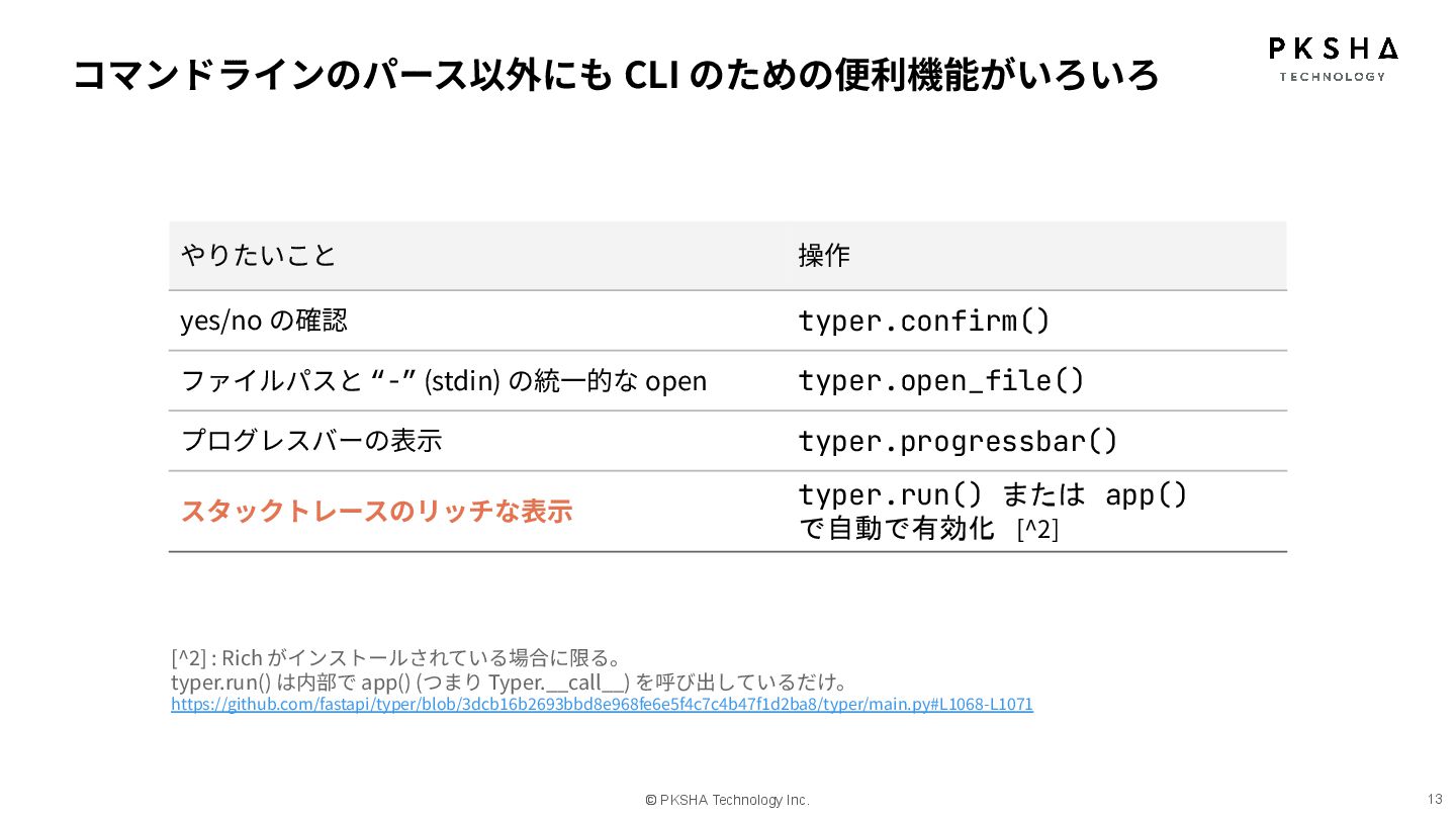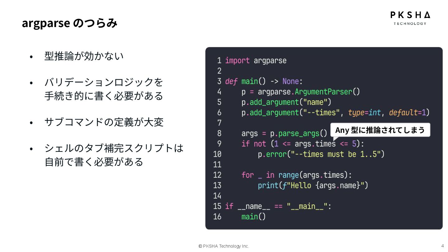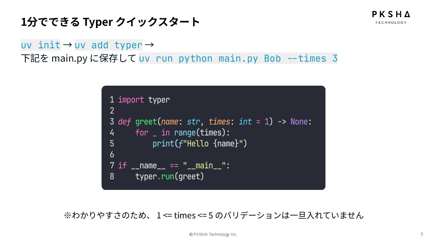typer-slim というライブラリ pip install typer を実⾏すると typer-slim, rich, shellingham, typer コマンドが⼊る ※shellingham はカレントシェルの検出をするパッケージ 15 インストールコマンド typer-slim (Typerのコア) rich, shellingham typer コマンド pip install typer ✅ ✅ ✅ pip install typer-slim ✅ pip install ‘typer-slim[standard]’ ✅ ✅ 出典: https://typer.tiangolo.com/#typer-slim