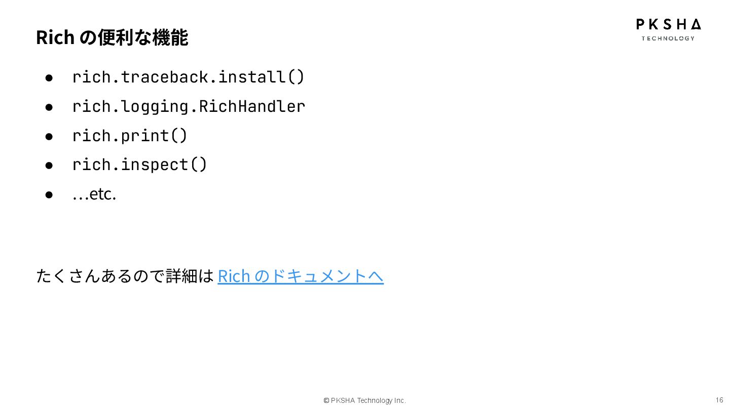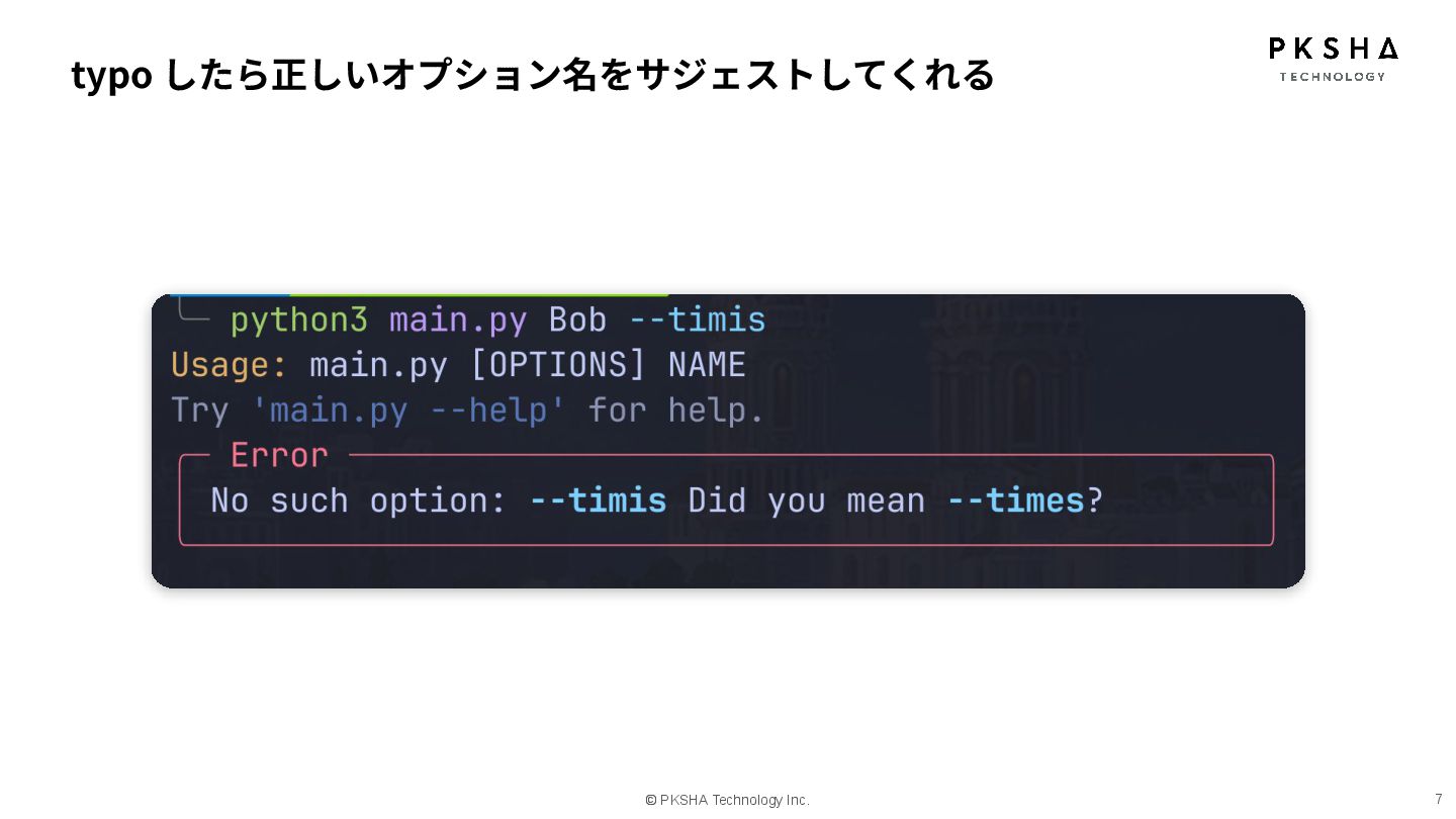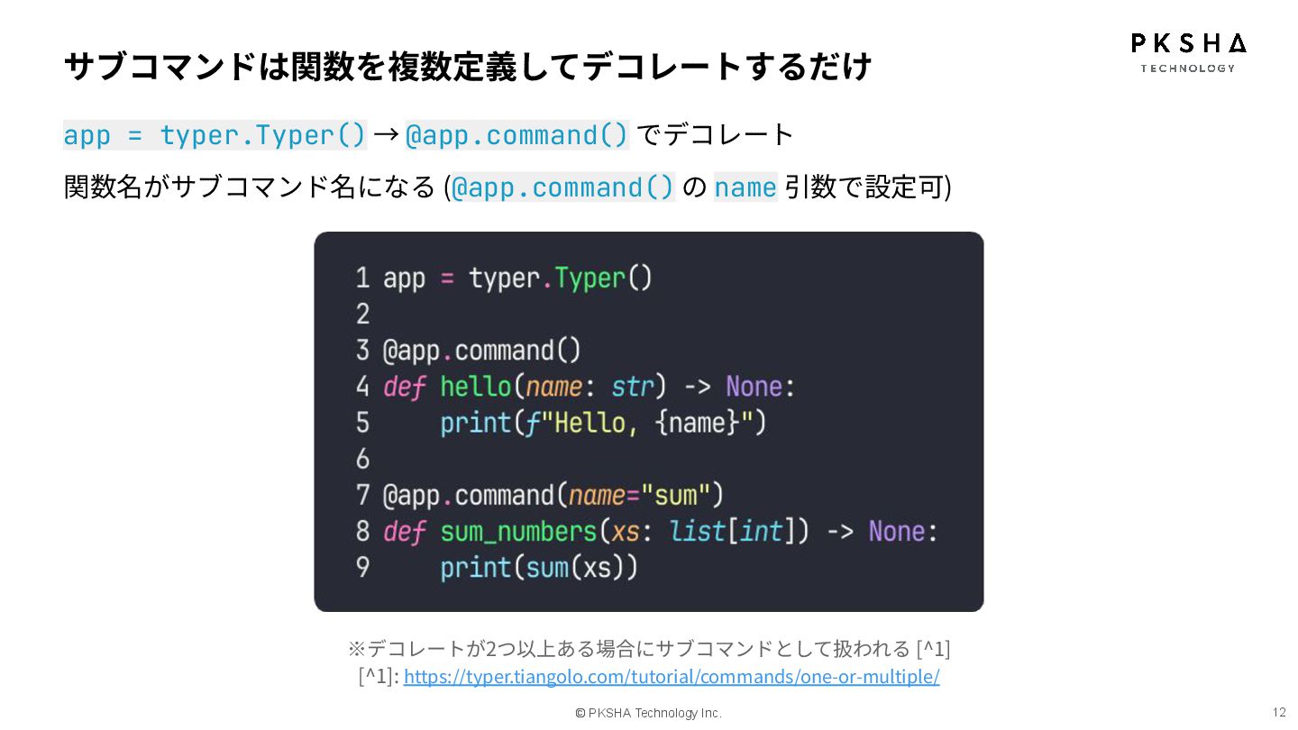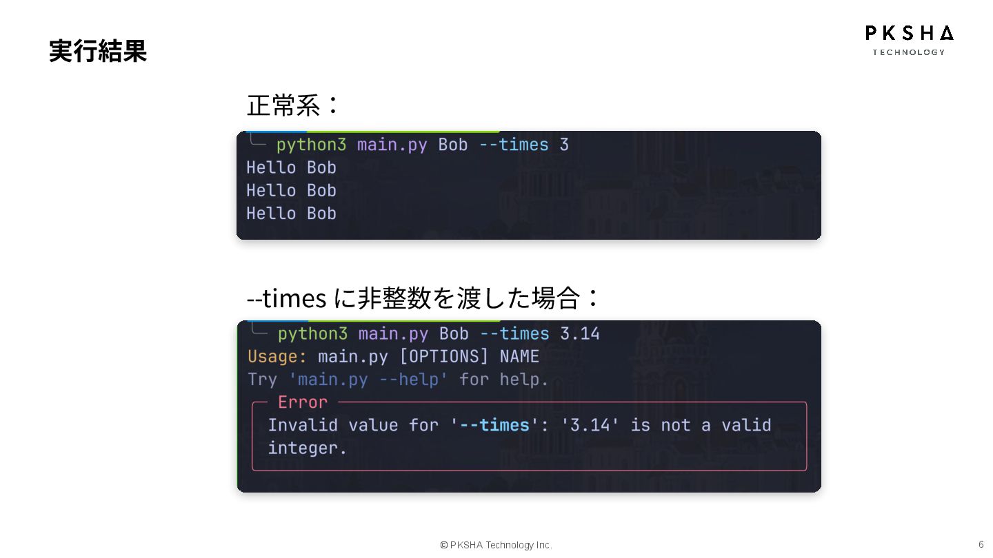 typer-slim というライブラリ pip install typer を実⾏すると typer-slim, rich, shellingham, typer コマンドが⼊る ※shellingham はカレントシェルの検出をするパッケージ 15 インストールコマンド typer-slim (Typerのコア) rich, shellingham typer コマンド pip install typer ✅ ✅ ✅ pip install typer-slim ✅ pip install ‘typer-slim[standard]’ ✅ ✅ 出典: https://typer.tiangolo.com/#typer-slim