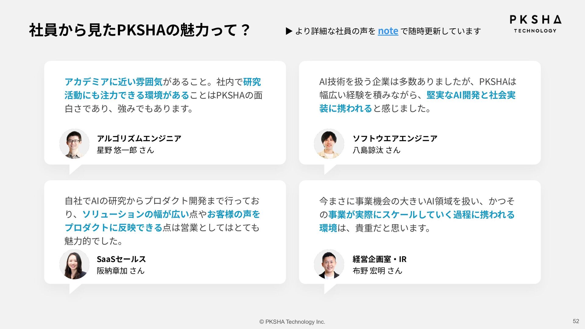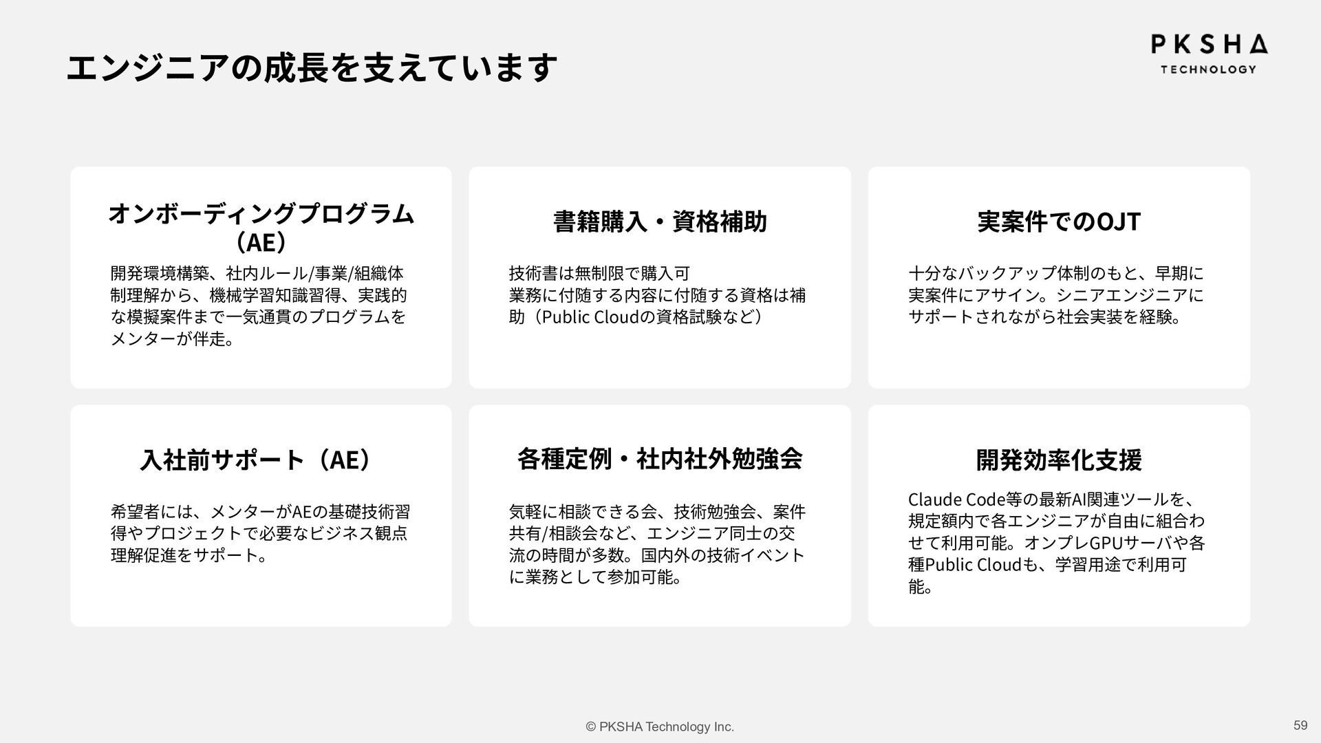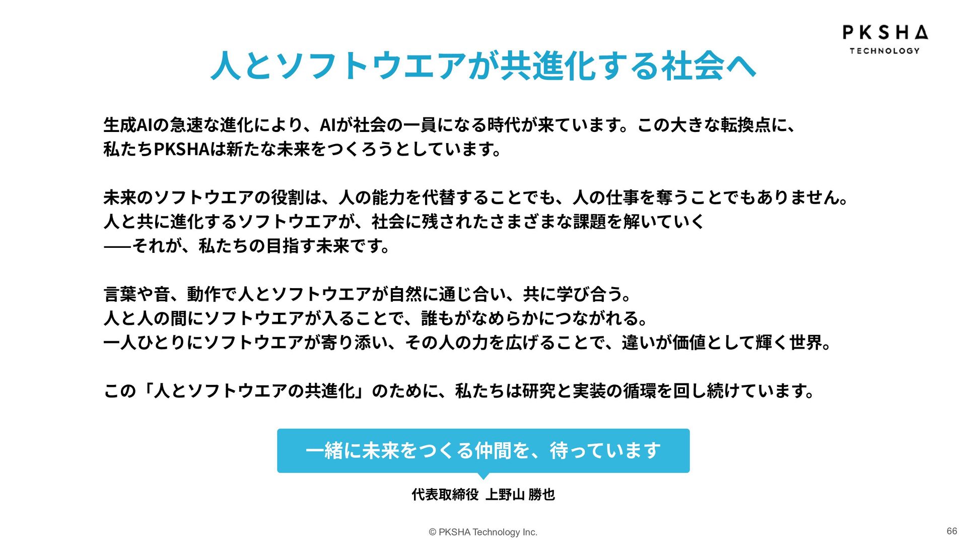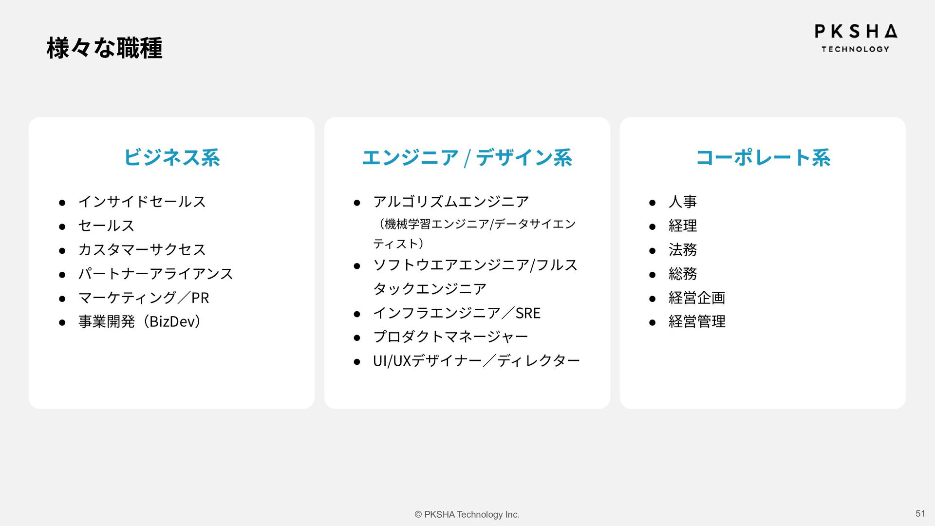 SaaS ⽣まれた技術を、誰もが使えるプロダクトに AI Research & Solution まだない技術や体験を、研究の⼒でかたちに 事業 カンパニー制度 AI Knowledge & Communication カンパニー AI Native カンパニー AI Research & Soution カンパニー Physical AI カンパニー AI HR カンパニー AIの未来を5つのカンパニーで切り拓き、 次世代の経営リーダーを⽣み出していく。