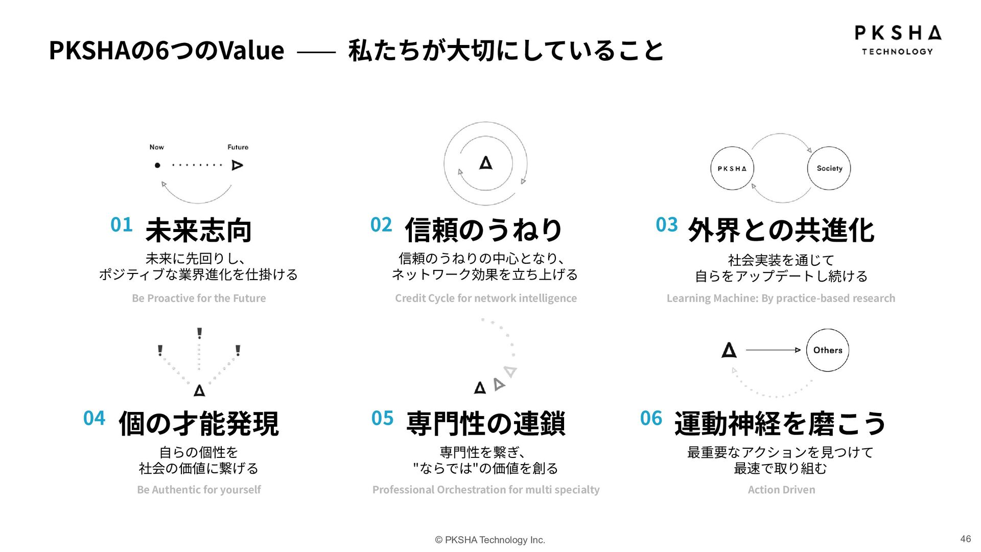 for the Future Credit Cycle for network intelligence Learning Machine: By practice-based research Be Authentic for yourself Professional Orchestration for multi specialty Action Driven 未来志向 信頼のうねり 外界との共進化 個の才能発現 専⾨性の連鎖 運動神経を磨こう 未来に先回りし、 ポジティブな業界進化を仕掛ける 信頼のうねりの中⼼となり、 ネットワーク効果を⽴ち上げる ⾃らの個性を 社会の価値に繋げる 専⾨性を繋ぎ、 "ならでは"の価値を創る 社会実装を通じて ⾃らをアップデートし続ける 最重要なアクションを⾒つけて 最速で取り組む 01 04 02 03 05 06