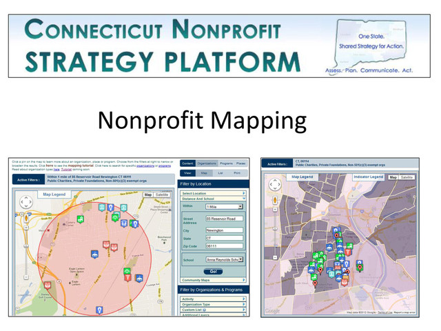 choices are circled in red. The space in the rectangle shows you the current filters and settings for the map. (By default, the map shows all types of nonprofits registered with the IRS including 501(c )(3) public charities, private foundations and other nonprofits like trade associations, social or recreational clubs, and (c )(4) , which may be focused on issue advocacy or other activities. Click on the map legend to see what the different icons show.