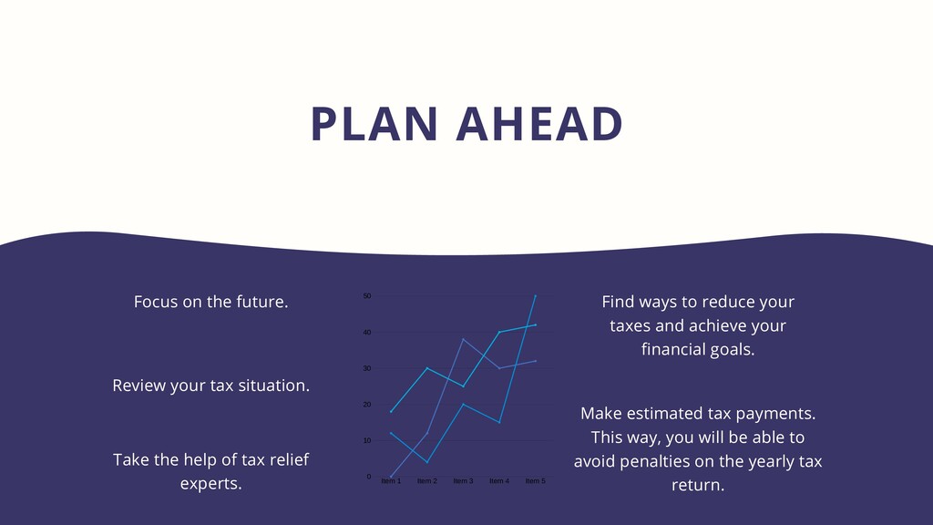 Find ways to reduce your taxes and achieve your financial goals. Take the help of tax relief experts. Make estimated tax payments. This way, you will be able to avoid penalties on the yearly tax return. Item 1 Item 2 Item 3 Item 4 Item 5 50 40 30 20 10 0