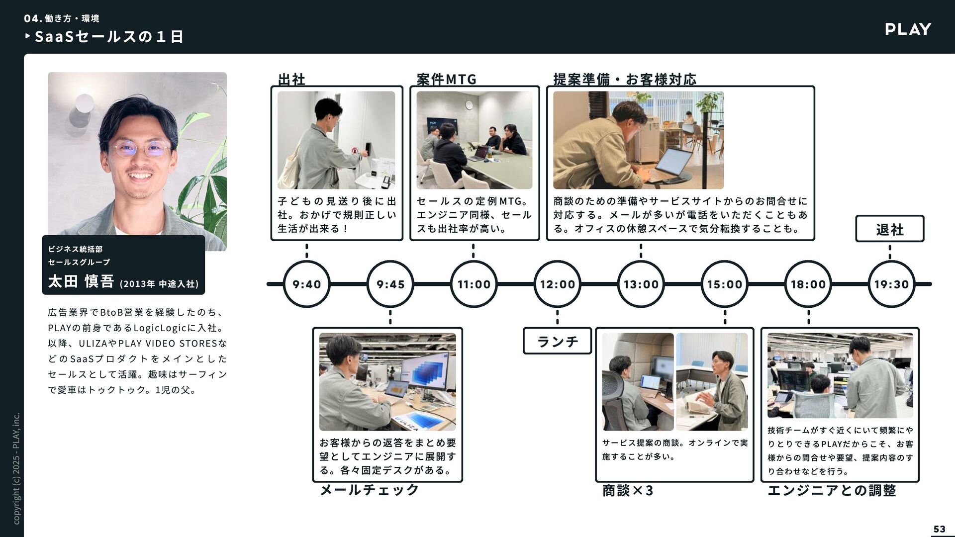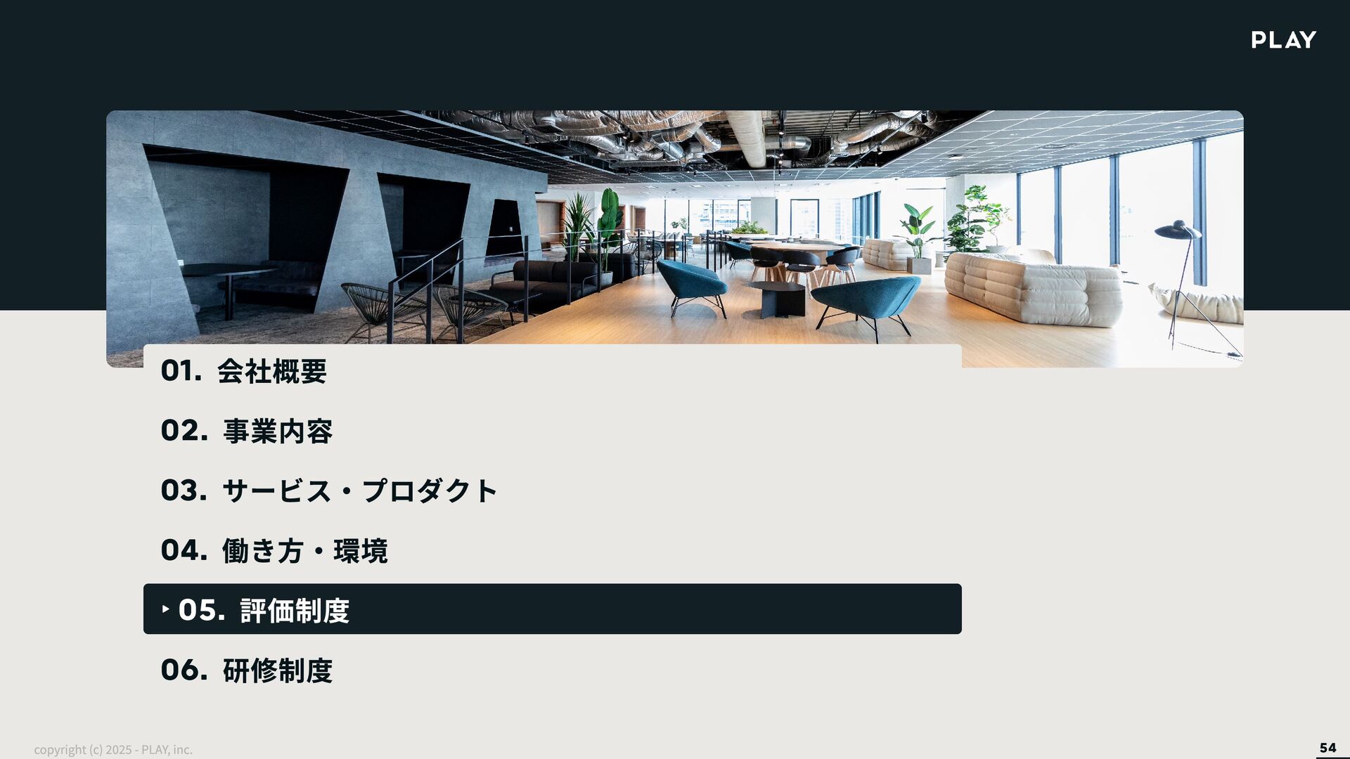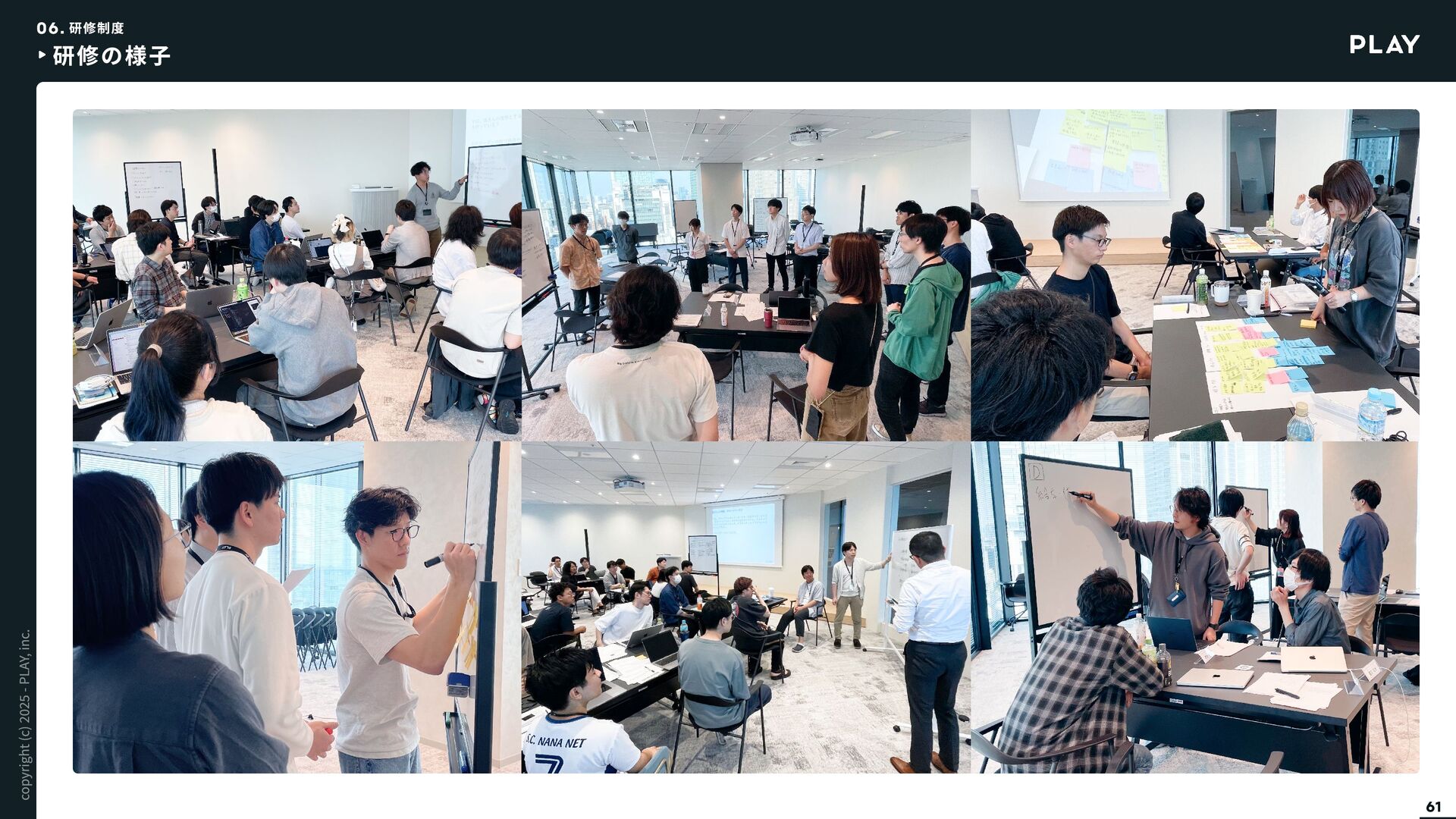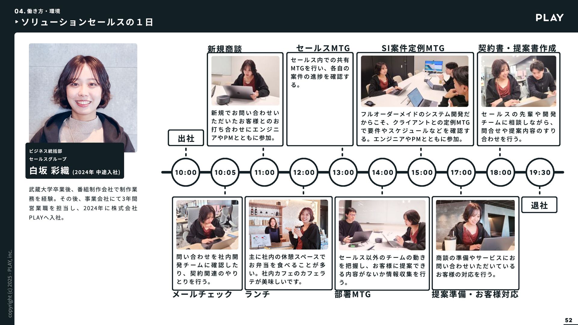 ・ 補 助 金 copyright (c) 2025 - PLAY, inc. 49 結婚祝金 30,000円 従業員が結婚した際に支給 出産祝金 10,000円 従業員が出産した際に支給 災害見舞金 上限 100,000円 本人の住居または同居親族の住居が天変地異により災害にあった際に支給 入社時転居補助金 上限 200,000円 転居を伴う入社の場合、引越し運送費用を補助 ※新卒入社社員のみ対象 健康診断費用補助 全額 健康診断や人間ドッグに加え、肺CTや脳MR、婦人科健診など法定を上回る健診を全額負担 人材紹介一時金 500,000円 人材を紹介し入社に至った際、紹介した社員に対し支給 項目 金額 条件等 その他、社員をサポートする福利厚生も充実しています。 ※具体的な内容や条件については面接時にお尋ねください。