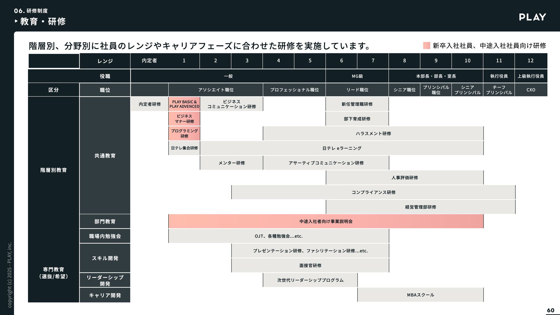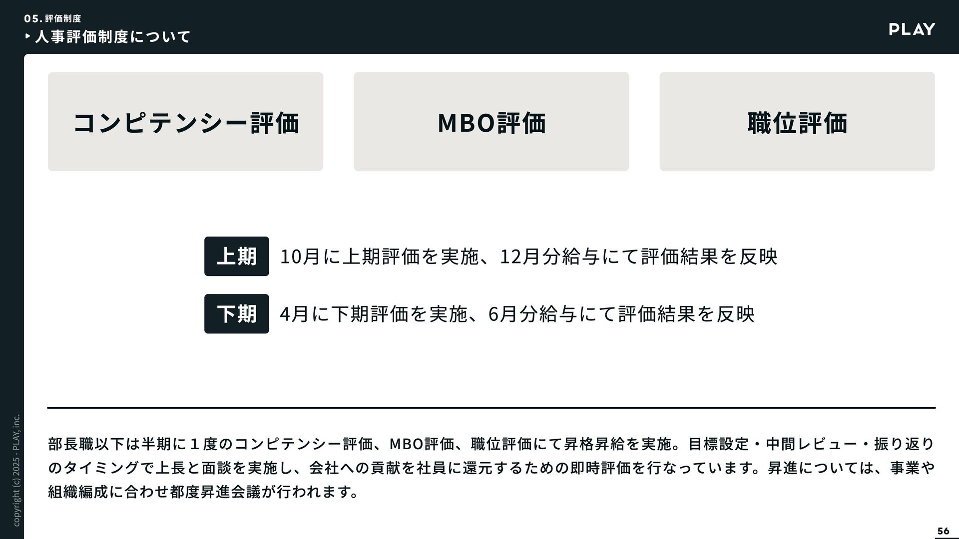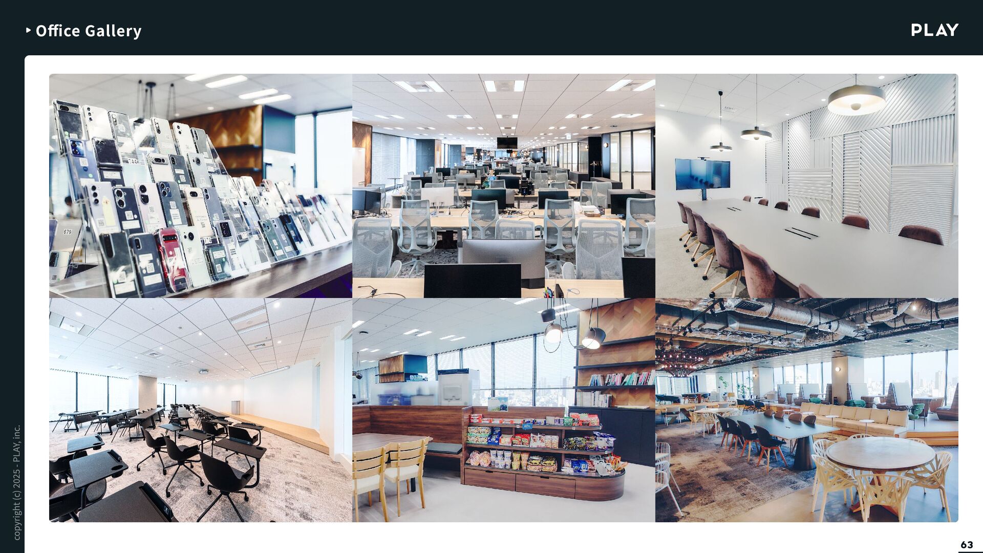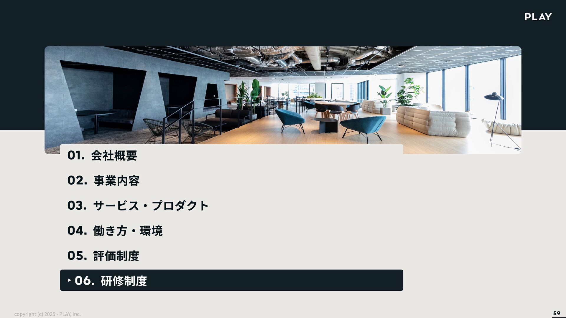 ・ 補 助 金 copyright (c) 2025 - PLAY, inc. 49 結婚祝金 30,000円 従業員が結婚した際に支給 出産祝金 10,000円 従業員が出産した際に支給 災害見舞金 上限 100,000円 本人の住居または同居親族の住居が天変地異により災害にあった際に支給 入社時転居補助金 上限 200,000円 転居を伴う入社の場合、引越し運送費用を補助 ※新卒入社社員のみ対象 健康診断費用補助 全額 健康診断や人間ドッグに加え、肺CTや脳MR、婦人科健診など法定を上回る健診を全額負担 人材紹介一時金 500,000円 人材を紹介し入社に至った際、紹介した社員に対し支給 項目 金額 条件等 その他、社員をサポートする福利厚生も充実しています。 ※具体的な内容や条件については面接時にお尋ねください。