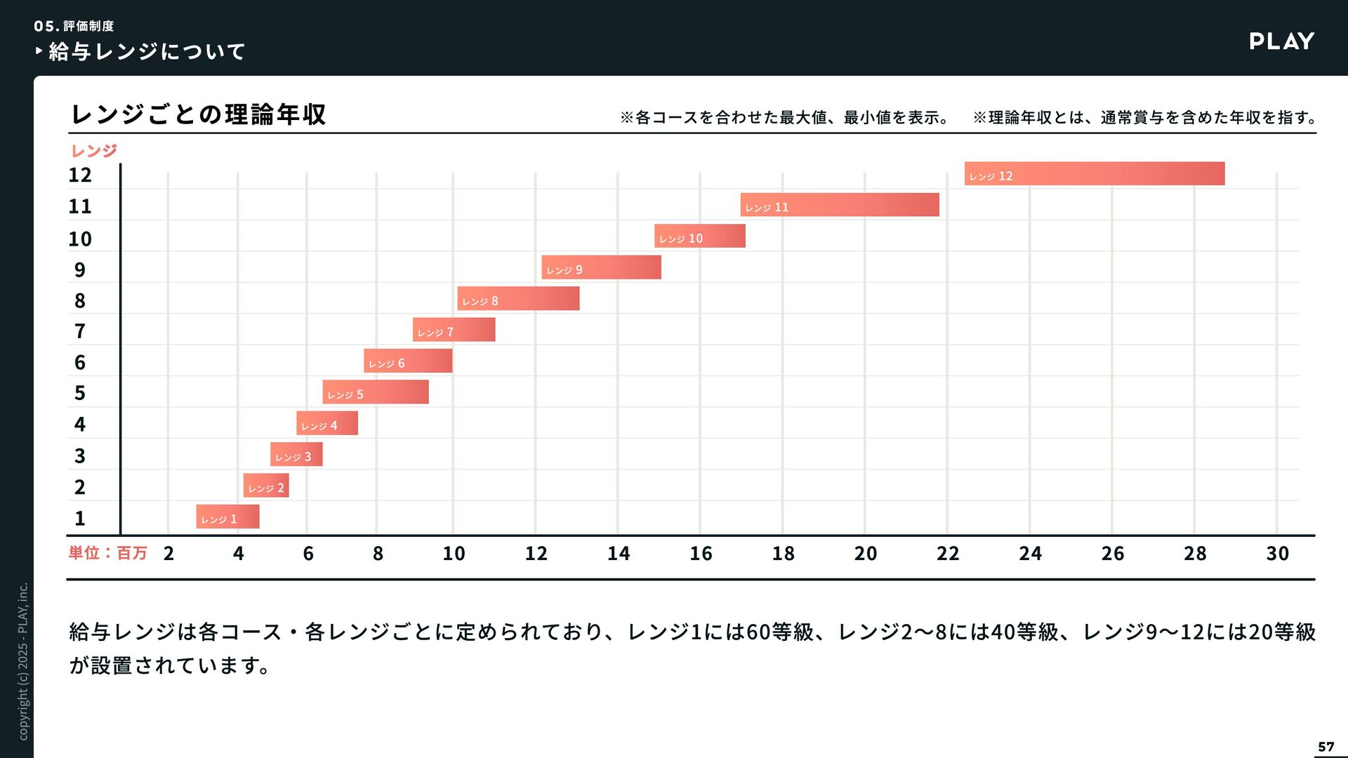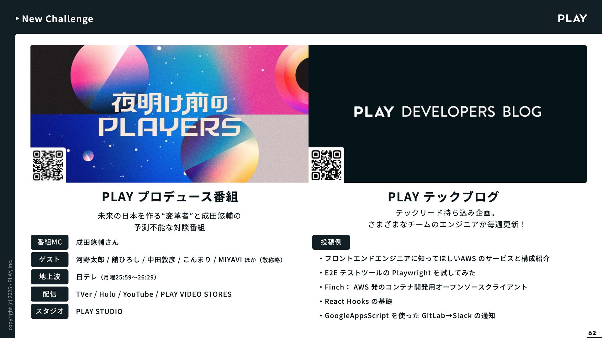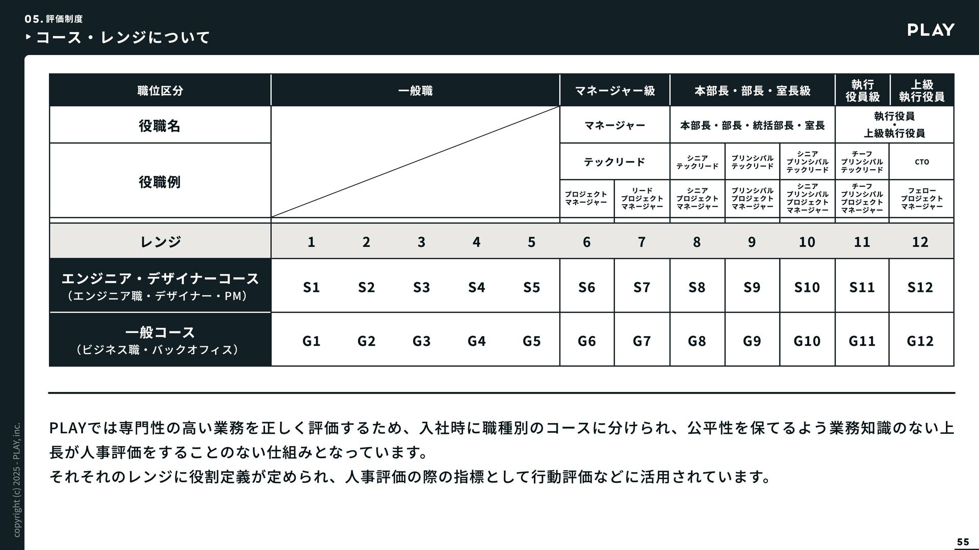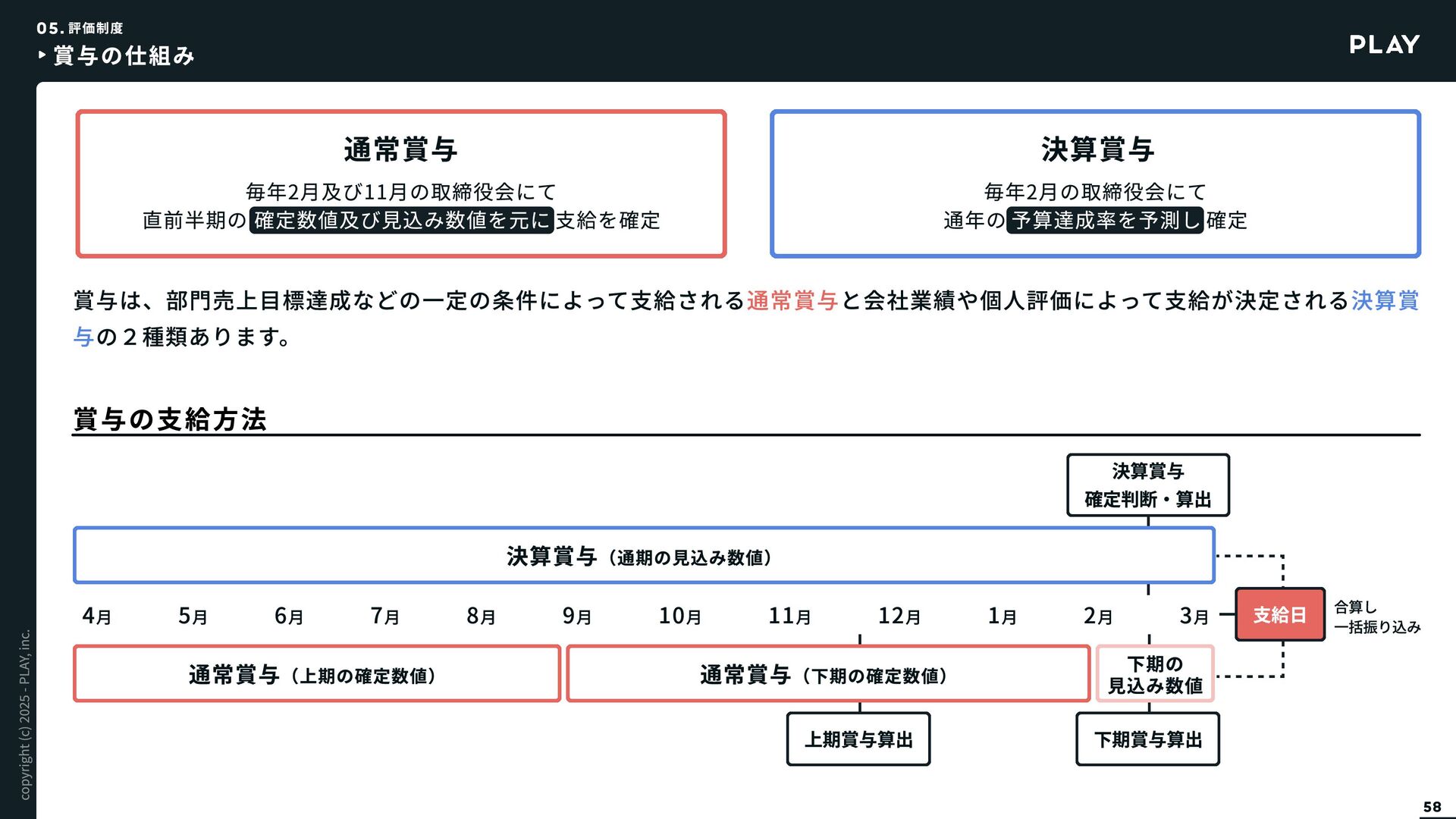 ・ 補 助 金 copyright (c) 2025 - PLAY, inc. 49 結婚祝金 30,000円 従業員が結婚した際に支給 出産祝金 10,000円 従業員が出産した際に支給 災害見舞金 上限 100,000円 本人の住居または同居親族の住居が天変地異により災害にあった際に支給 入社時転居補助金 上限 200,000円 転居を伴う入社の場合、引越し運送費用を補助 ※新卒入社社員のみ対象 健康診断費用補助 全額 健康診断や人間ドッグに加え、肺CTや脳MR、婦人科健診など法定を上回る健診を全額負担 人材紹介一時金 500,000円 人材を紹介し入社に至った際、紹介した社員に対し支給 項目 金額 条件等 その他、社員をサポートする福利厚生も充実しています。 ※具体的な内容や条件については面接時にお尋ねください。