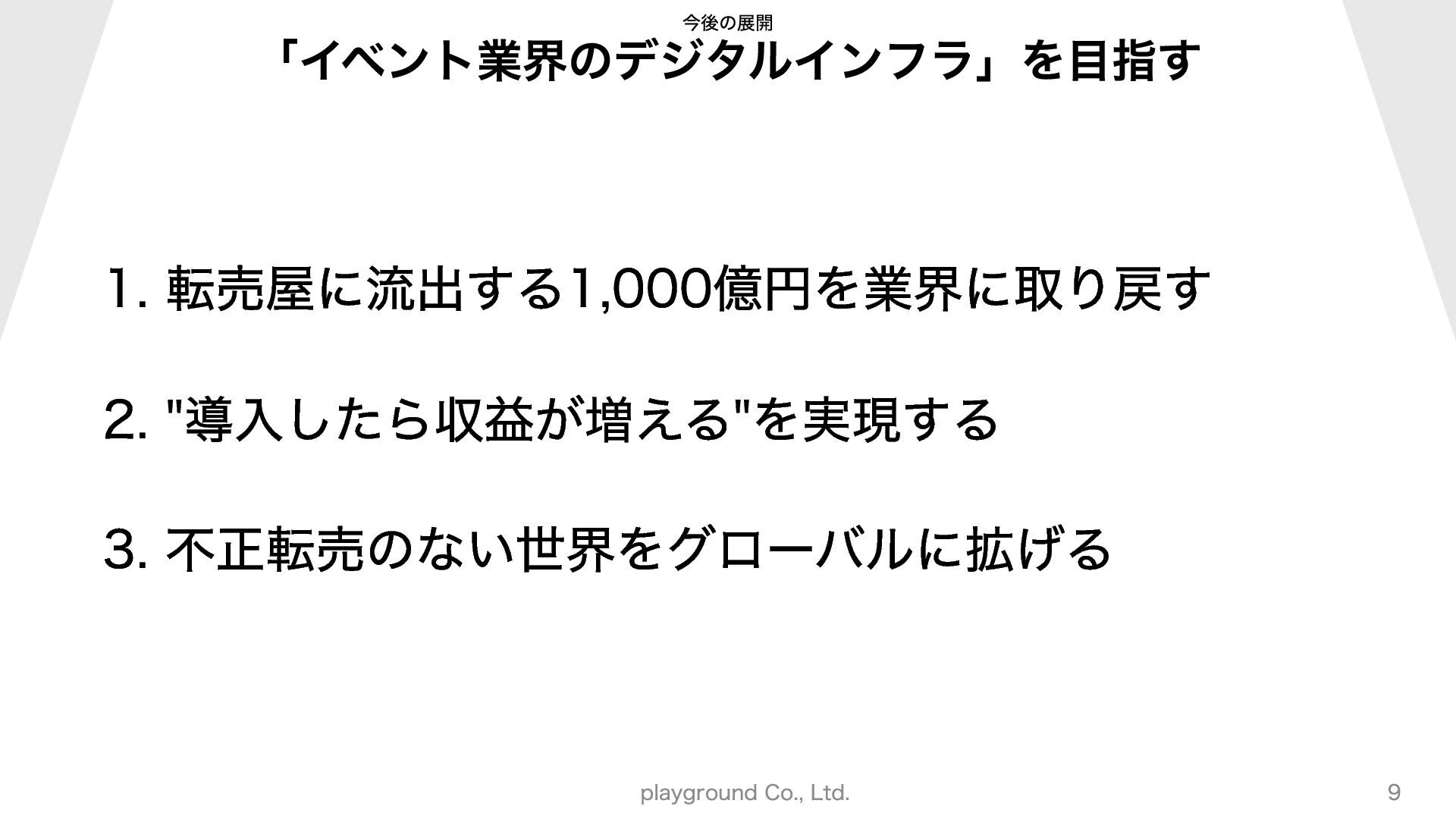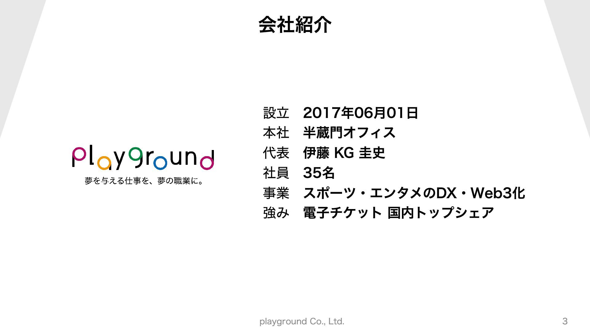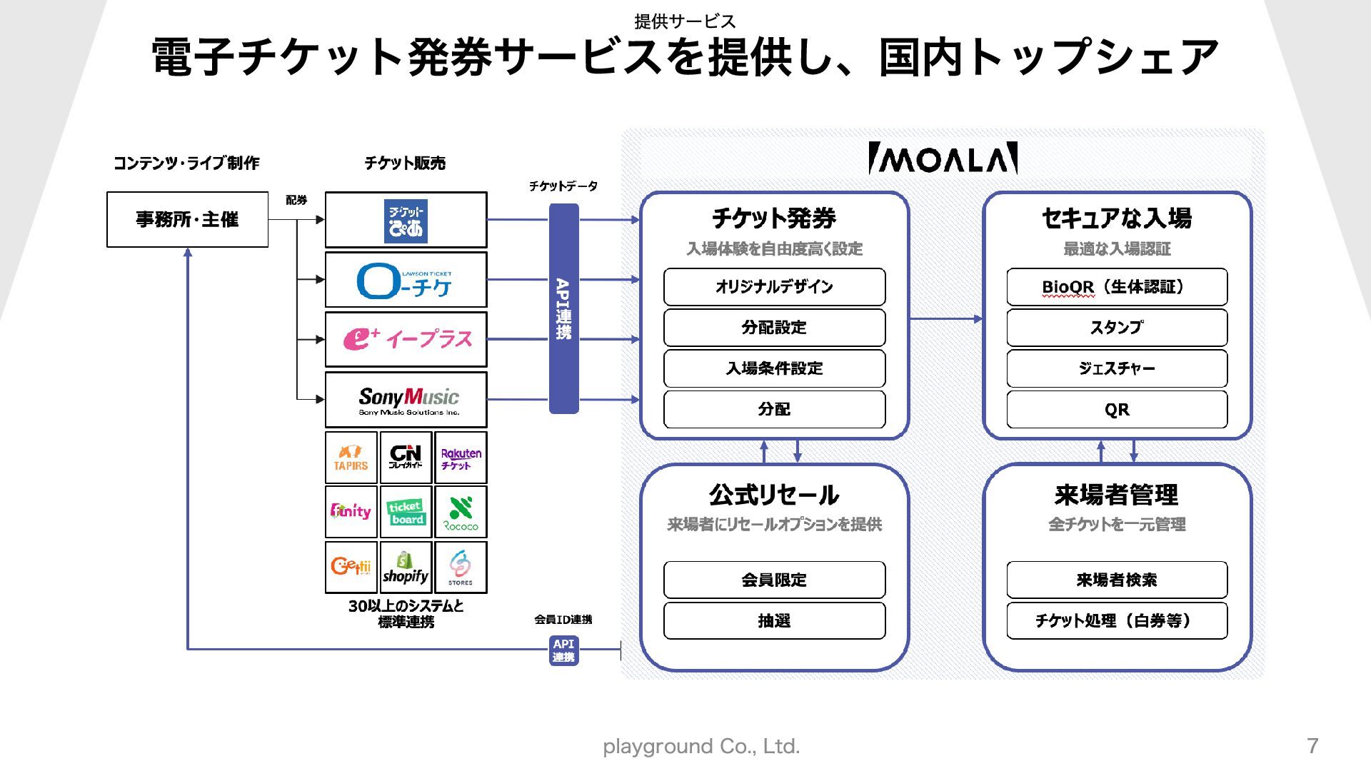 チケットぴあや国内最大級の野外フェス、トップアイドル事務所等、多くのエンタメ企業で標準電子チケット・公式リセールサービスとして採用されている、イベント業界ではおなじみのサービス「MOALA」を提供するplaygroud株式会社の企業説明資料