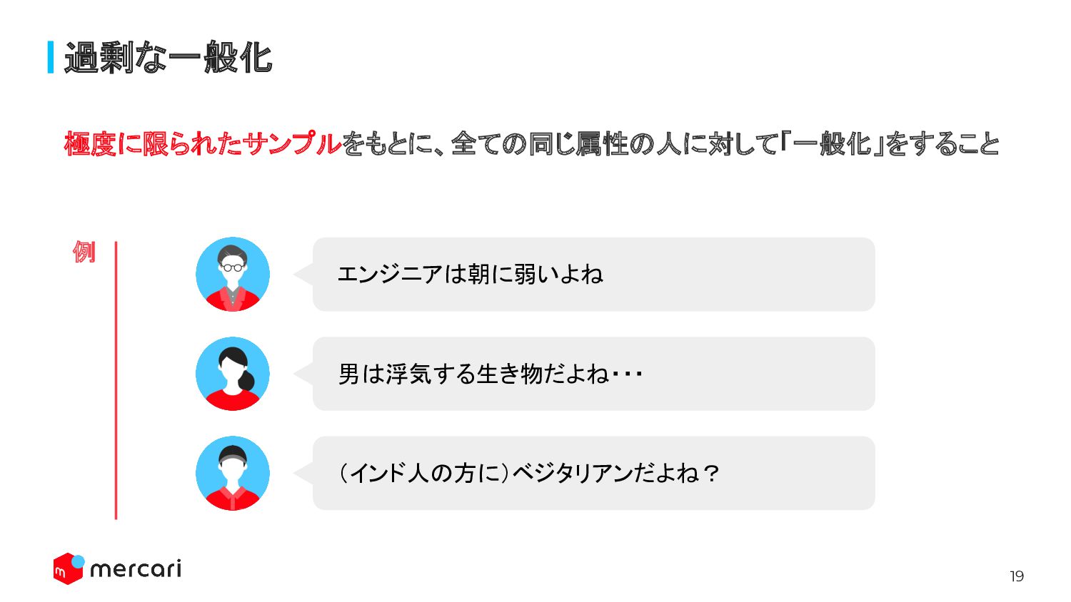 19 過剰な一般化 極度に限られたサンプルをもとに、全ての同じ属性の人に対して「一般化」をすること エンジニアは朝に弱いよね 例 男は浮気する生き物だよね・・・ (インド人の方に)ベジタリアンだよね?