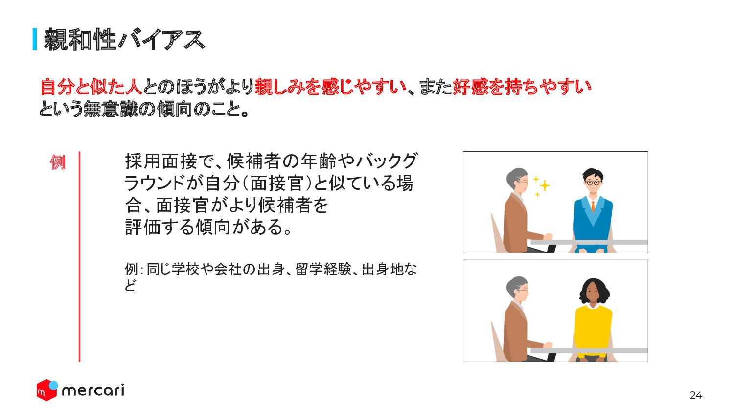 24 親和性バイアス 自分と似た人とのほうがより親しみを感じやすい、また好感を持ちやすい という無意識の傾向のこと。 採用面接で、候補者の年齢やバックグ ラウンドが自分(面接官)と似ている場 合、面接官がより候補者を 評価する傾向がある。 例:同じ学校や会社の出身、留学経験、出身地な ど