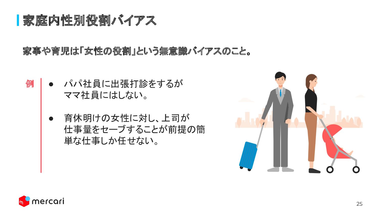 25 家庭内性別役割バイアス • パパ社員に出張打診をするが ママ社員にはしない。 • 育休明けの女性に対し、上司が 仕事量をセーブすることが前提の簡 単な仕事しか任せない。 家事や育児は「女性の役割」という無意識バイアスのこと。