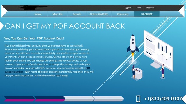 Get Your POF Account Back! If you have deleted your account, then you cannot have its access back. Permanently deleting your account means you do not have the right to entry anymore. You will have to create a completely new profile to regain access to your Plenty Of Fish account and its services. On the other hand, if you have hidden your profile, you can change the settings and recover access to your account. If you are confused about how to change the settings and make your account unhidden, you can call POF’s customer care services by using the POF support number . With round the clock assistance and timely response, they will help you with the process. So dial the number right away! +1(833)409-0107