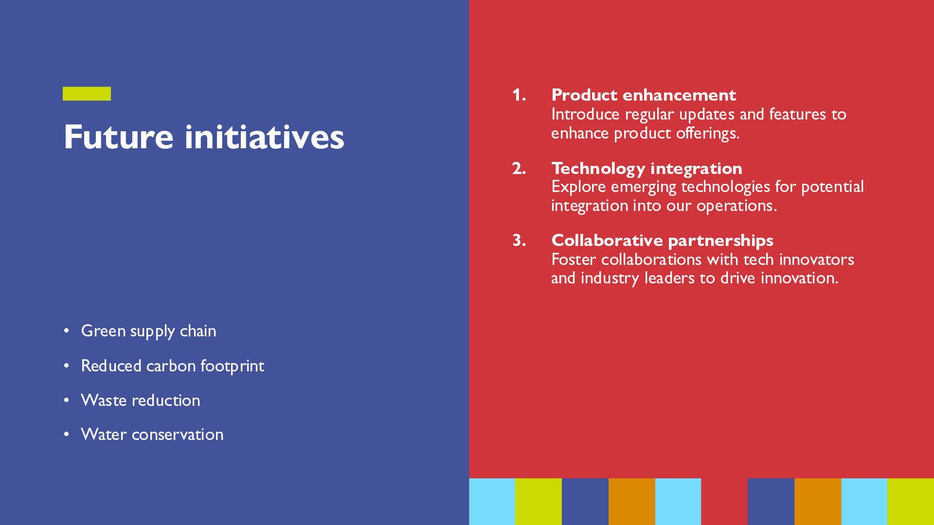 • Waste reduction • Water conservation 1. Product enhancement Introduce regular updates and features to enhance product offerings. 2. Technology integration Explore emerging technologies for potential integration into our operations. 3. Collaborative partnerships Foster collaborations with tech innovators and industry leaders to drive innovation.