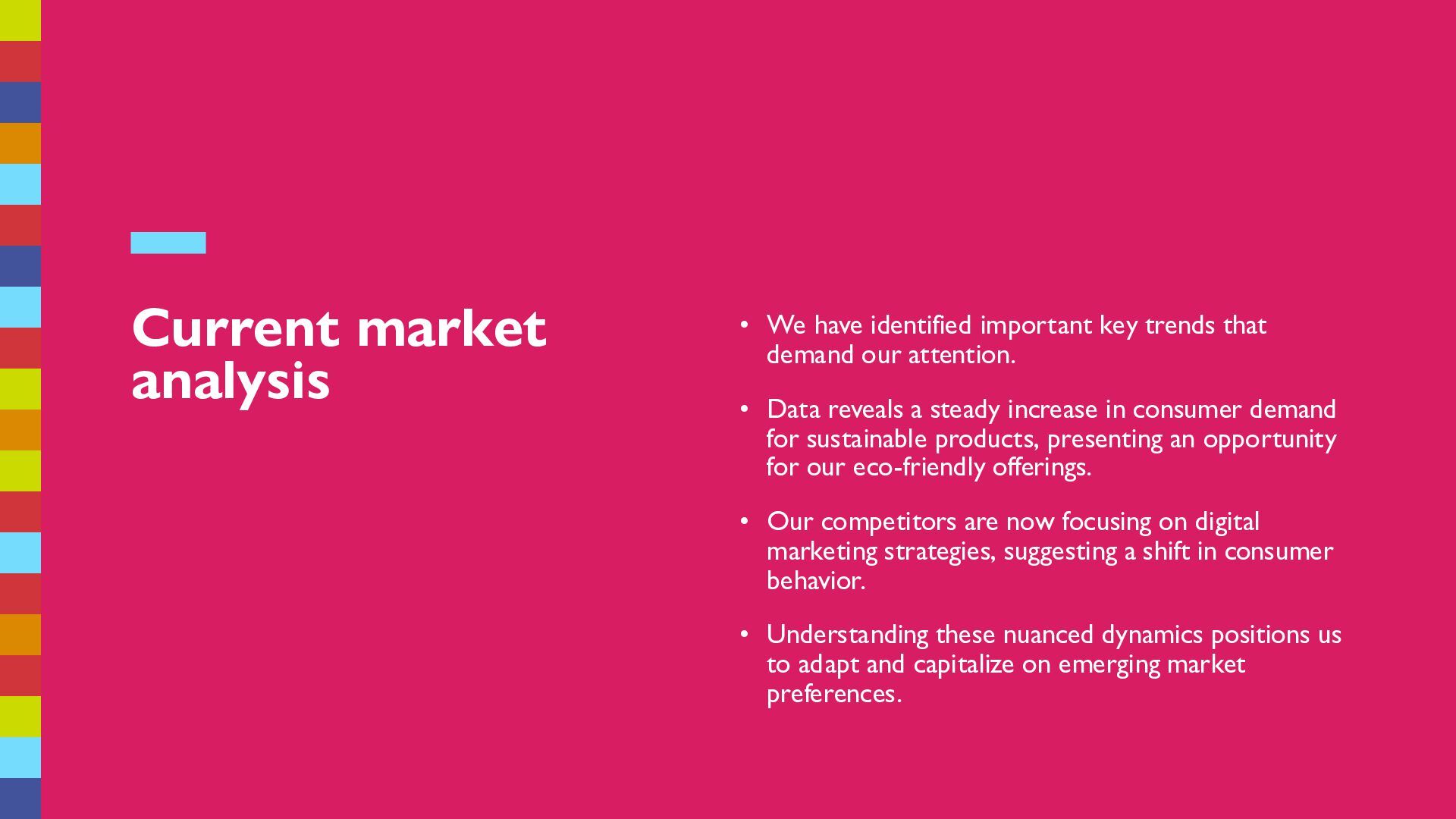that demand our attention. • Data reveals a steady increase in consumer demand for sustainable products, presenting an opportunity for our eco-friendly offerings. • Our competitors are now focusing on digital marketing strategies, suggesting a shift in consumer behavior. • Understanding these nuanced dynamics positions us to adapt and capitalize on emerging market preferences.