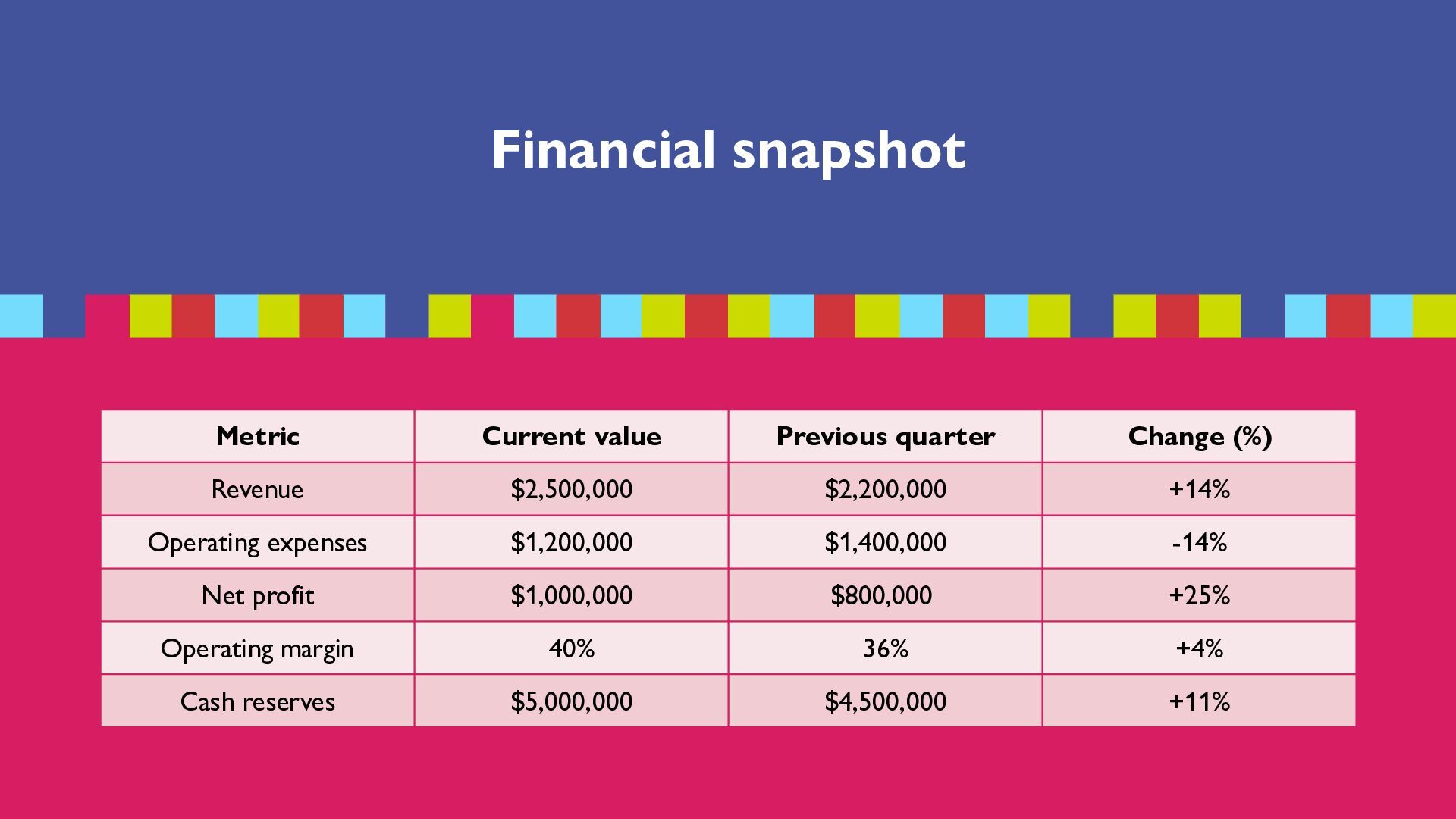 fiscal performance. Key indicators show consistent revenue growth over the past quarter, attributed to strategic cost management and successful marketing. Operating margins have improved, signaling operational efficiency, while strengthening our reserves. This underscores our commitment to financial stability, positioning us for sustained growth.