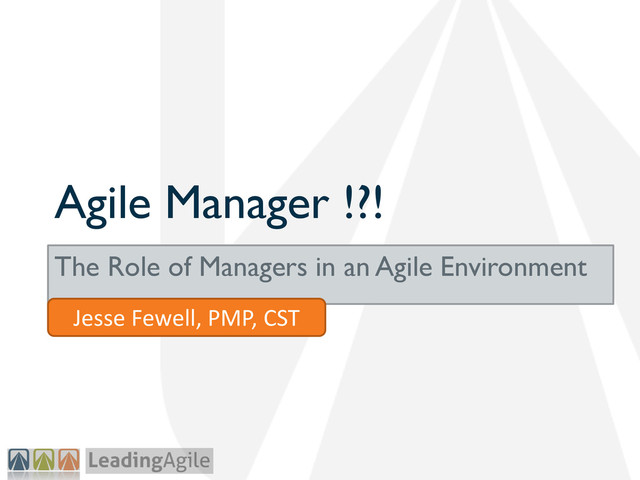 Many are concerned about the compatibility of managers and agile methods. Does a move to self-organizing teams would make managers redundant? How can PMI endorse any methodology that do not define a project manager role? In this talk, PMI Agile pioneer Jesse Fewell will survey the roles described in various agile methods and show you where you fit in. Whether vice-president, project manager, or director, come learn how management makes agile better or worse. Presented in Agile Brazil 2013