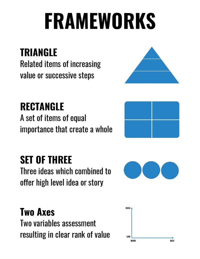RECTANGLE A set of items of equal importance that create a whole SET OF THREE Three ideas which combined to offer high level idea or story Two Axes Two variables assessment resulting in clear rank of value