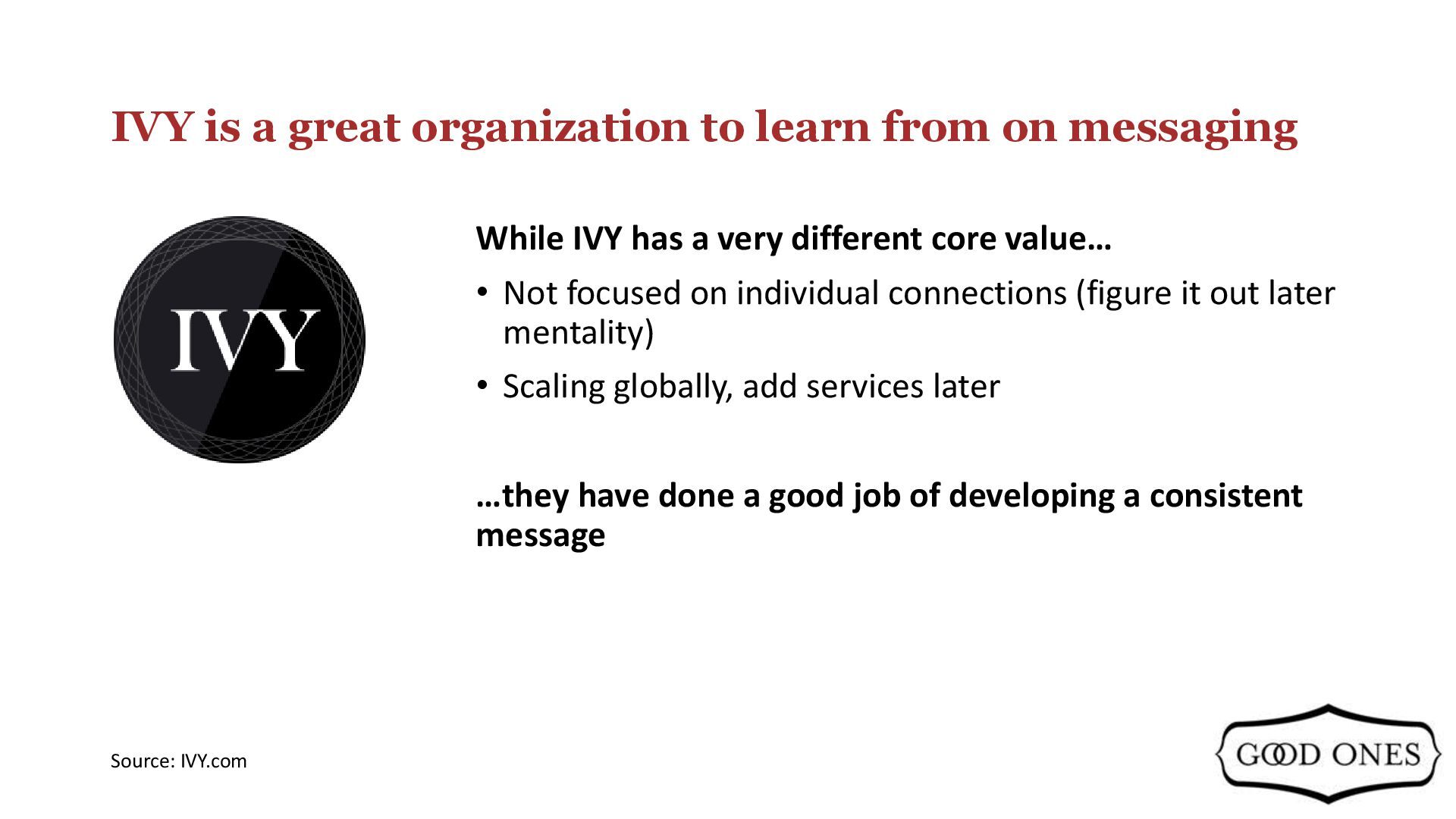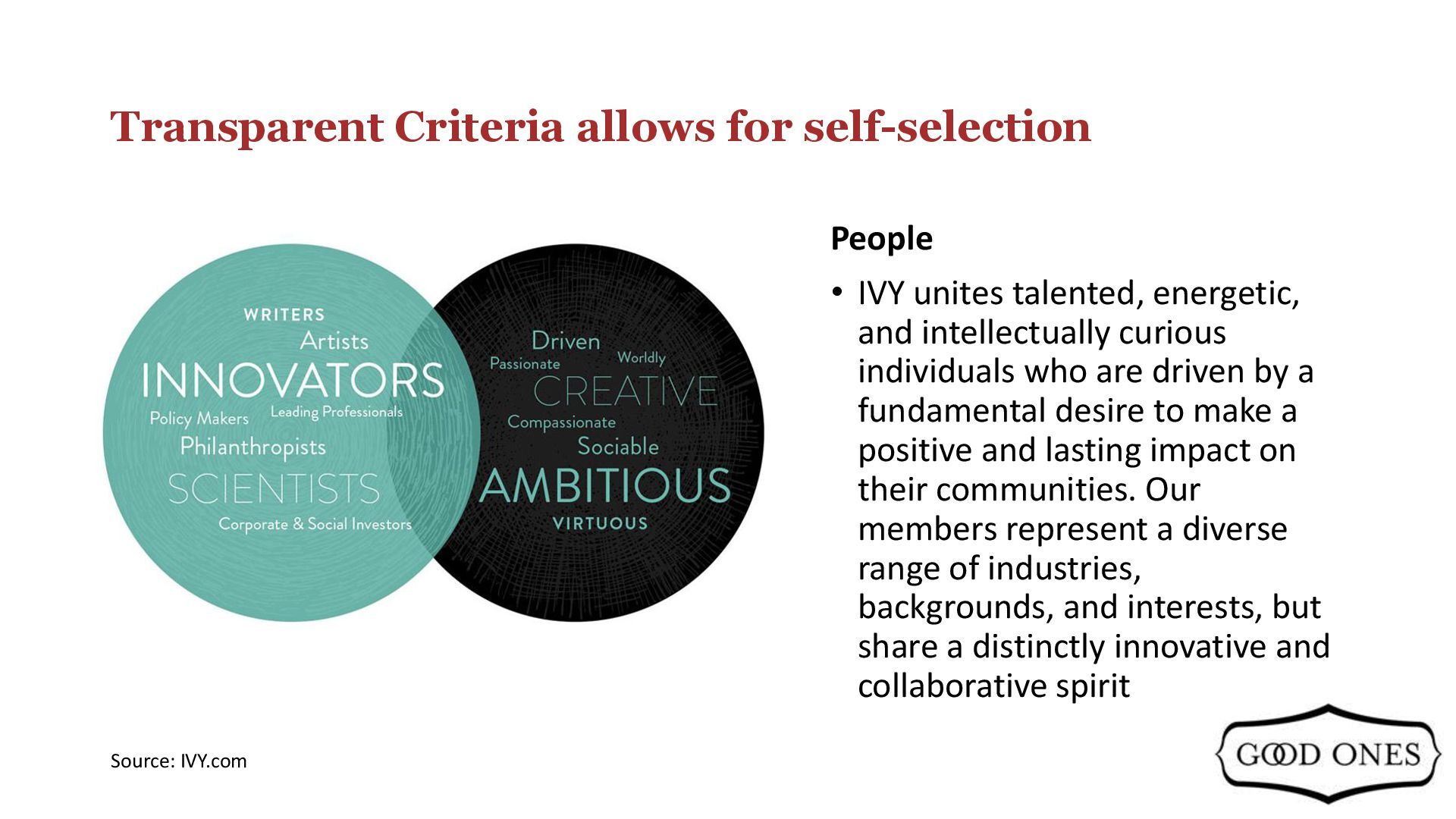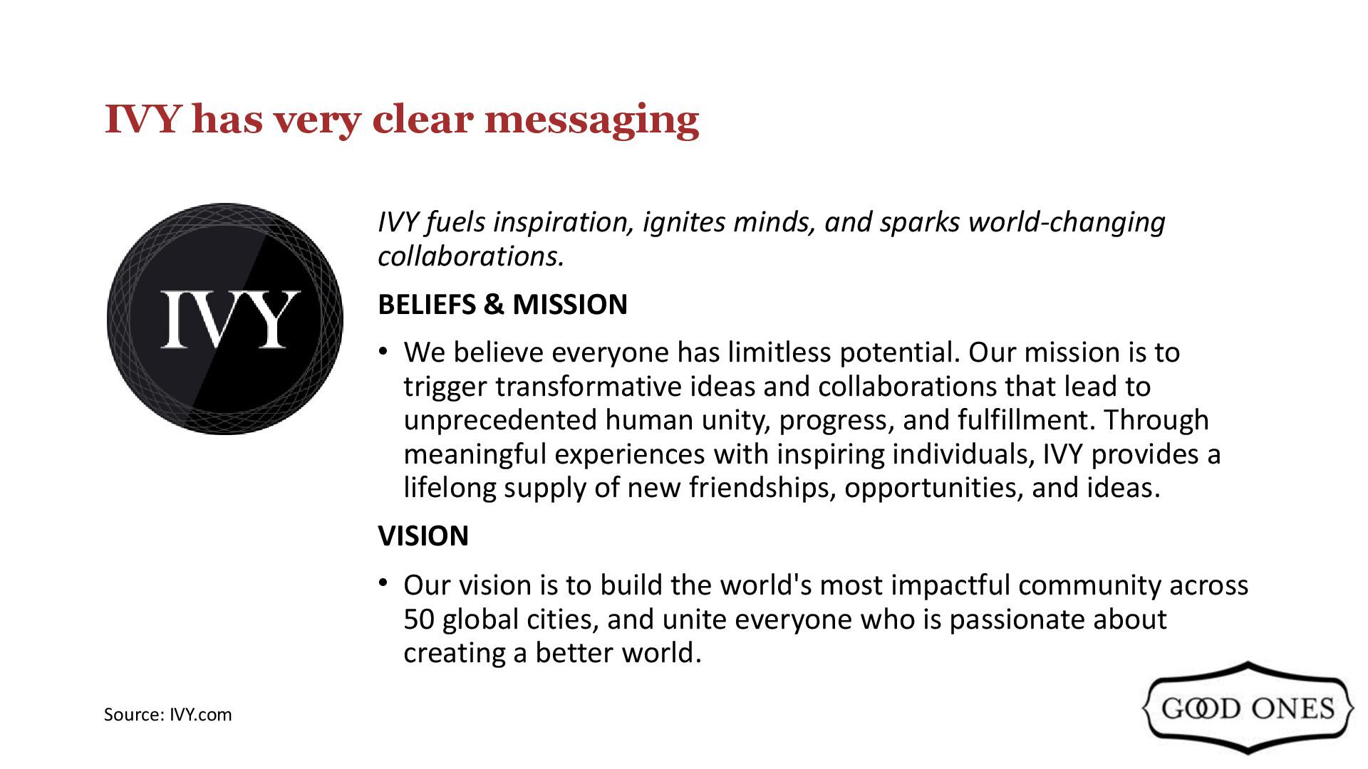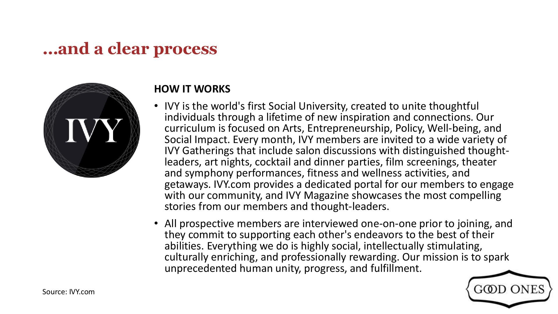 the world's first Social University, created to unite thoughtful individuals through a lifetime of new inspiration and connections. Our curriculum is focused on Arts, Entrepreneurship, Policy, Well-being, and Social Impact. Every month, IVY members are invited to a wide variety of IVY Gatherings that include salon discussions with distinguished thought- leaders, art nights, cocktail and dinner parties, film screenings, theater and symphony performances, fitness and wellness activities, and getaways. IVY.com provides a dedicated portal for our members to engage with our community, and IVY Magazine showcases the most compelling stories from our members and thought-leaders. • All prospective members are interviewed one-on-one prior to joining, and they commit to supporting each other's endeavors to the best of their abilities. Everything we do is highly social, intellectually stimulating, culturally enriching, and professionally rewarding. Our mission is to spark unprecedented human unity, progress, and fulfillment. Source: IVY.com