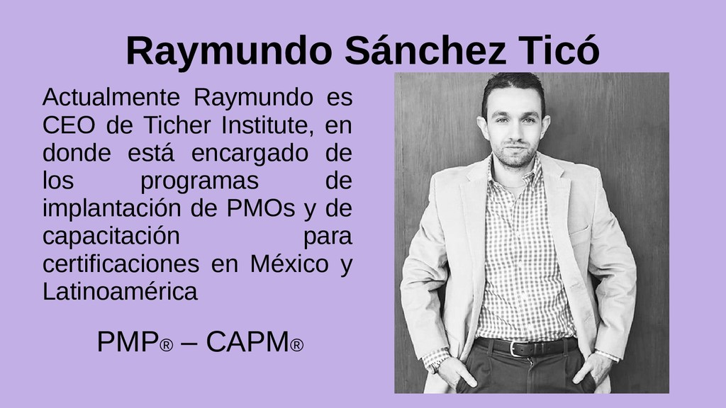 de Proyectos en el ITAM. A la fecha ha capacitado a más de 5,000 ejecutivos e impartido conferencias en la materia en México y Sudamérica. PMP® – CAPM®